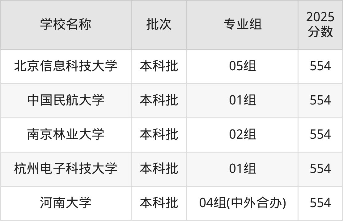 北京高考录取分数线在554分左右的公办大学一共有5所。分别是北京信息科技大学(554分)、中国民航大学(554分)、南京林业大学(554分)