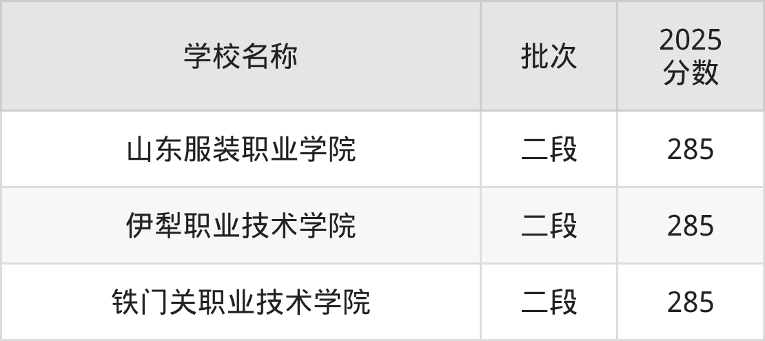 山东高考录取分数线在285分左右的公办大学一共有3所。分别是山东服装职业学院(285分)、伊犁职业技术学院(285分)、铁门关职业技术学院(285分)