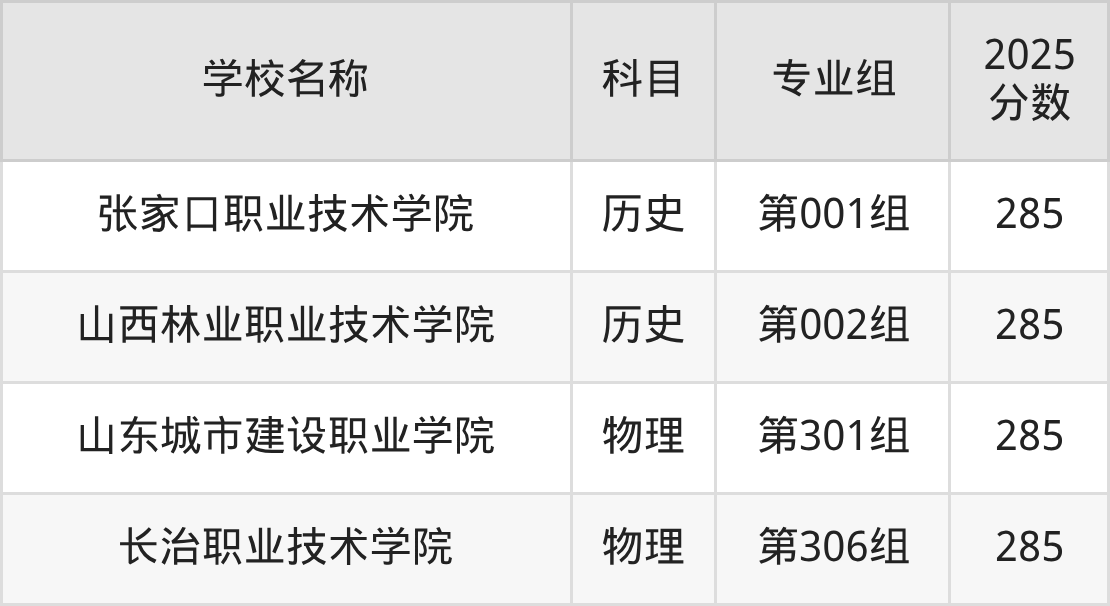 山西高考录取分数线在285分左右的公办院校专业组一共有4个,其中历史组有:张家口职业技术学院(285分)、山西林业职业技术学院(285分),物理组有:山东城市建设职业学院(285分)、长治职业技术学院(285分)。