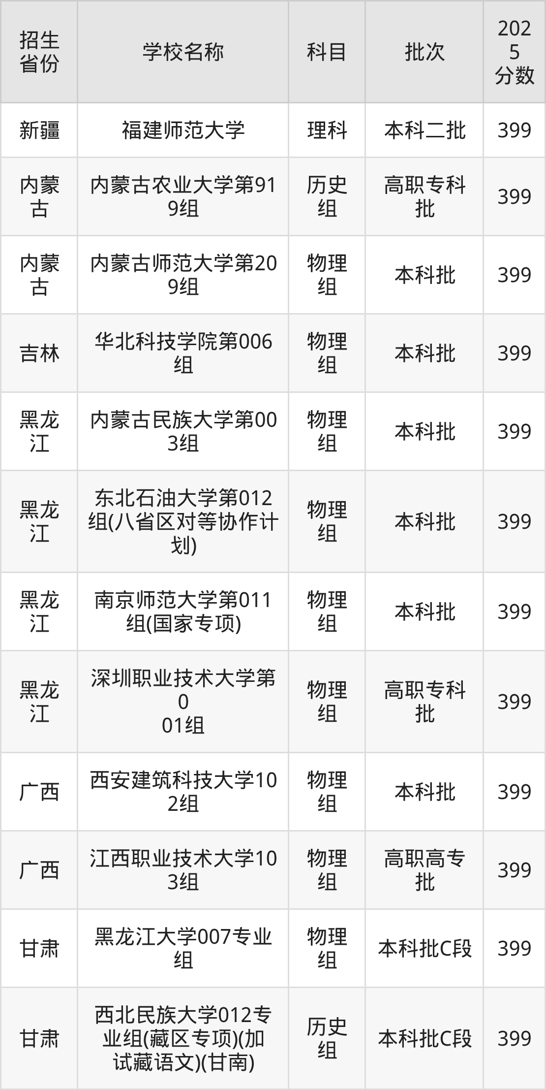 筛选全国各省2025年录取分数线为399分的重点大学如下: