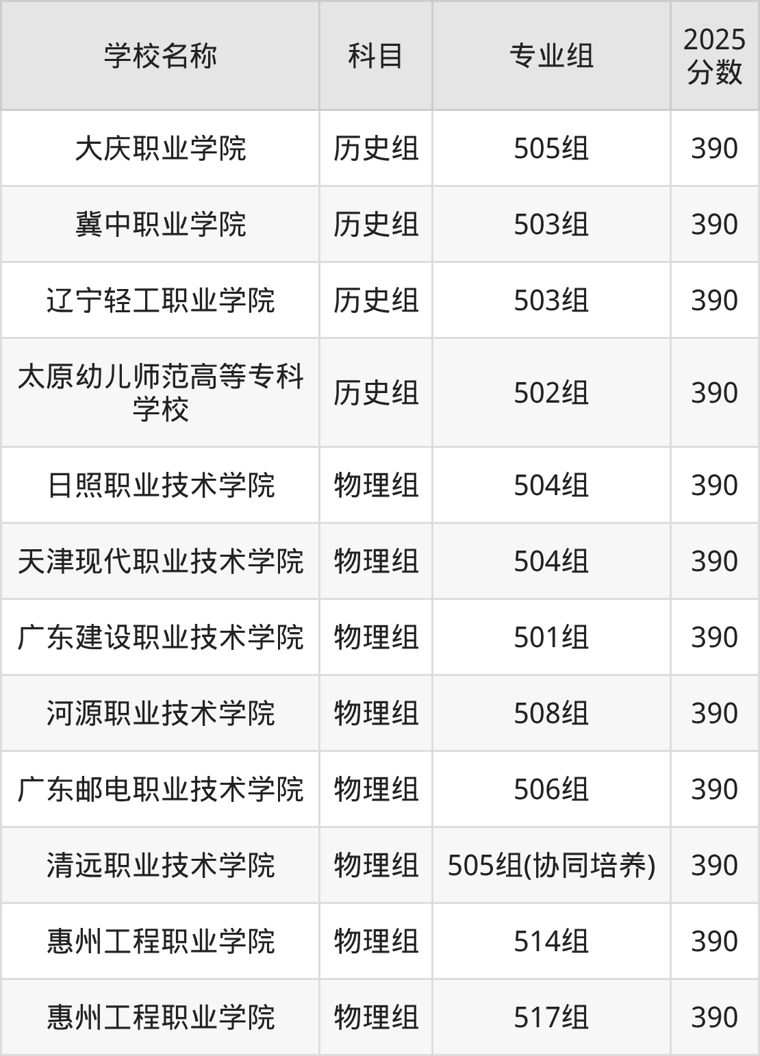 广东高考录取分数线在390分左右的公办院校专业组一共有12个,其中历史组有:大庆职业学院(390分)、冀中职业学院(390分)、辽宁轻工职业学院(390分),物理组有:日照职业技术学院(390分)、天津现代职业技术学院(390分)、广东建设职业技术学院(390分)。