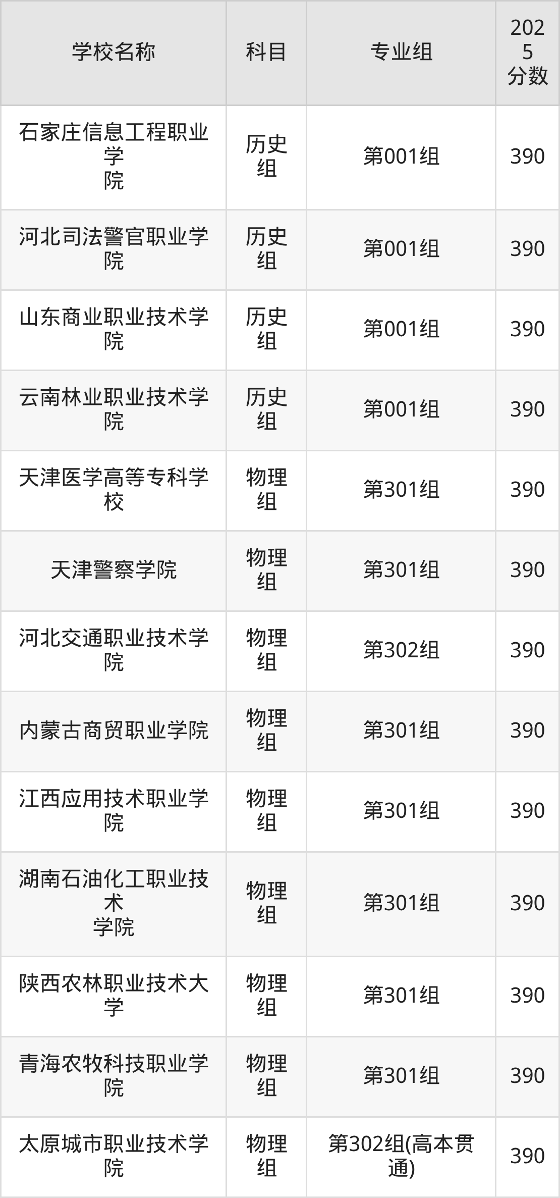 山西高考录取分数线在390分左右的公办院校专业组一共有13个,其中历史组有:石家庄信息工程职业学院(390分)、河北司法警官职业学院(390分)、山东商业职业技术学院(390分),物理组有:天津医学高等专科学校(390分)、天津警察学院(390分)、河北交通职业技术学院(390分)。