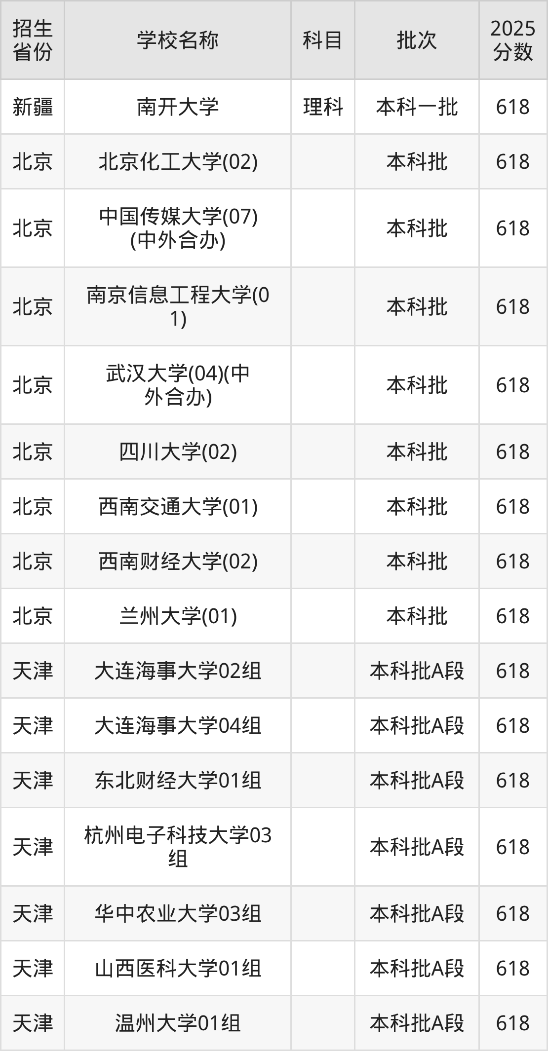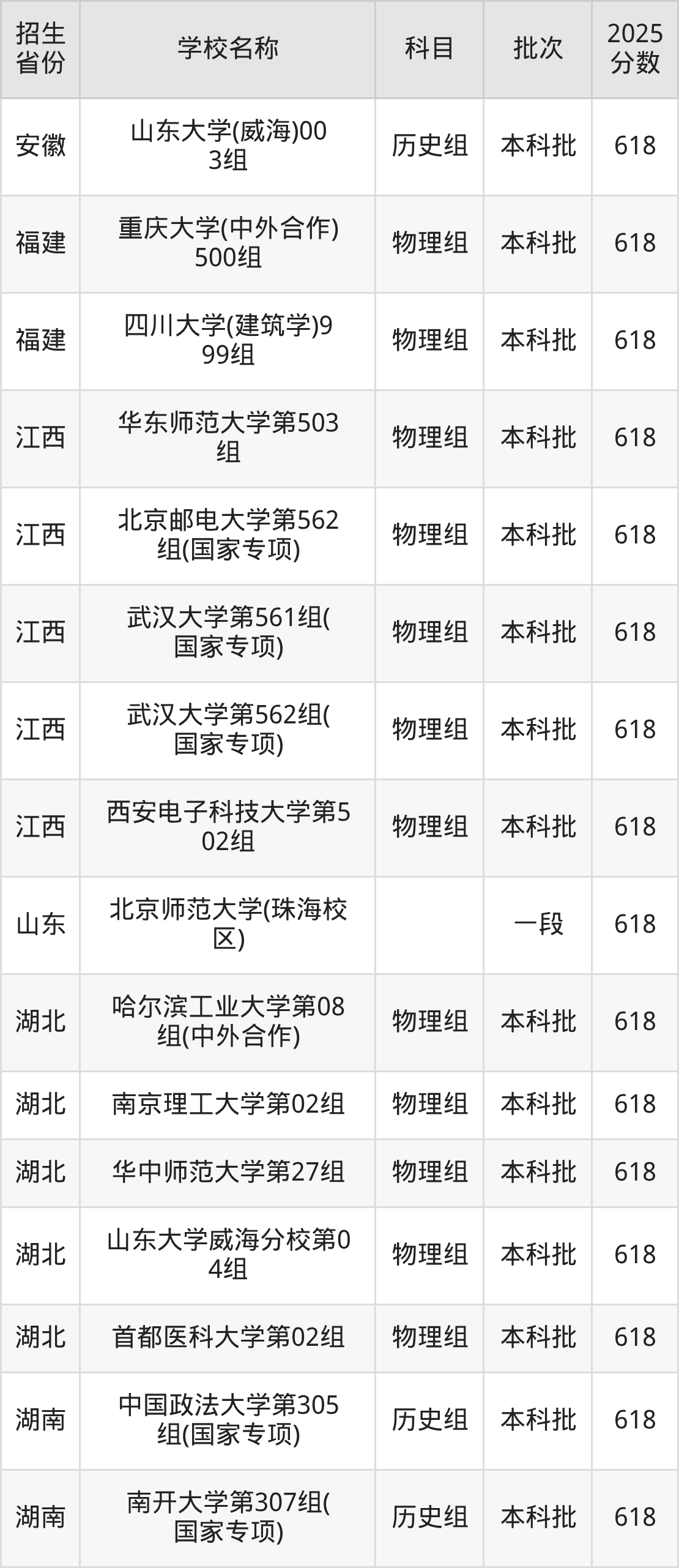 二、各省618分的重点大学名单