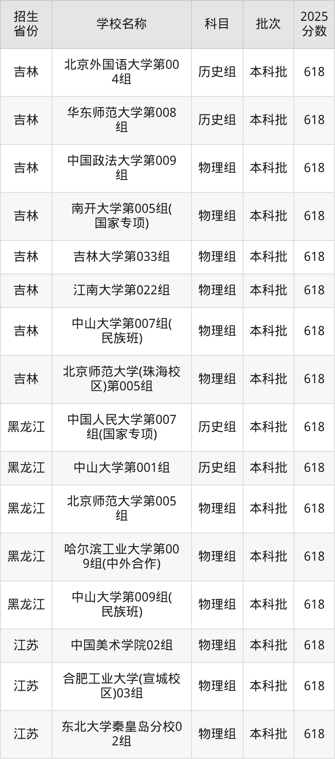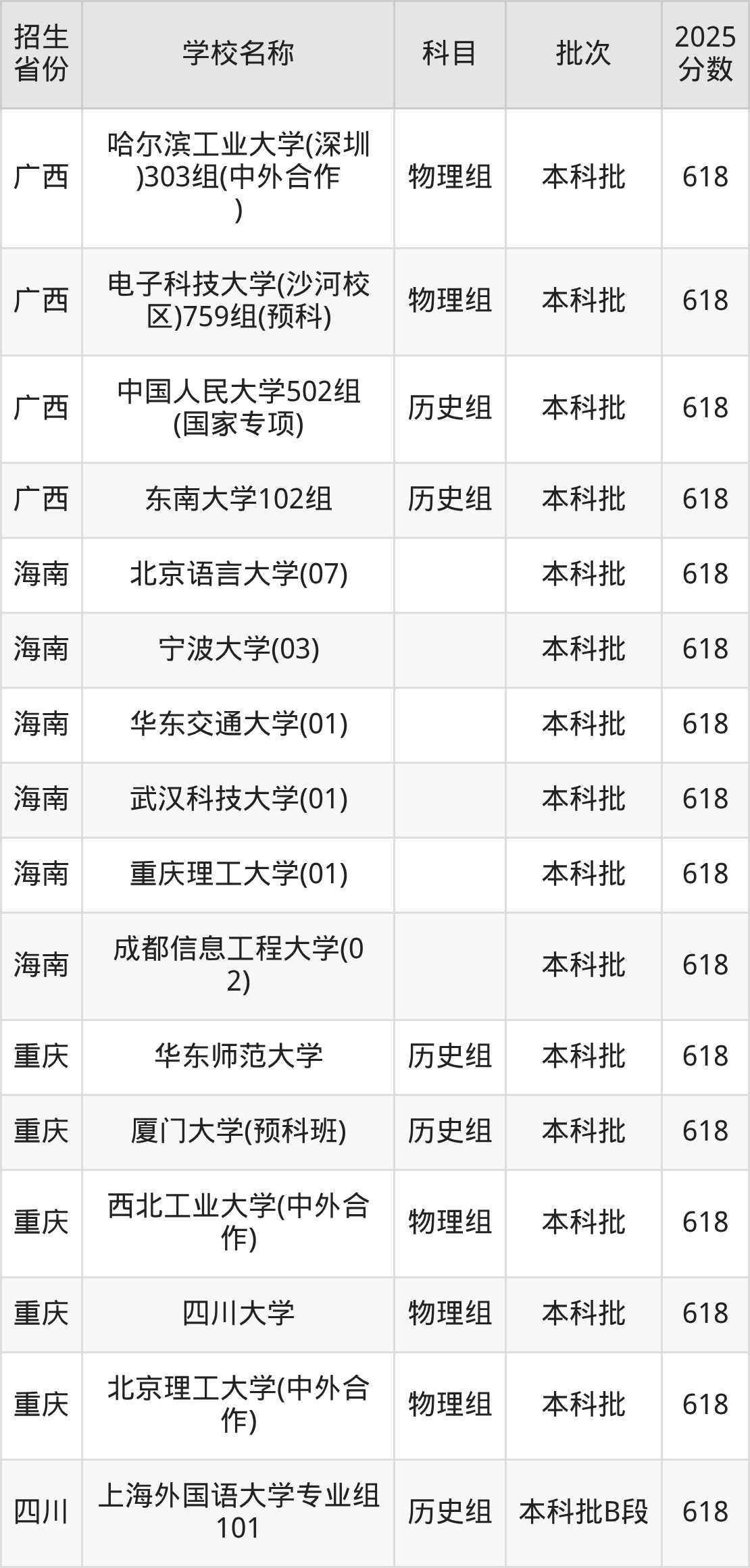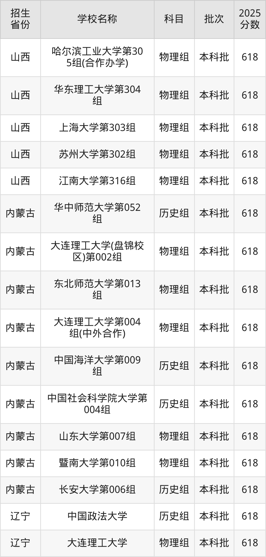 筛选全国各省2025年录取分数线为618分的重点大学如下: