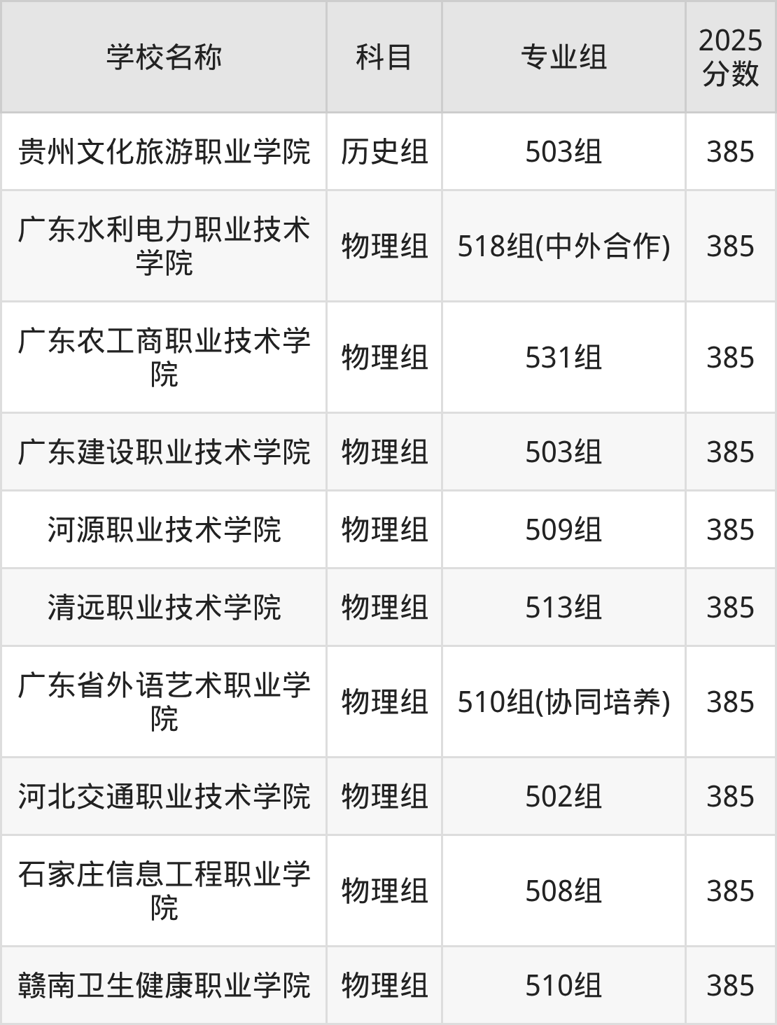 广东高考录取分数线在385分左右的公办院校专业组一共有10个,其中历史组有:贵州文化旅游职业学院(385分),物理组有:广东水利电力职业技术学院(385分)、广东农工商职业技术学院(385分)、广东建设职业技术学院(385分)。