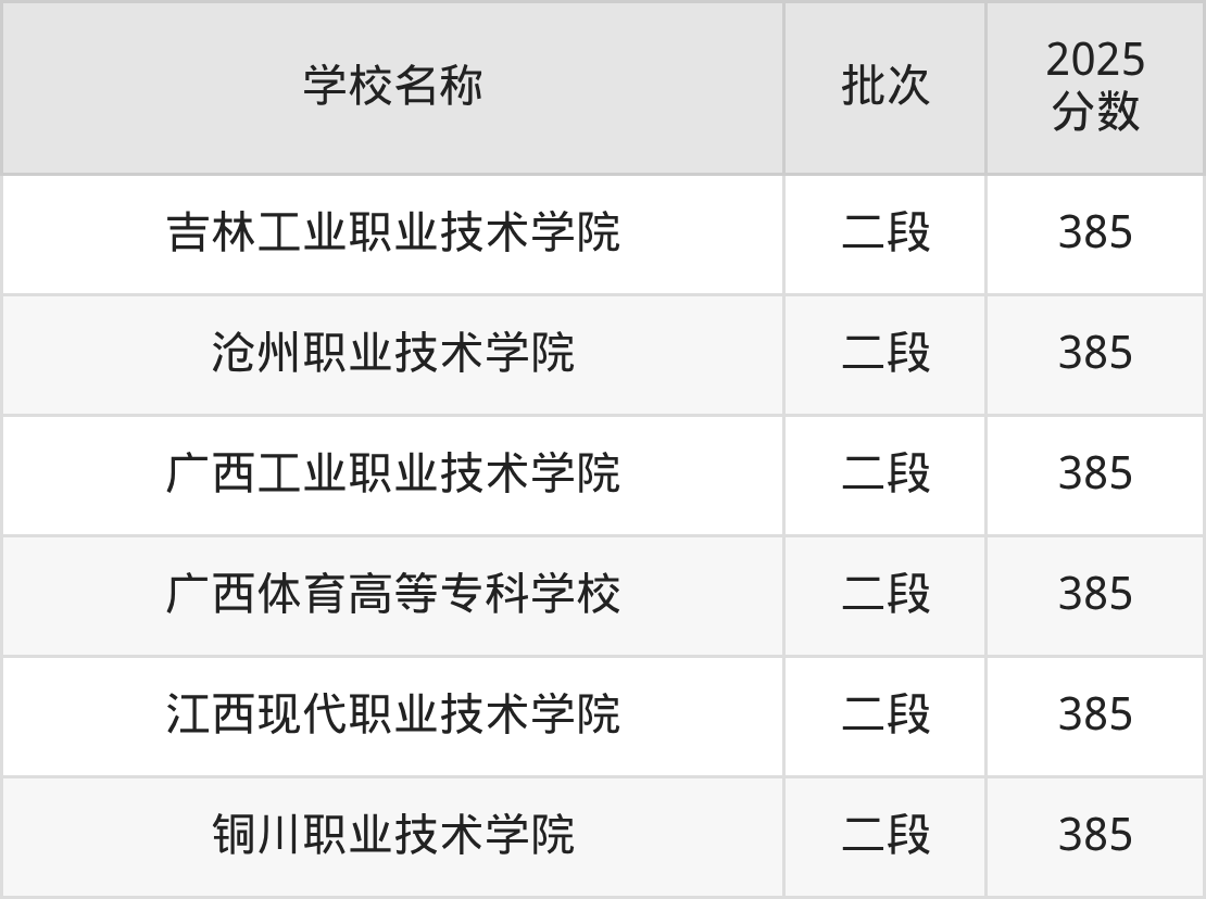 山东高考录取分数线在385分左右的公办大学一共有6所。分别是吉林工业职业技术学院(385分)、沧州职业技术学院(385分)、广西工业职业技术学院(385分)