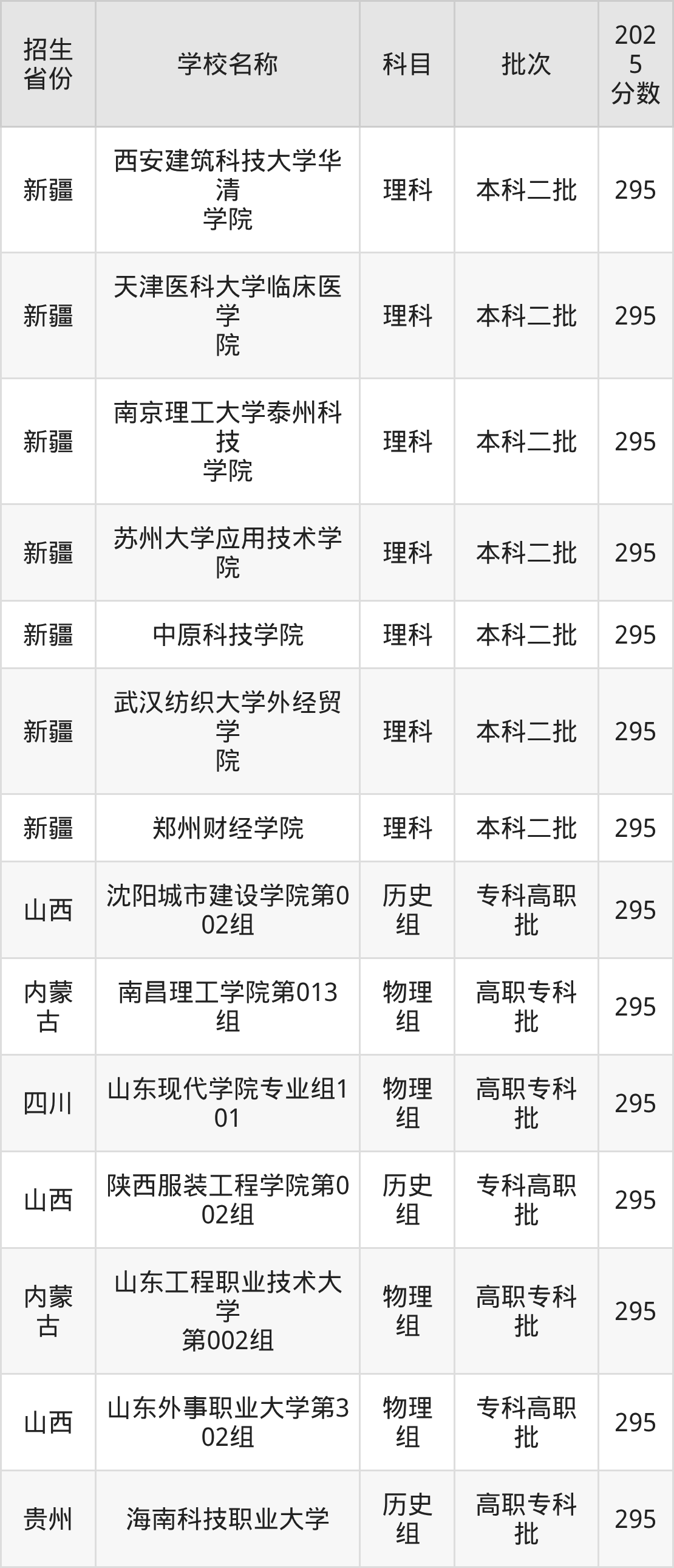 295分可以上的大学有西安建筑科技大学华清学院、天津医科大学临床医学院、南京理工大学泰州科技学院、苏州大学应用技术学院等二本民办大学。本文整理了新疆、山西等全国295分左右的二本民办大学名单,请2026年高考生参考。