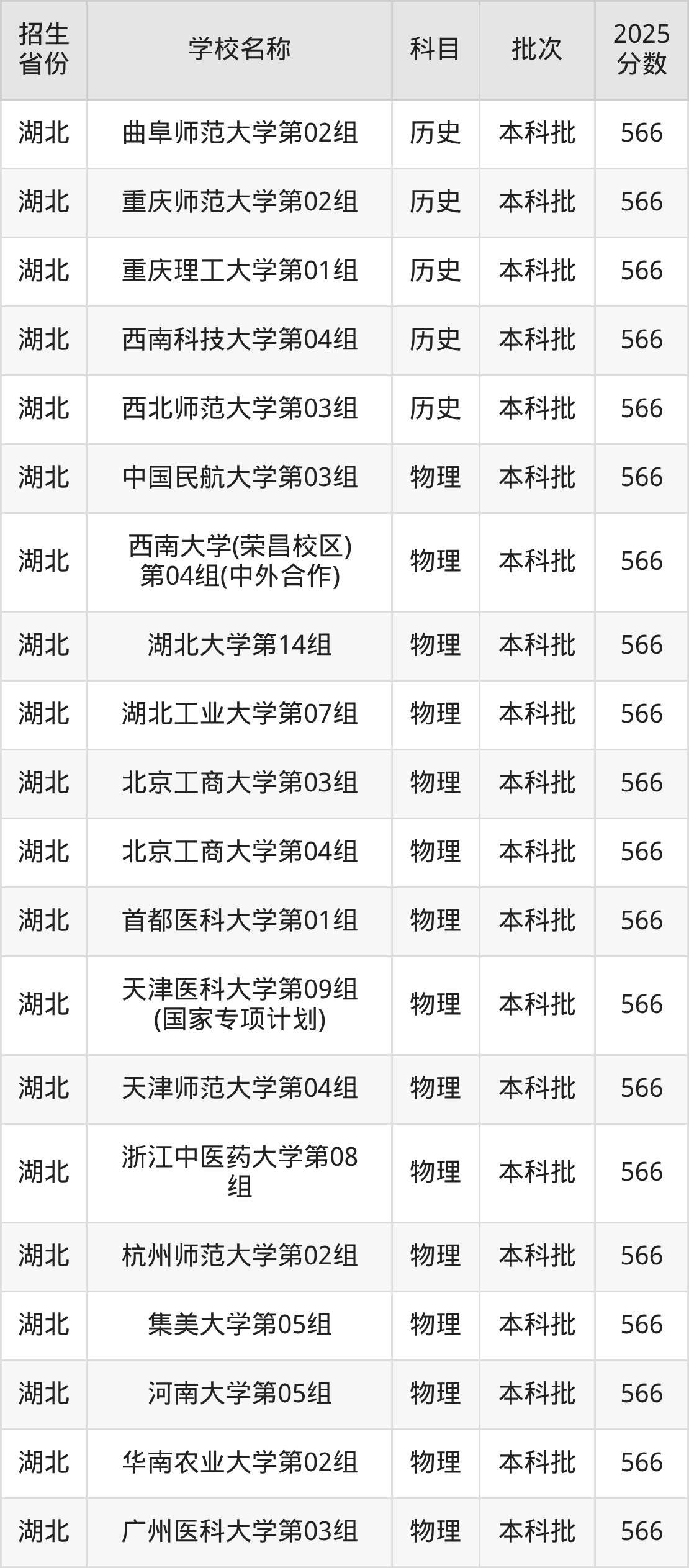 湖北省物理组分数线是566分的重点大学有:中国民航大学、西南大学(荣昌校区)、湖北大学、湖北工业大学、北京工商大学、首都医科大学、天津医科大学、天津师范大学、浙江中医药大学、杭州师范大学。