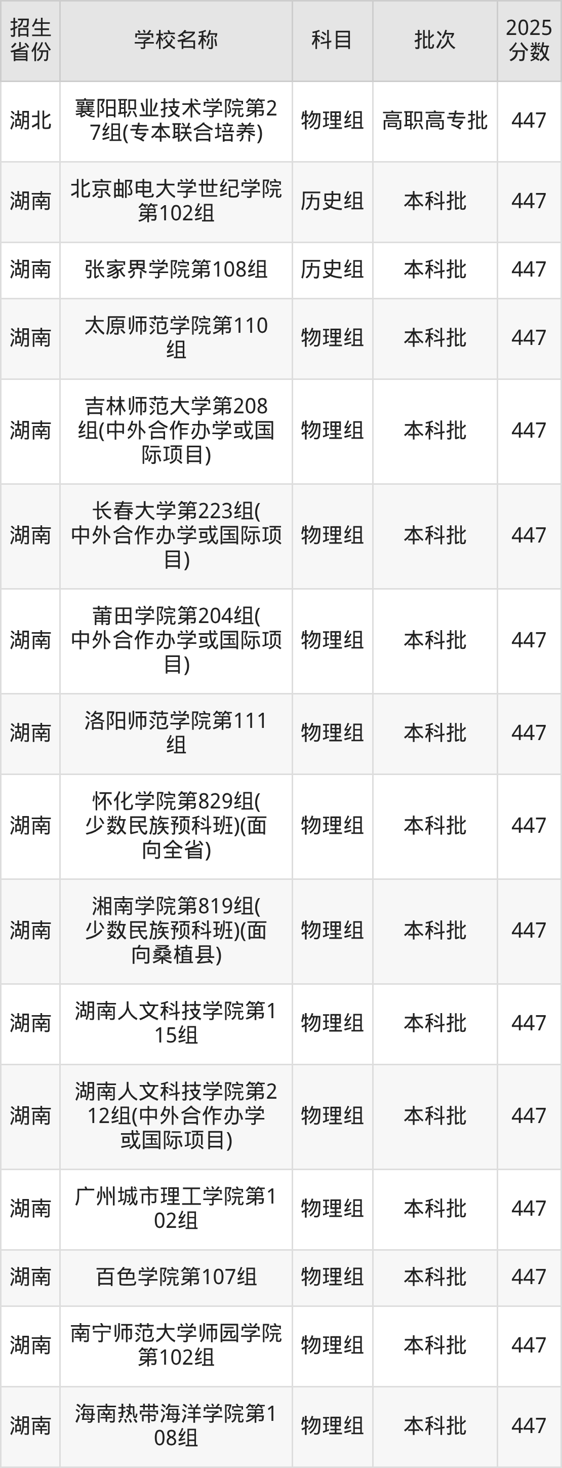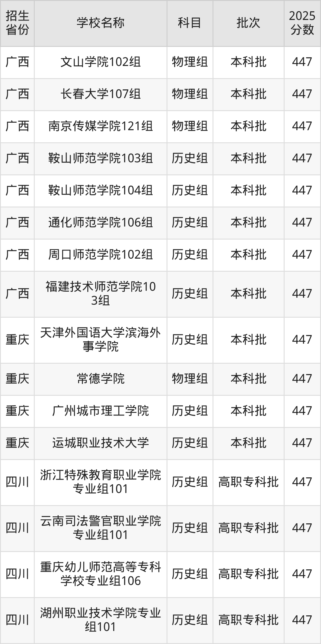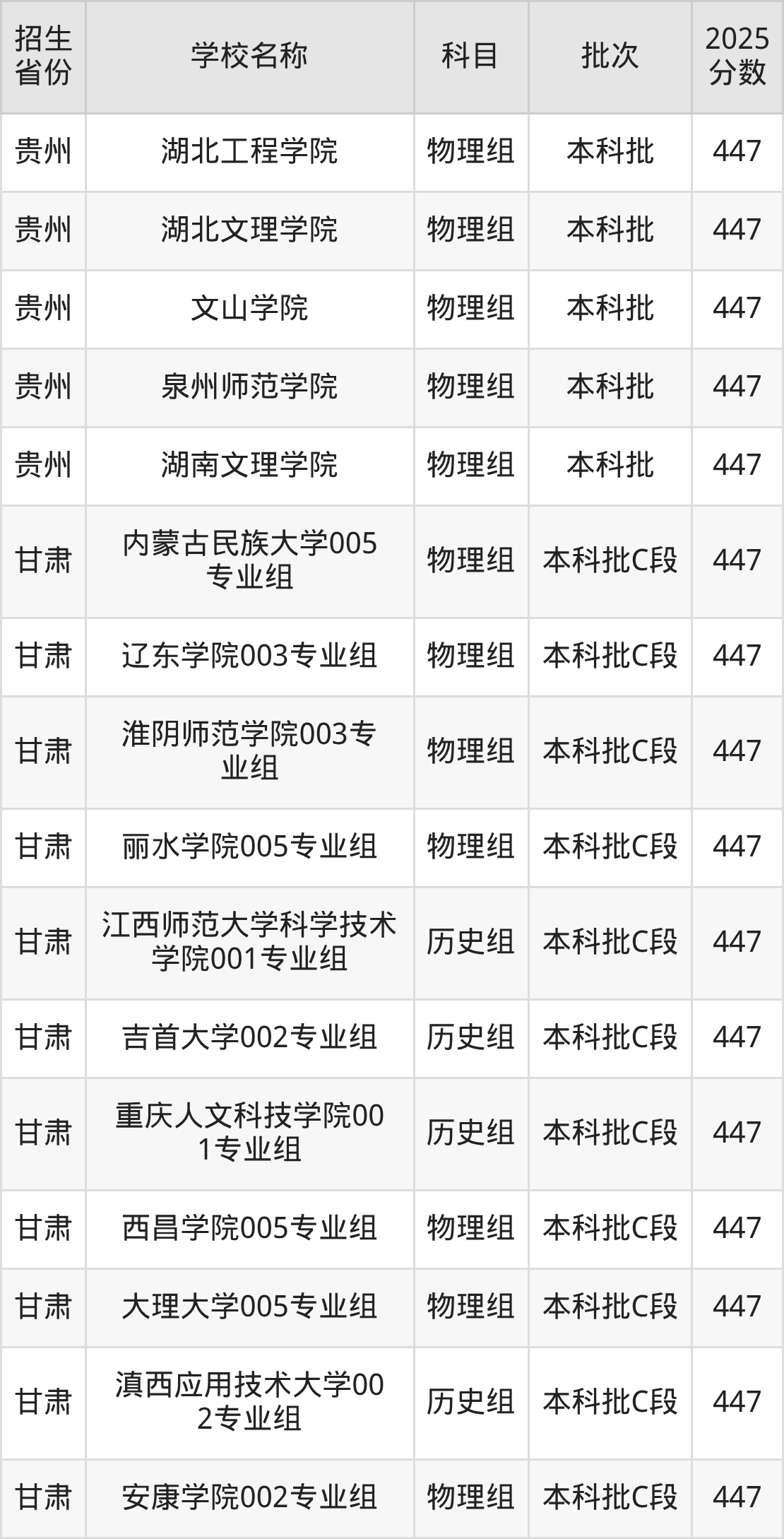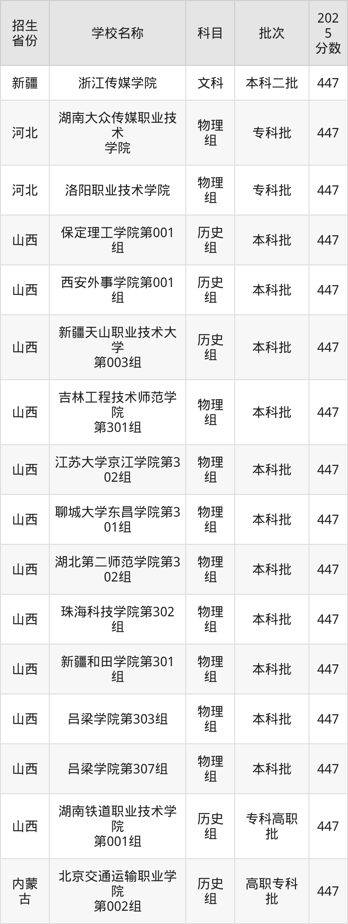筛选全国各省2025年录取分数线为447分的文科大学如下: