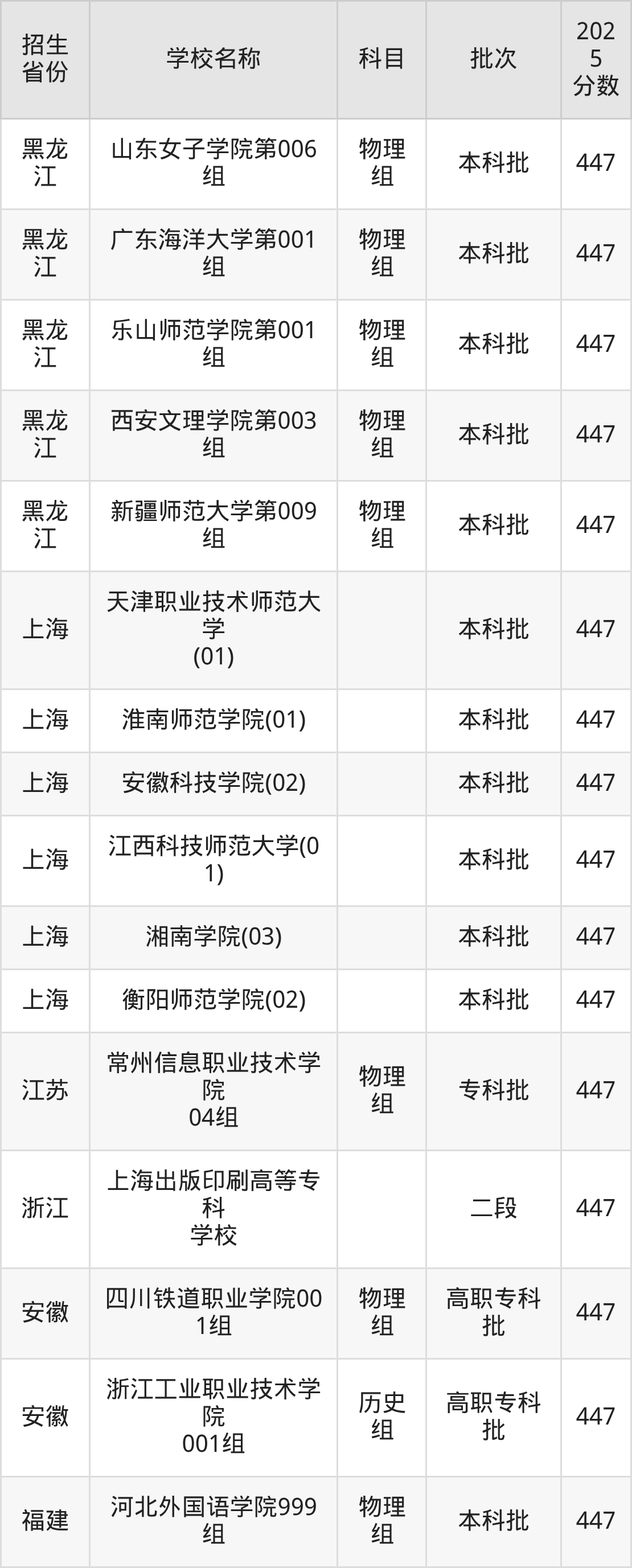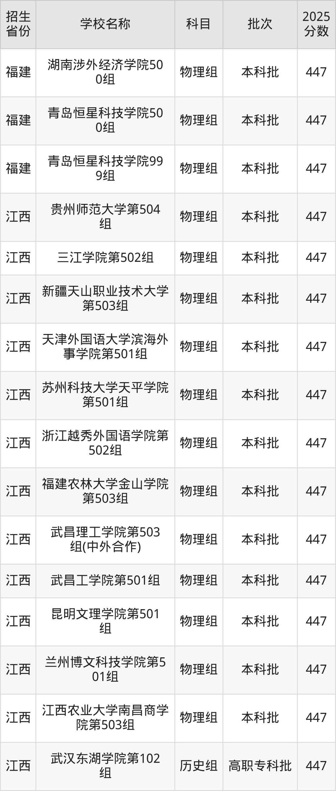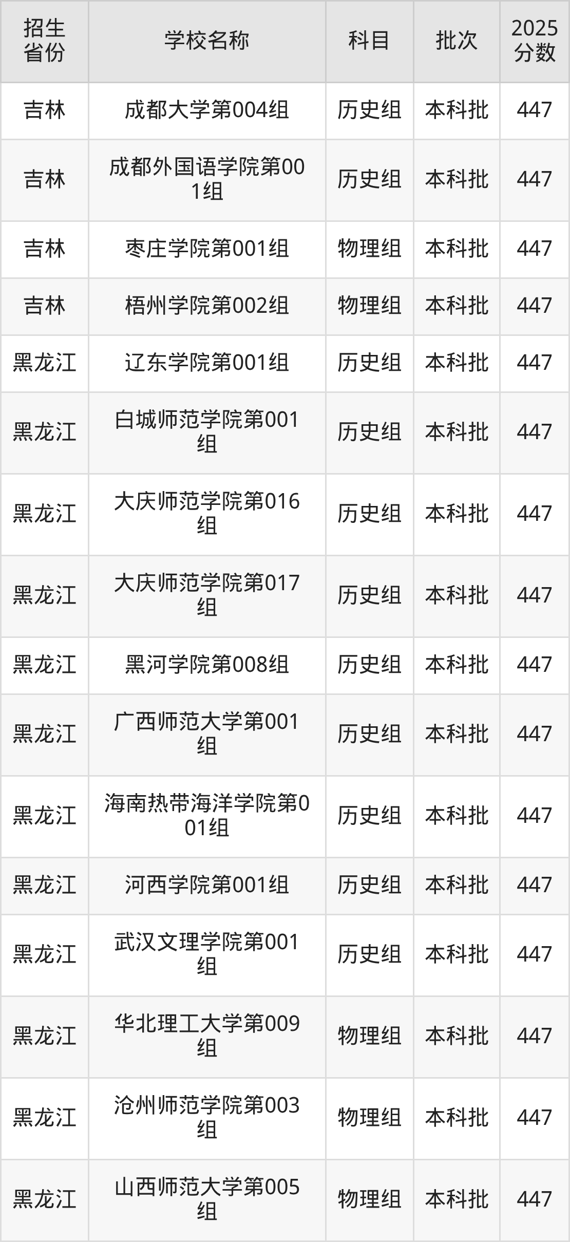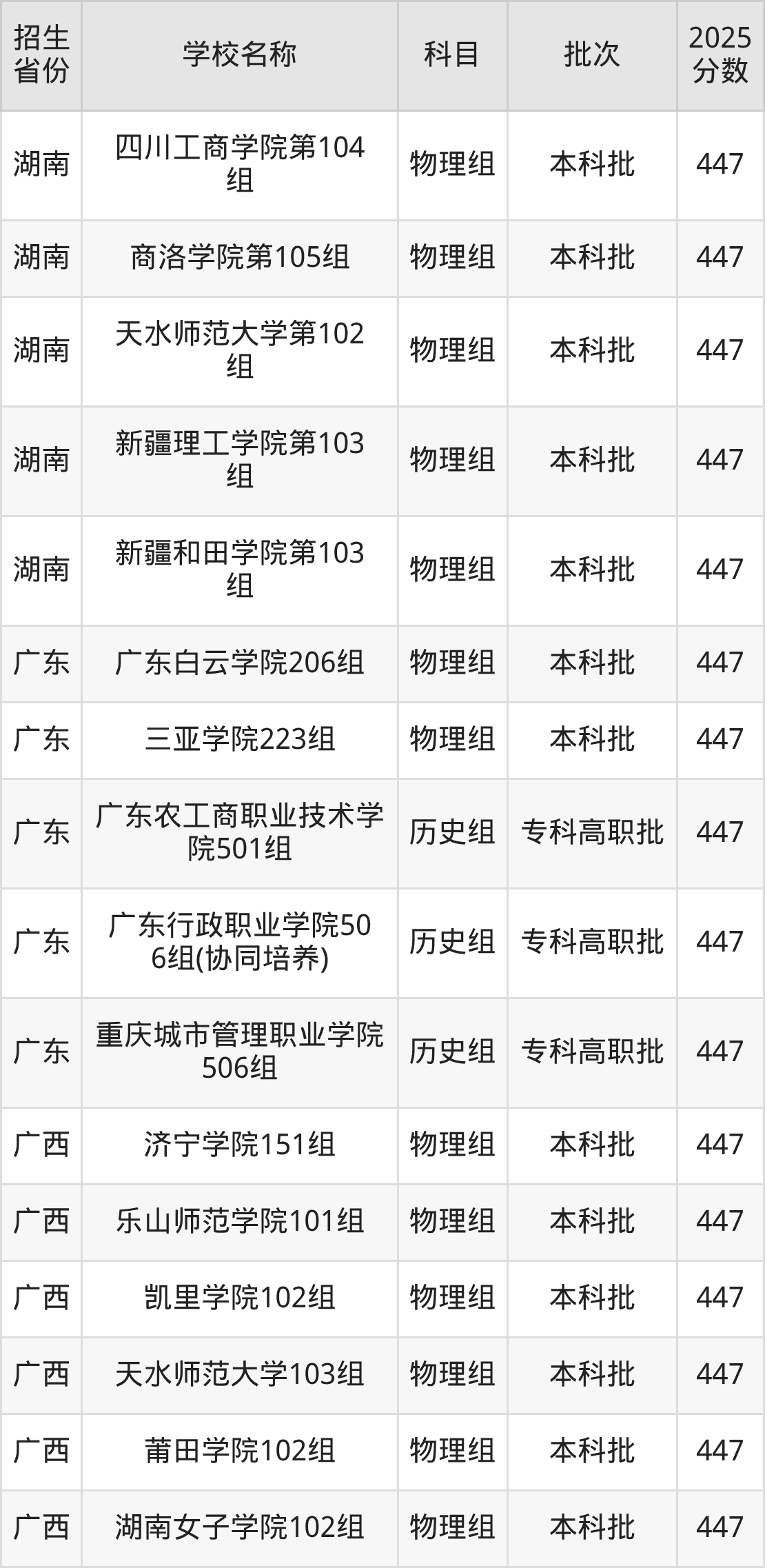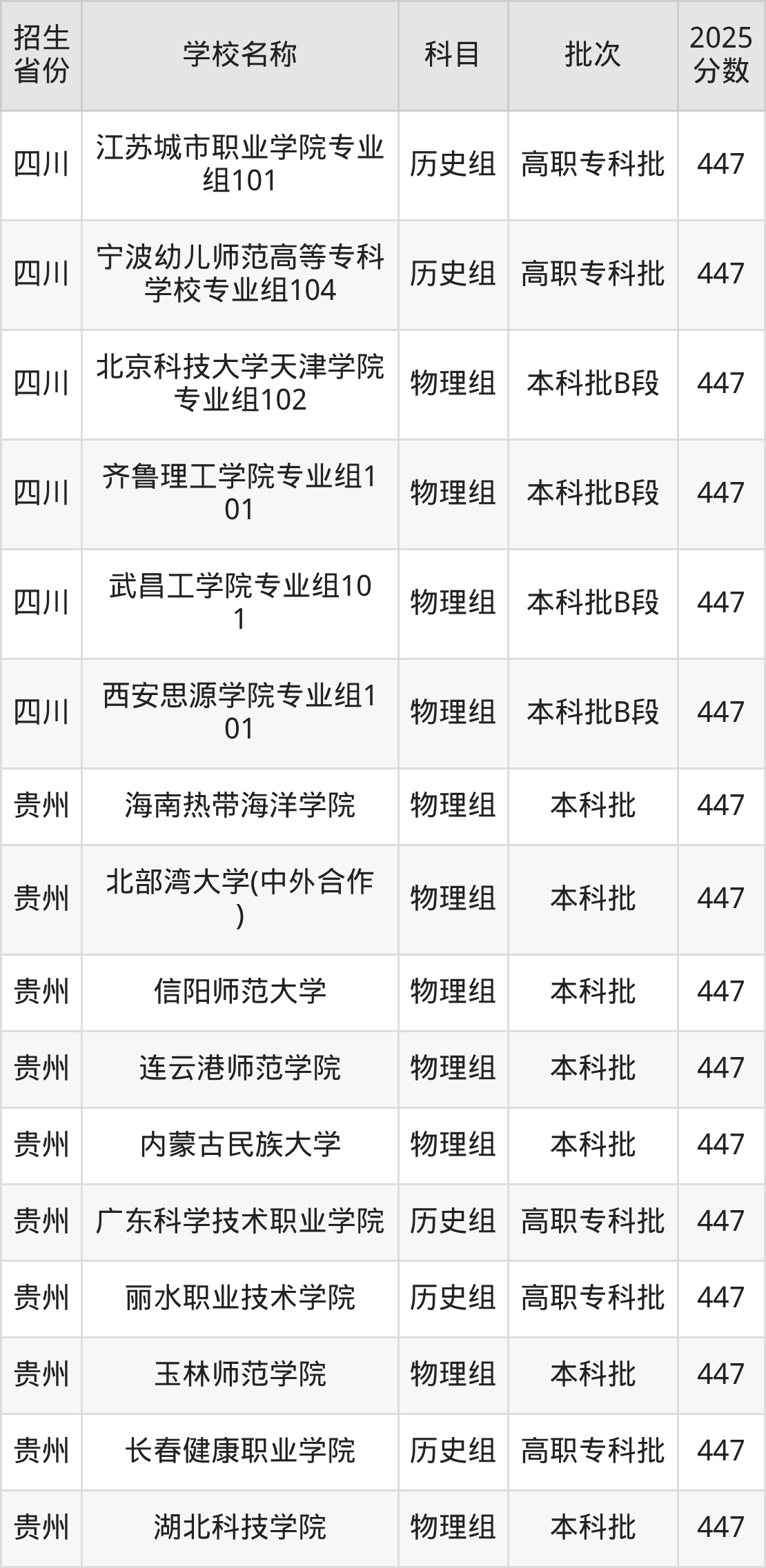 筛选全国各省2025年录取分数线为447分的文科大学如下: