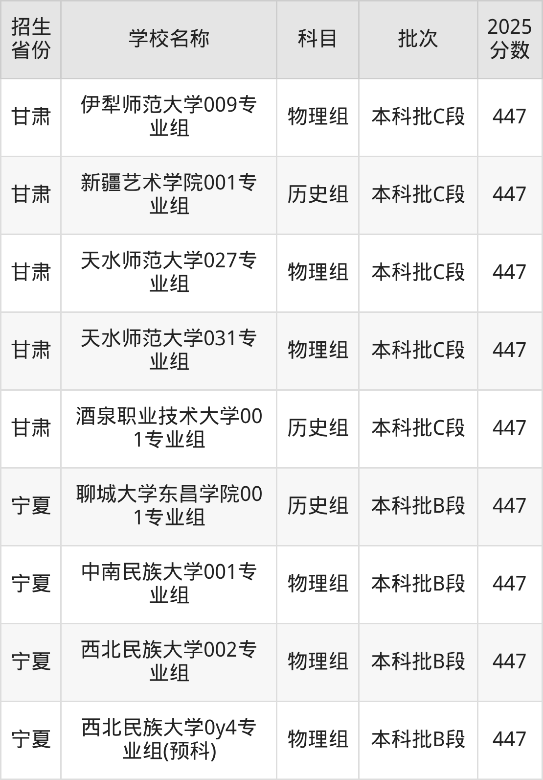 甘肃省物理组分数线是447分的文科大学有:内蒙古民族大学、辽东学院、淮阴师范学院、丽水学院、西昌学院、大理大学、安康学院、伊犁师范大学、天水师范大学。