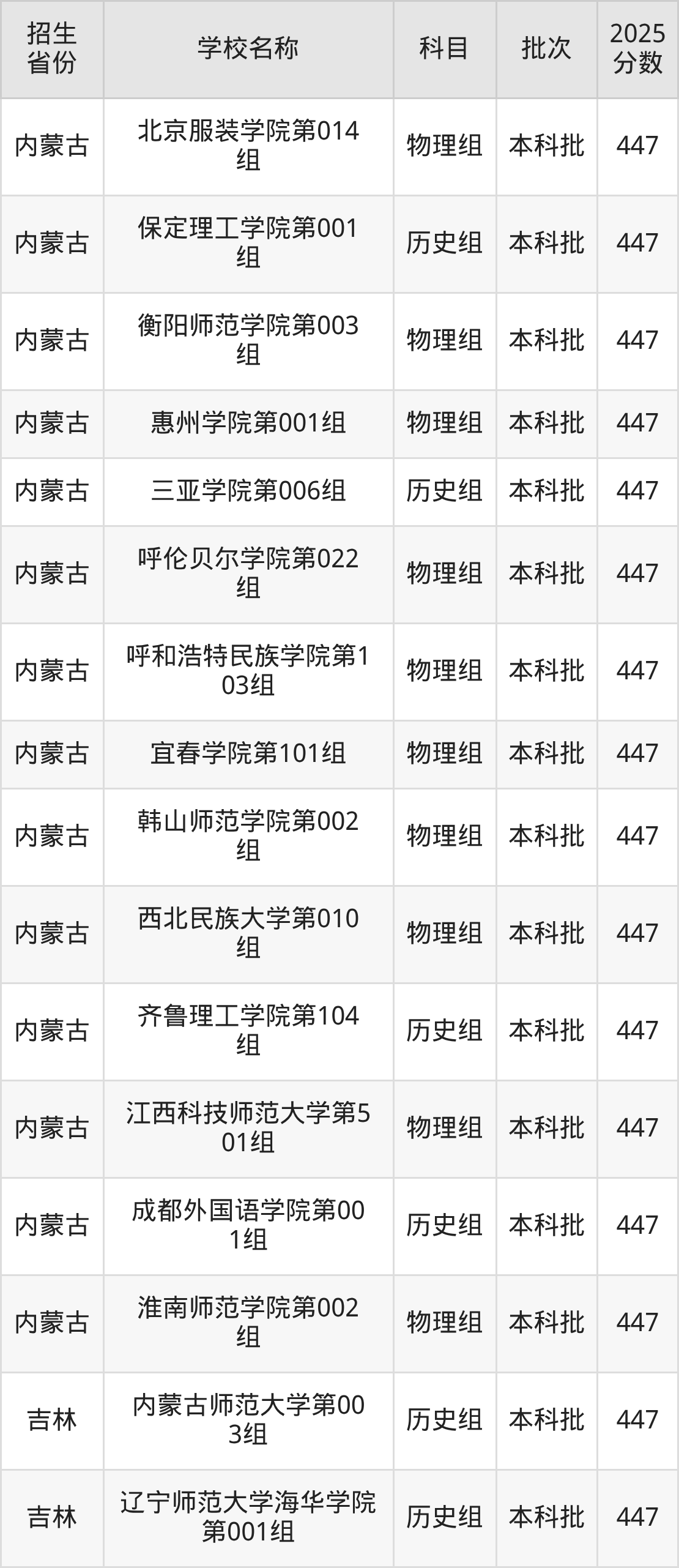 内蒙古自治区物理组分数线是447分的文科大学有:北京服装学院、衡阳师范学院、惠州学院、呼伦贝尔学院、呼和浩特民族学院、宜春学院、韩山师范学院、西北民族大学、江西科技师范大学、淮南师范学院。