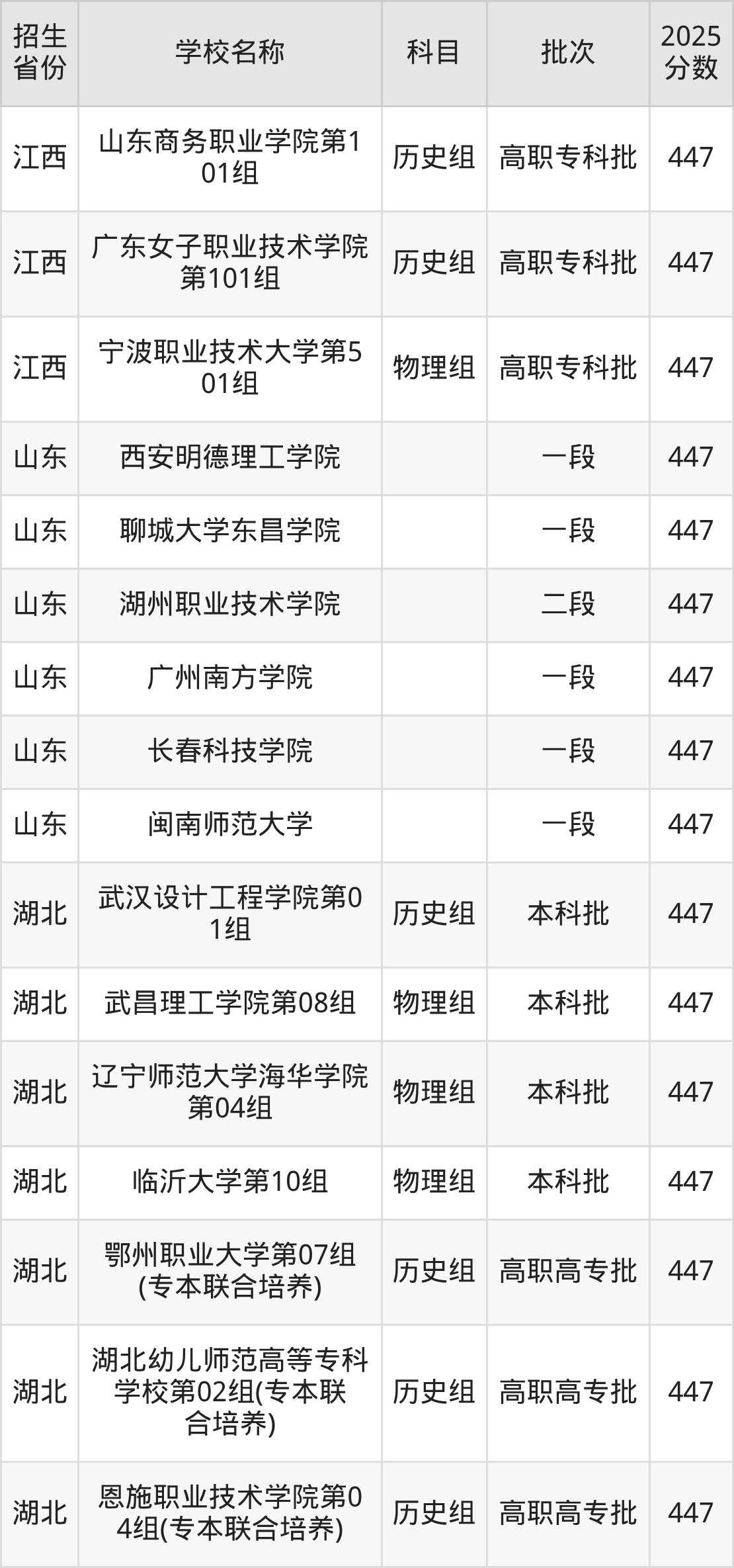 江西省历史组分数线是447分的文科大学有:武汉东湖学院、山东商务职业学院、广东女子职业技术学院。