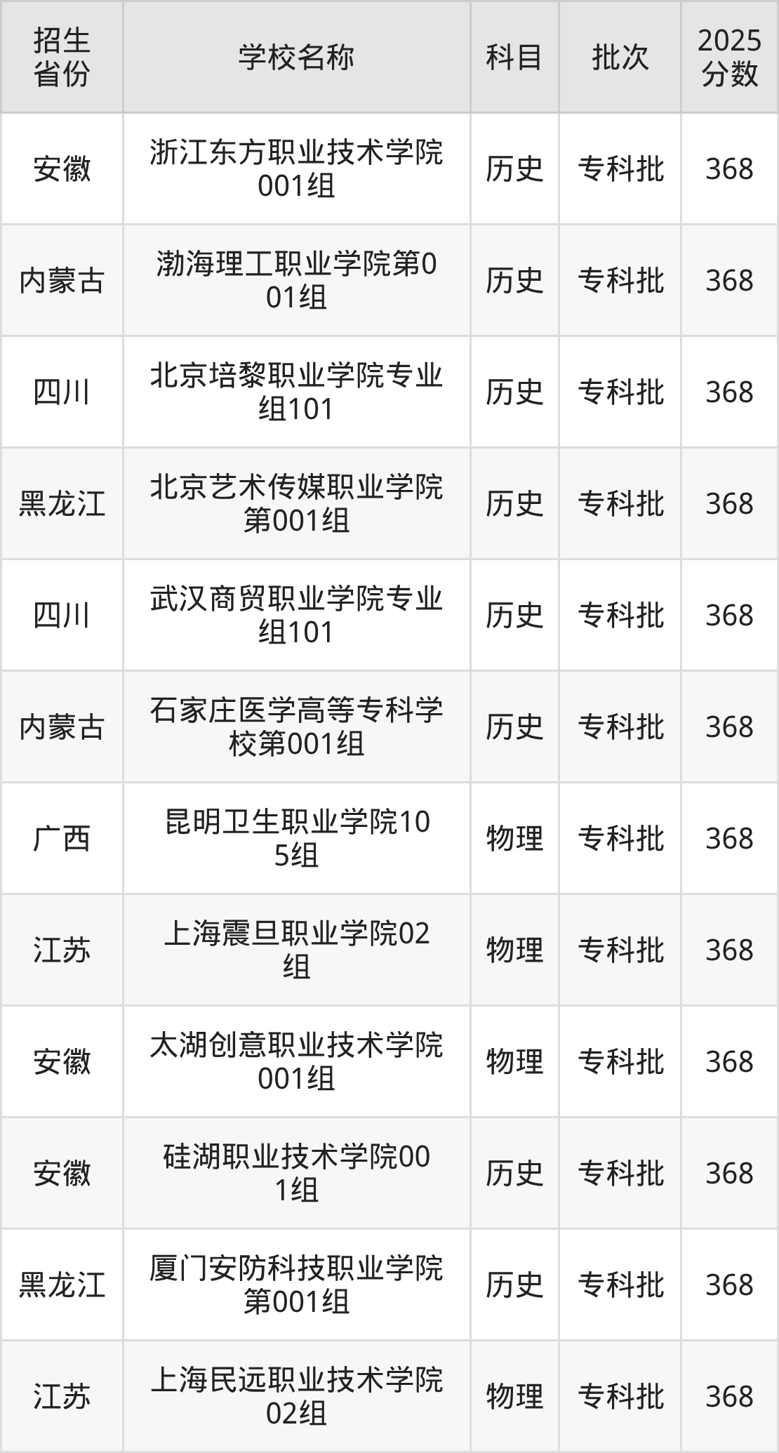 筛选全国各省2025年录取分数线为368分的民办专科学校如下: