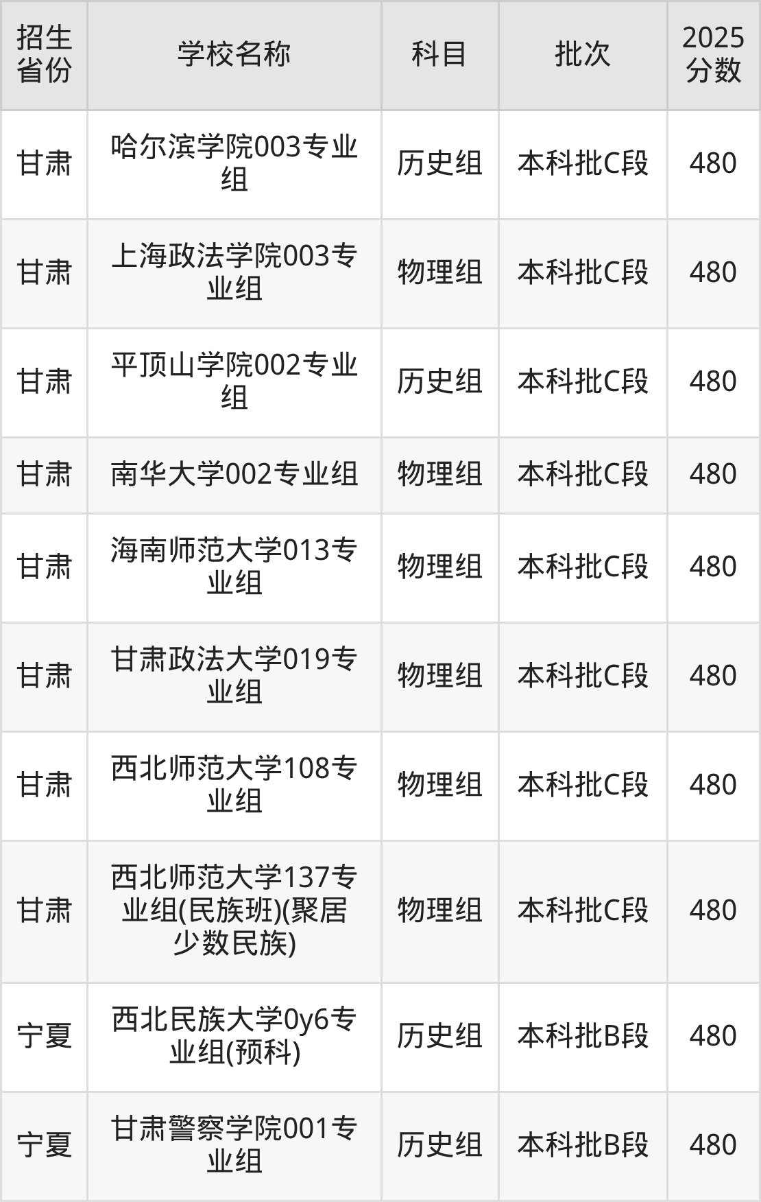 筛选全国各省2025年录取分数线为480分的文科大学如下: