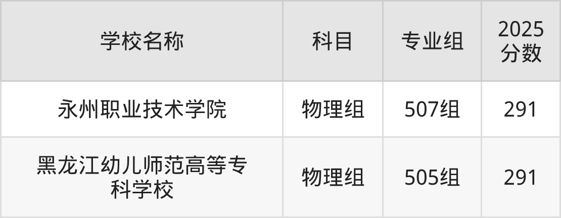广东高考录取分数线在291分左右的公办院校专业组一共有2个,其中物理组有:永州职业技术学院(291分)、黑龙江幼儿师范高等专科学校(291分)。