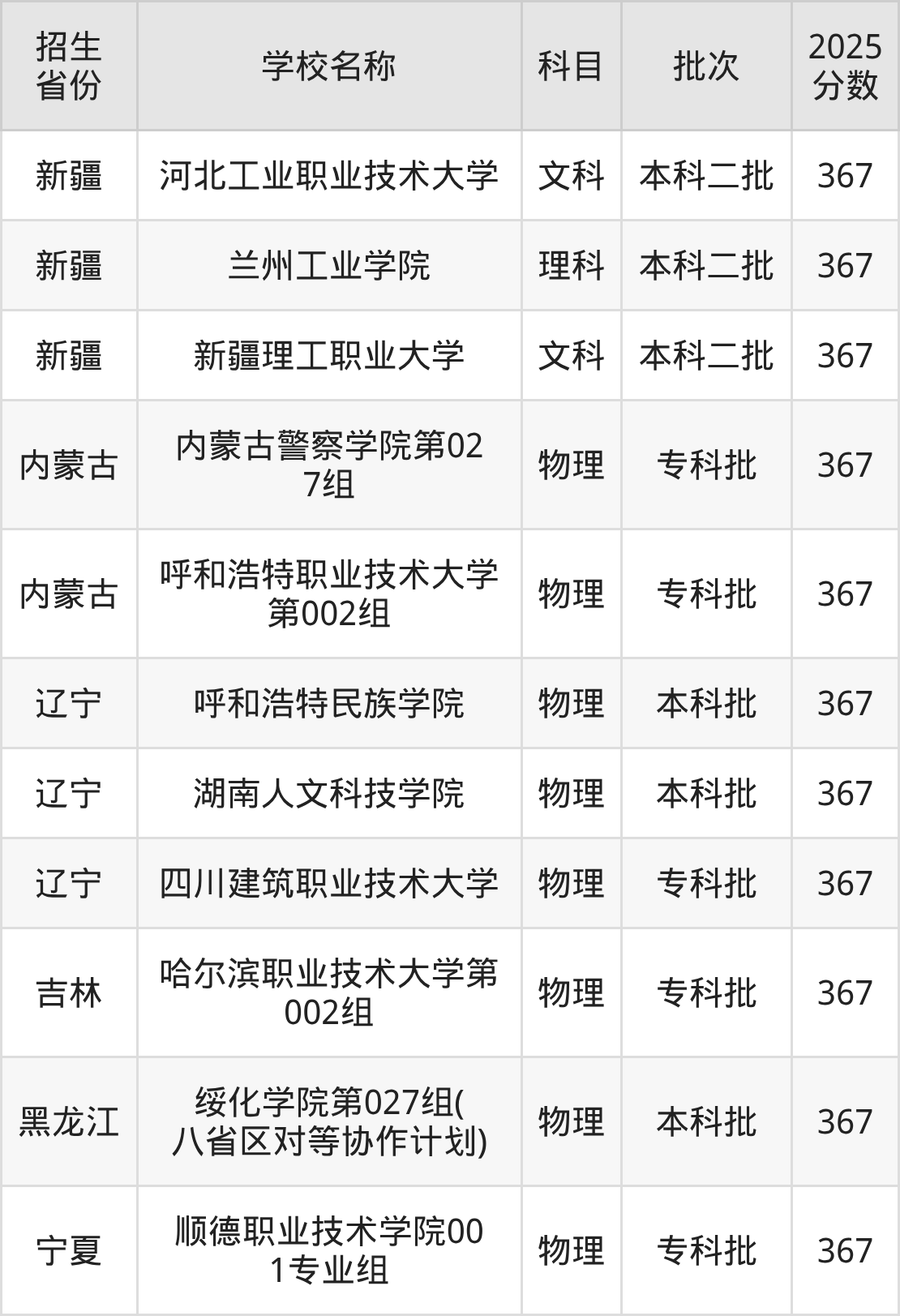 新疆维吾尔自治区文科分数线是367分的二本公办大学有:河北工业职业技术大学、新疆理工职业大学。
