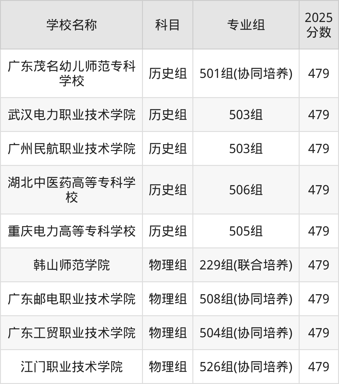 广东高考录取分数线在479分左右的公办院校专业组一共有9个,其中历史组有:广东茂名幼儿师范专科学校(479分)、武汉电力职业技术学院(479分)、广州民航职业技术学院(479分),物理组有:韩山师范学院(479分)、广东邮电职业技术学院(479分)、广东工贸职业技术学院(479分)。