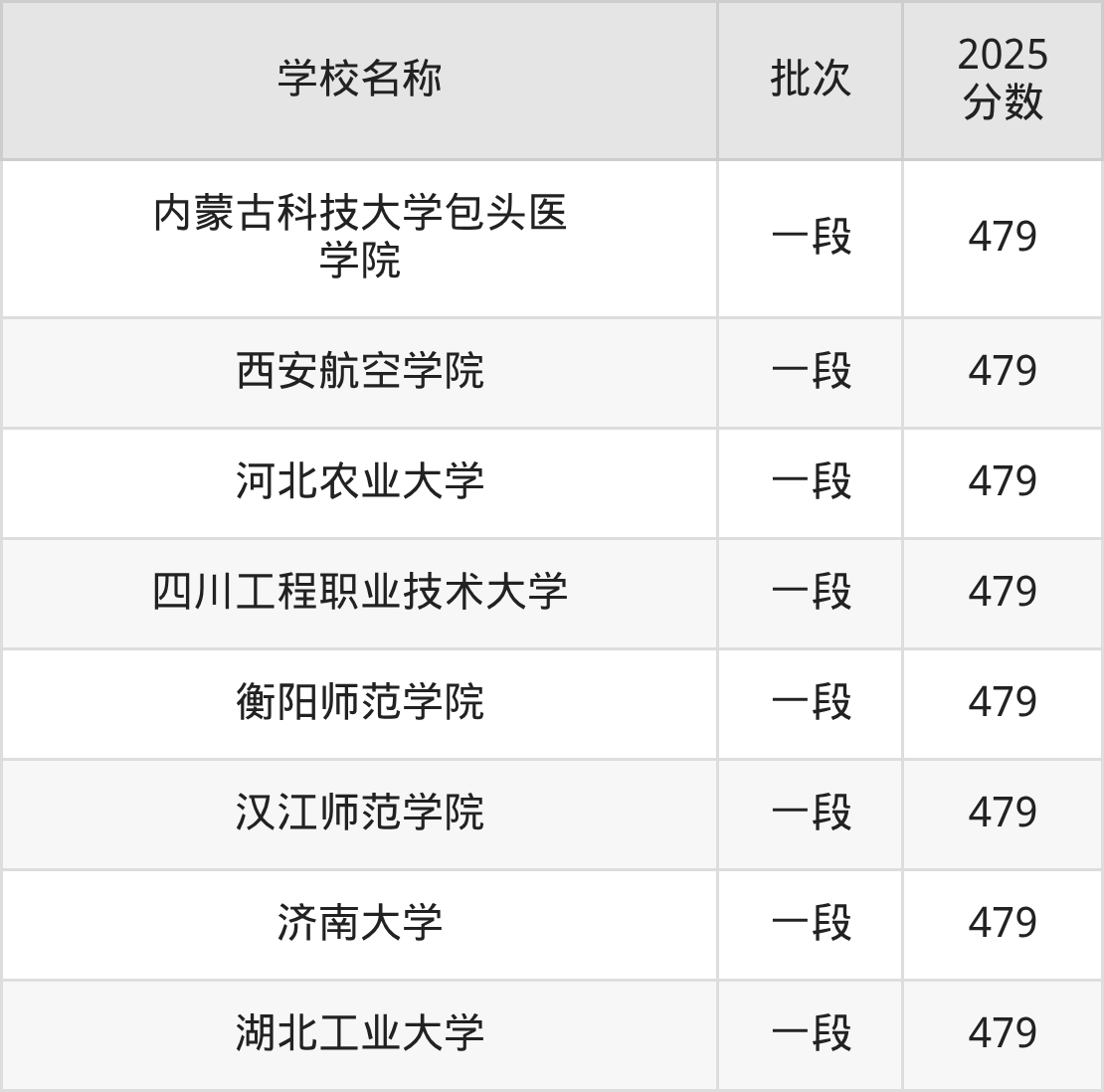 山东高考录取分数线在479分左右的公办大学一共有8所。分别是内蒙古科技大学包头医学院(479分)、西安航空学院(479分)、河北农业大学(479分)
