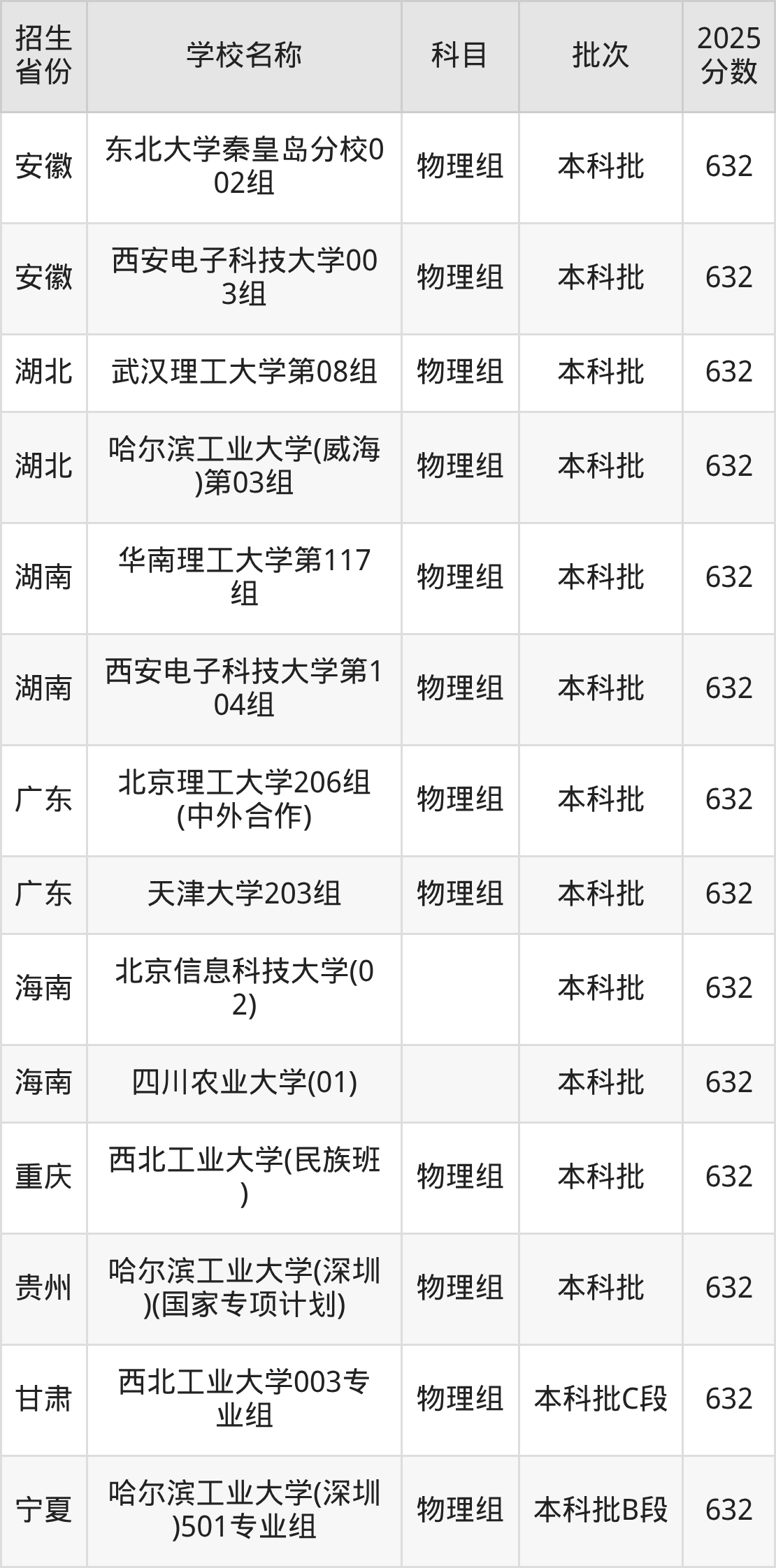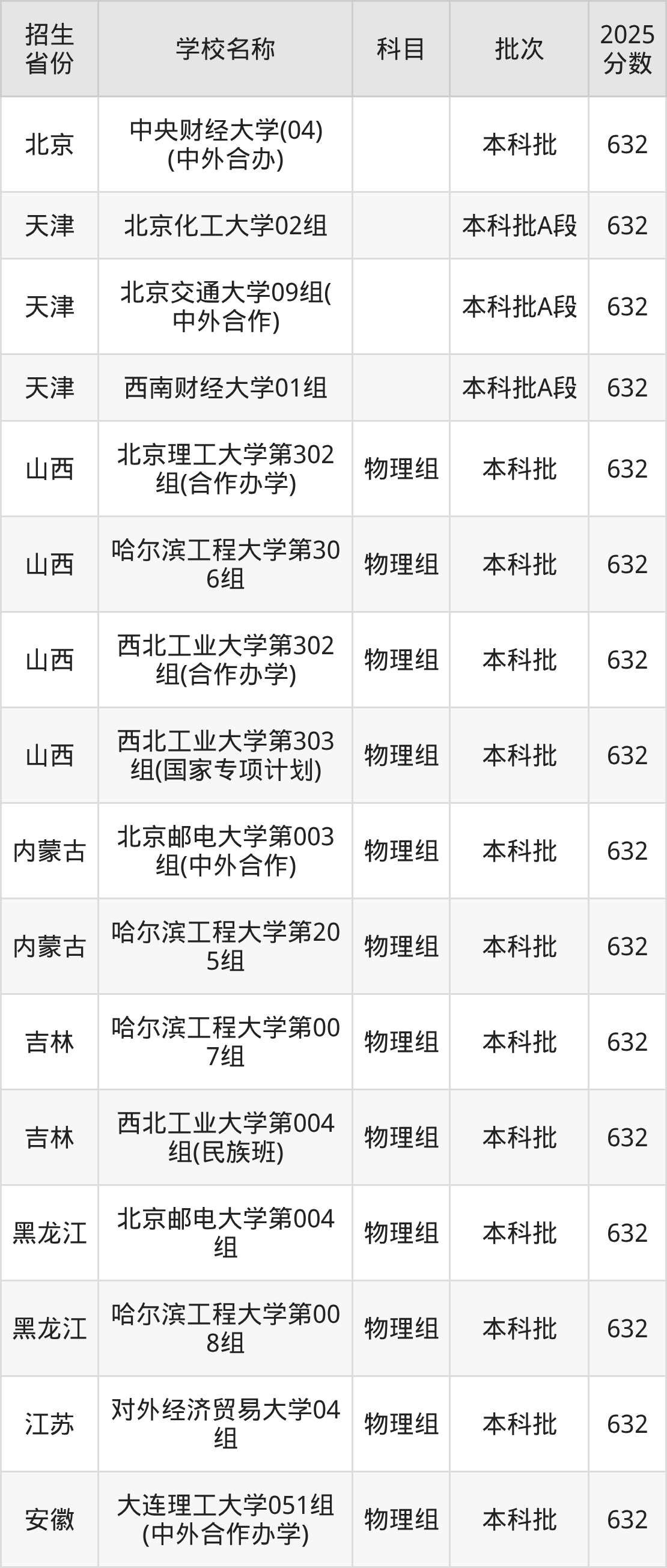 筛选全国各省2025年录取分数线为632分的理科大学如下: