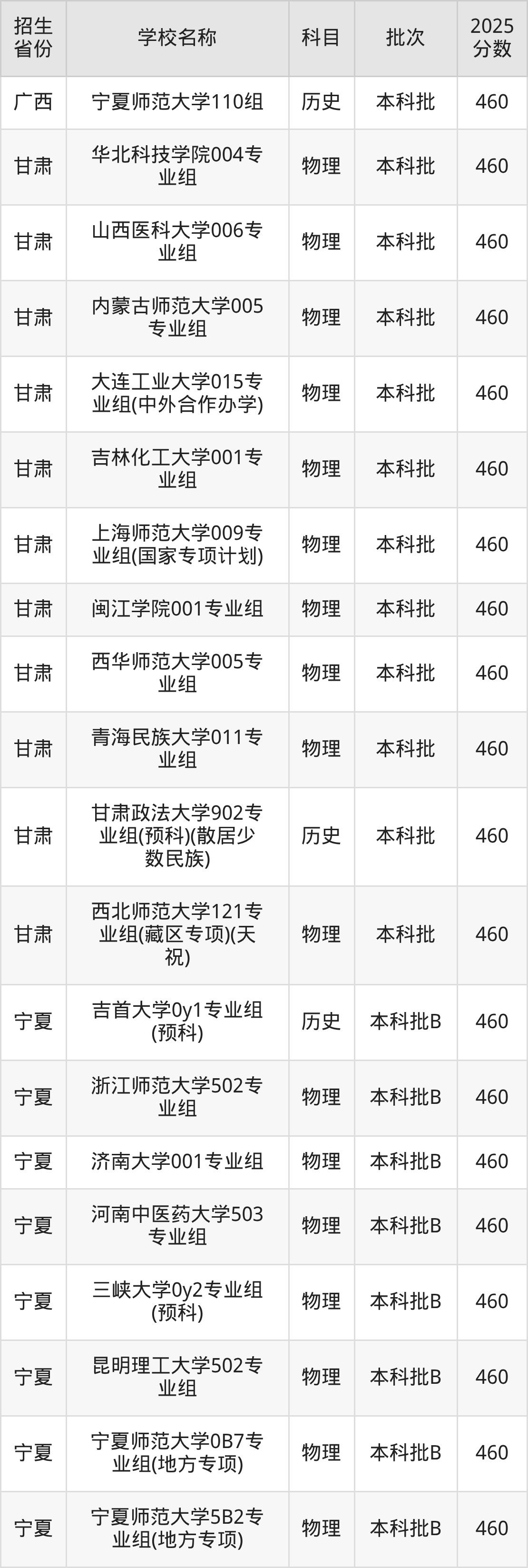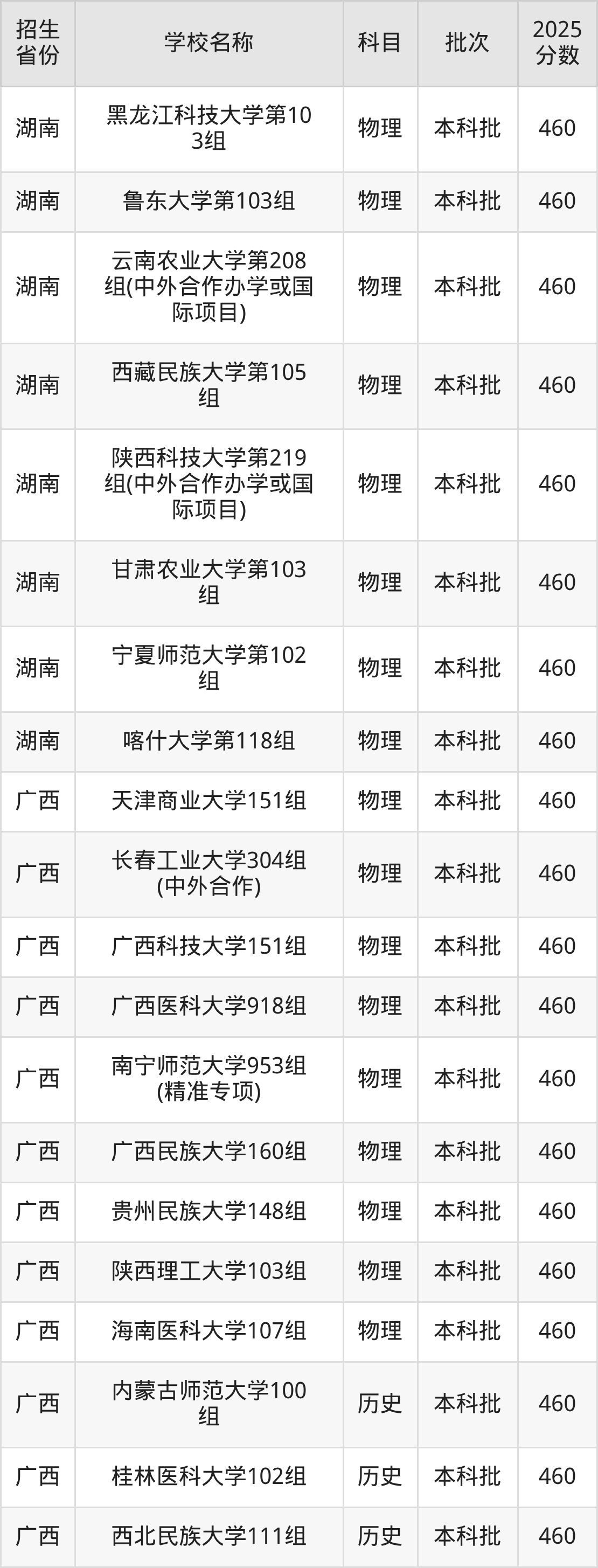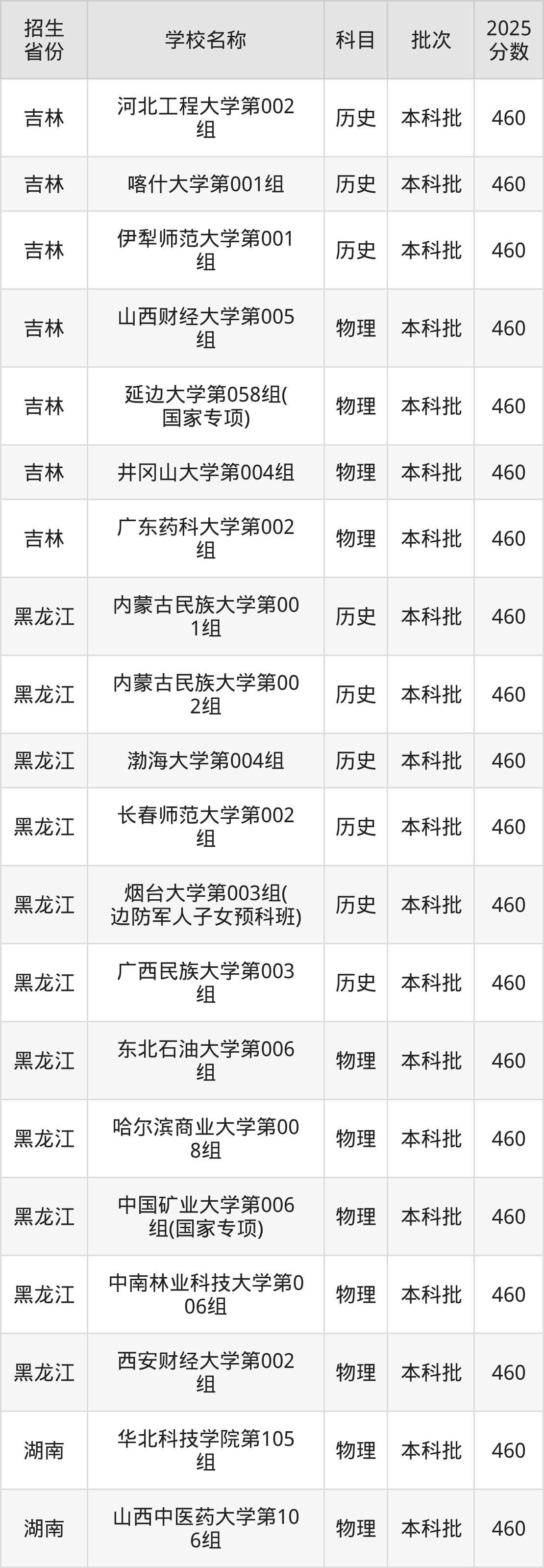筛选全国各省2025年录取分数线为460分的一本大学如下: