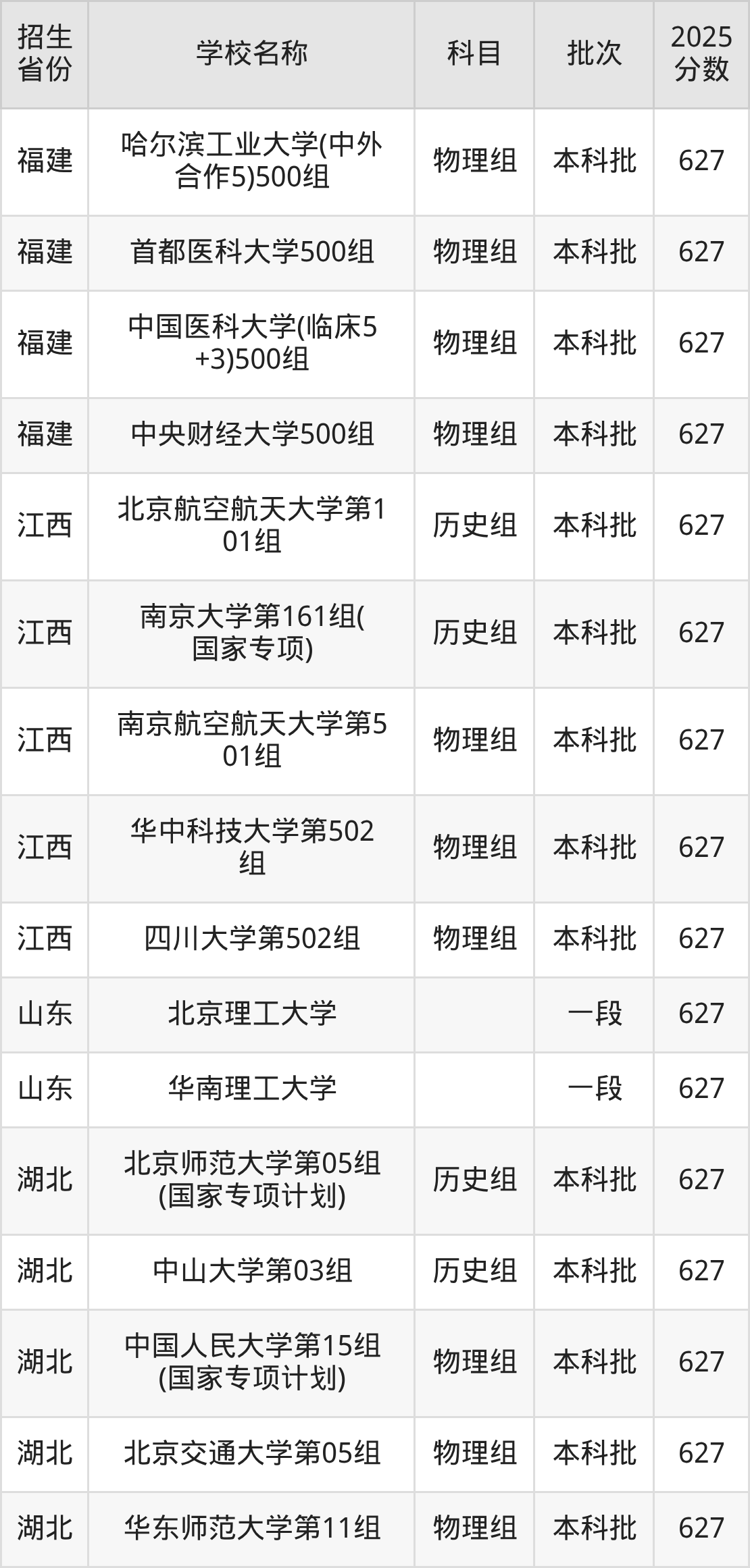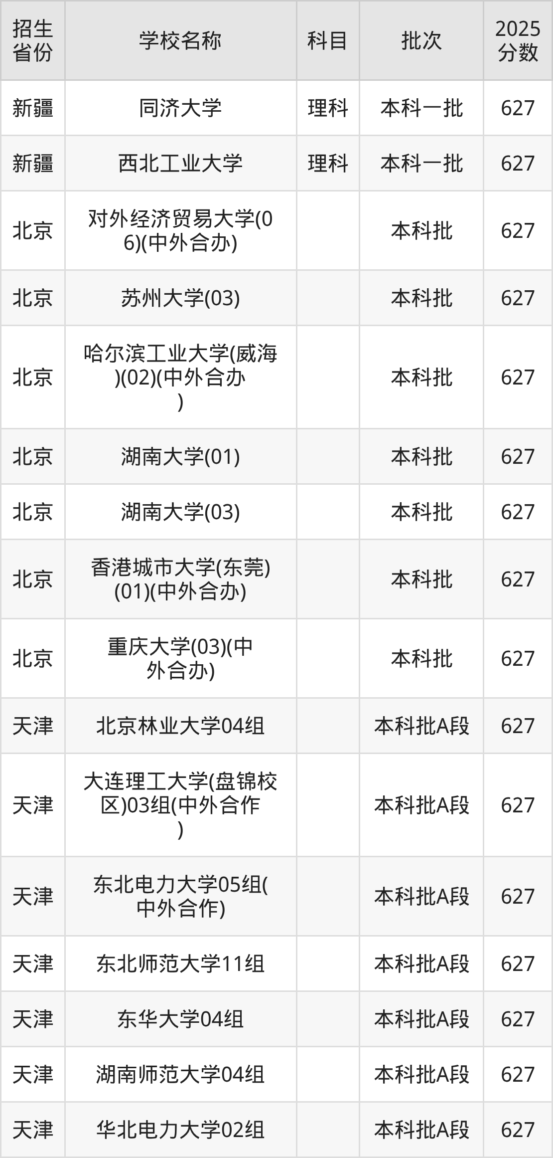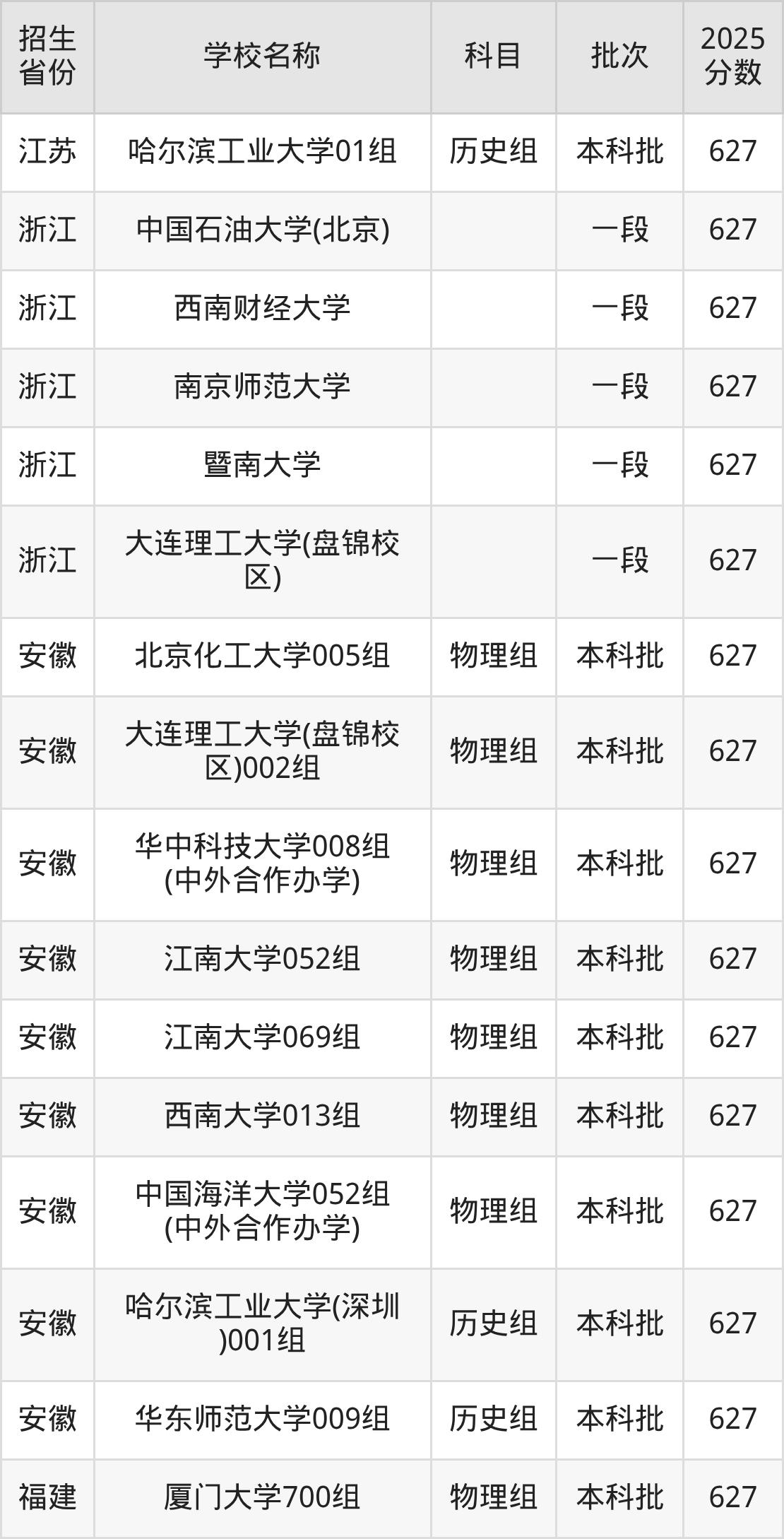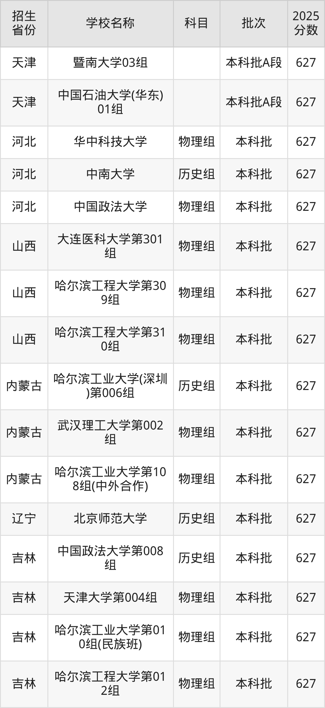 筛选全国各省2025年录取分数线为627分的一本大学如下: