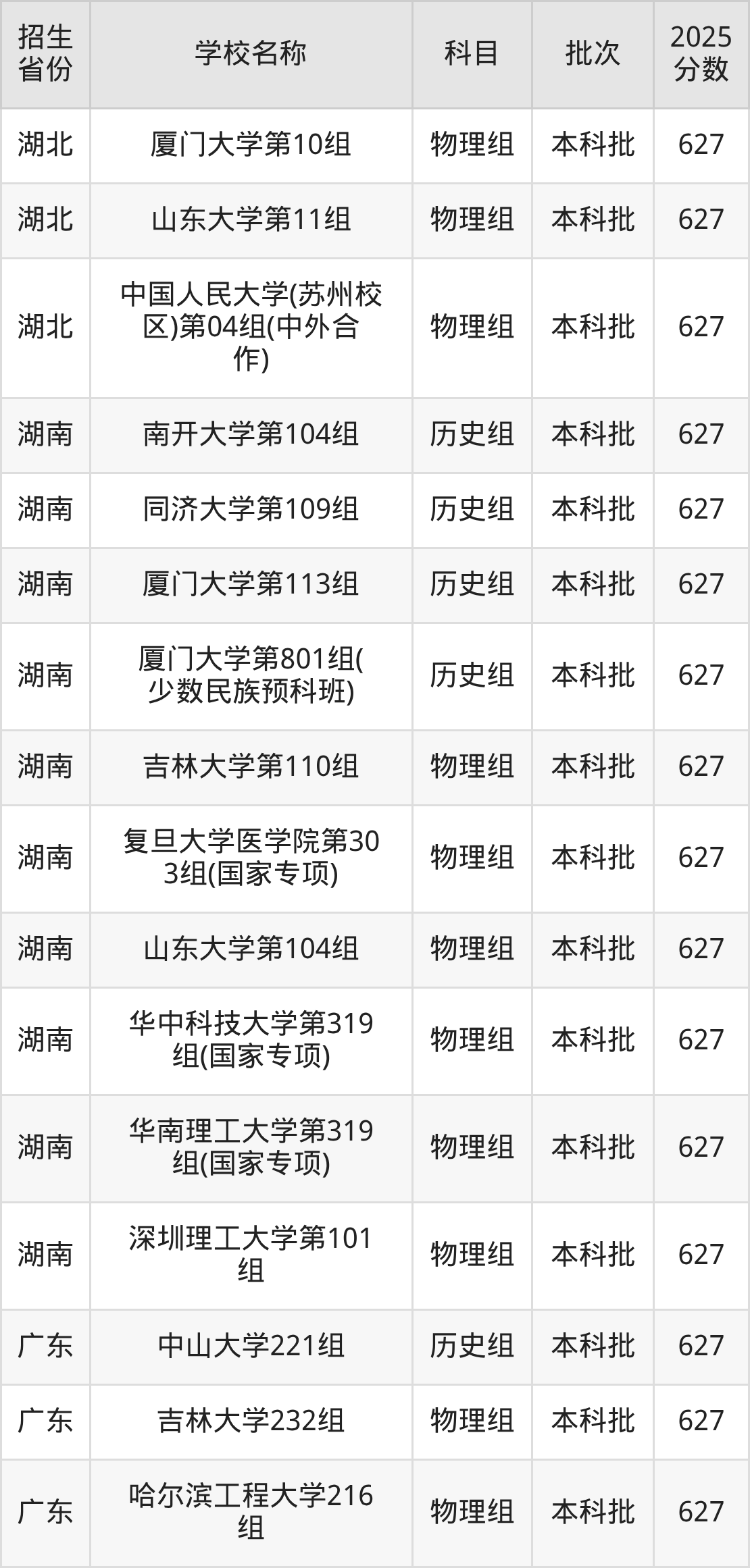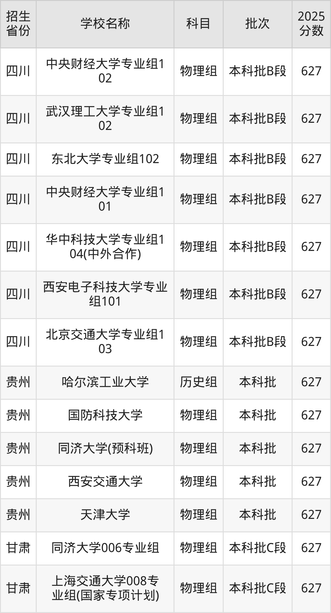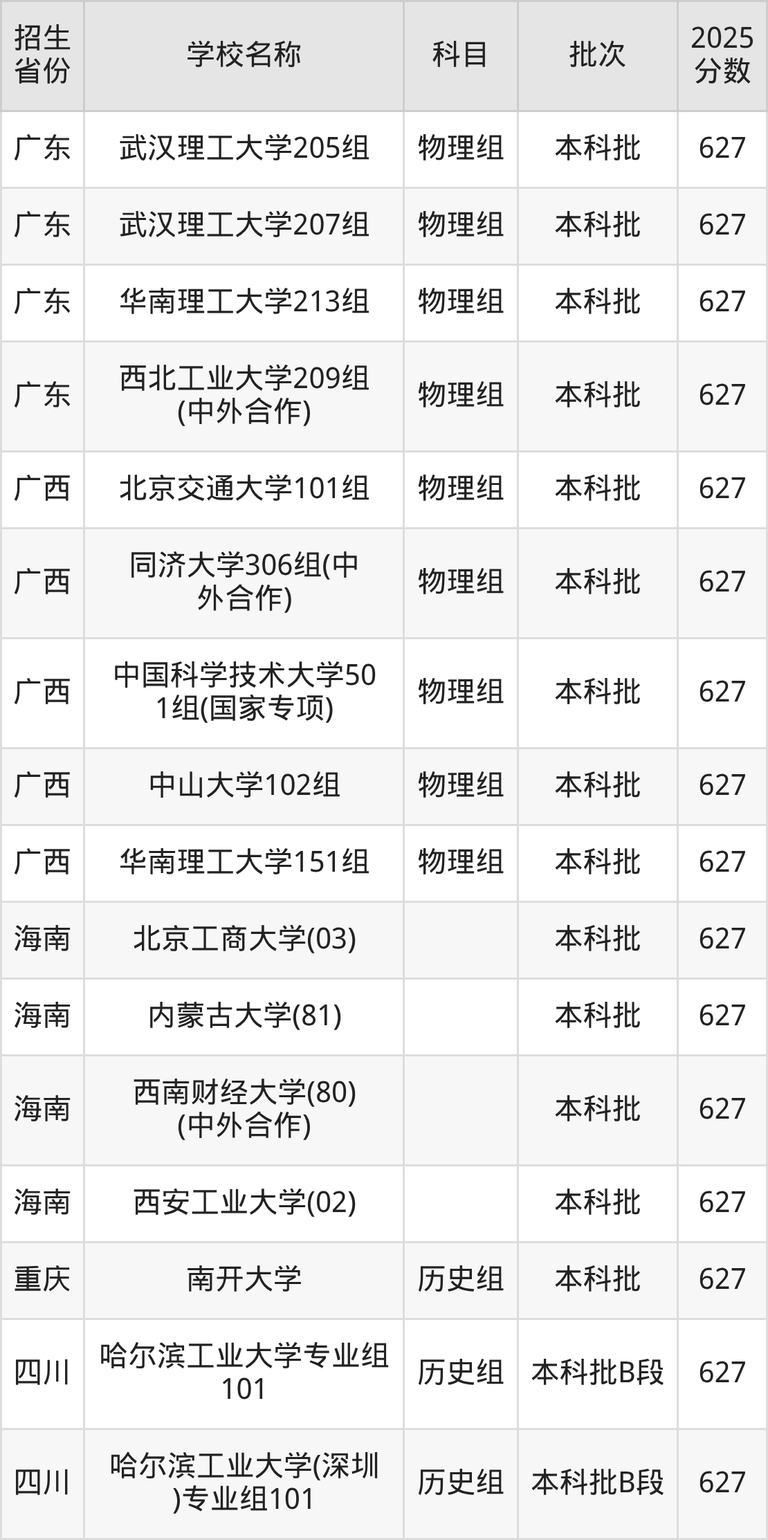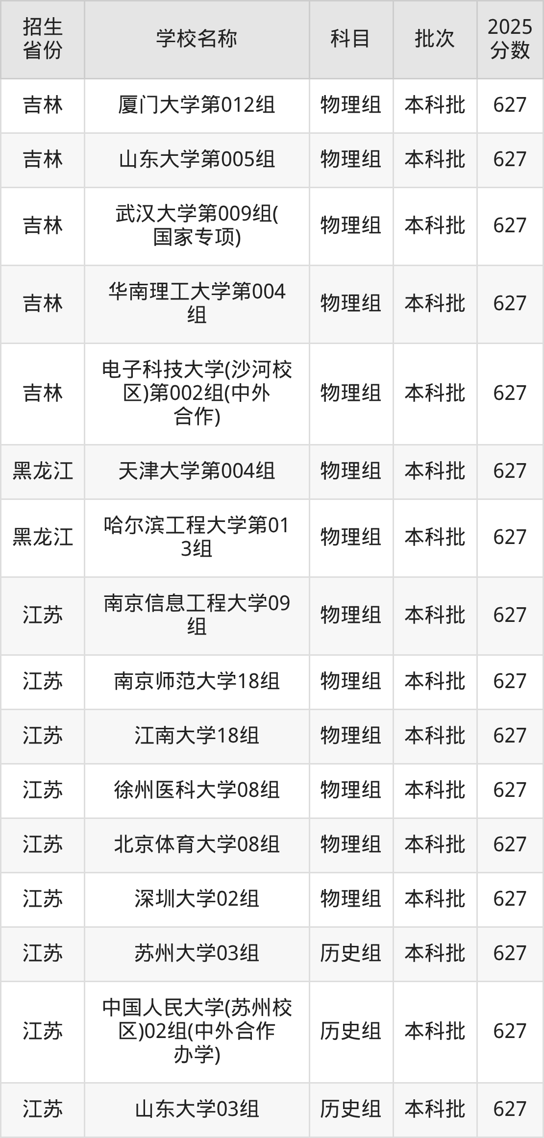 筛选全国各省2025年录取分数线为627分的一本大学如下: