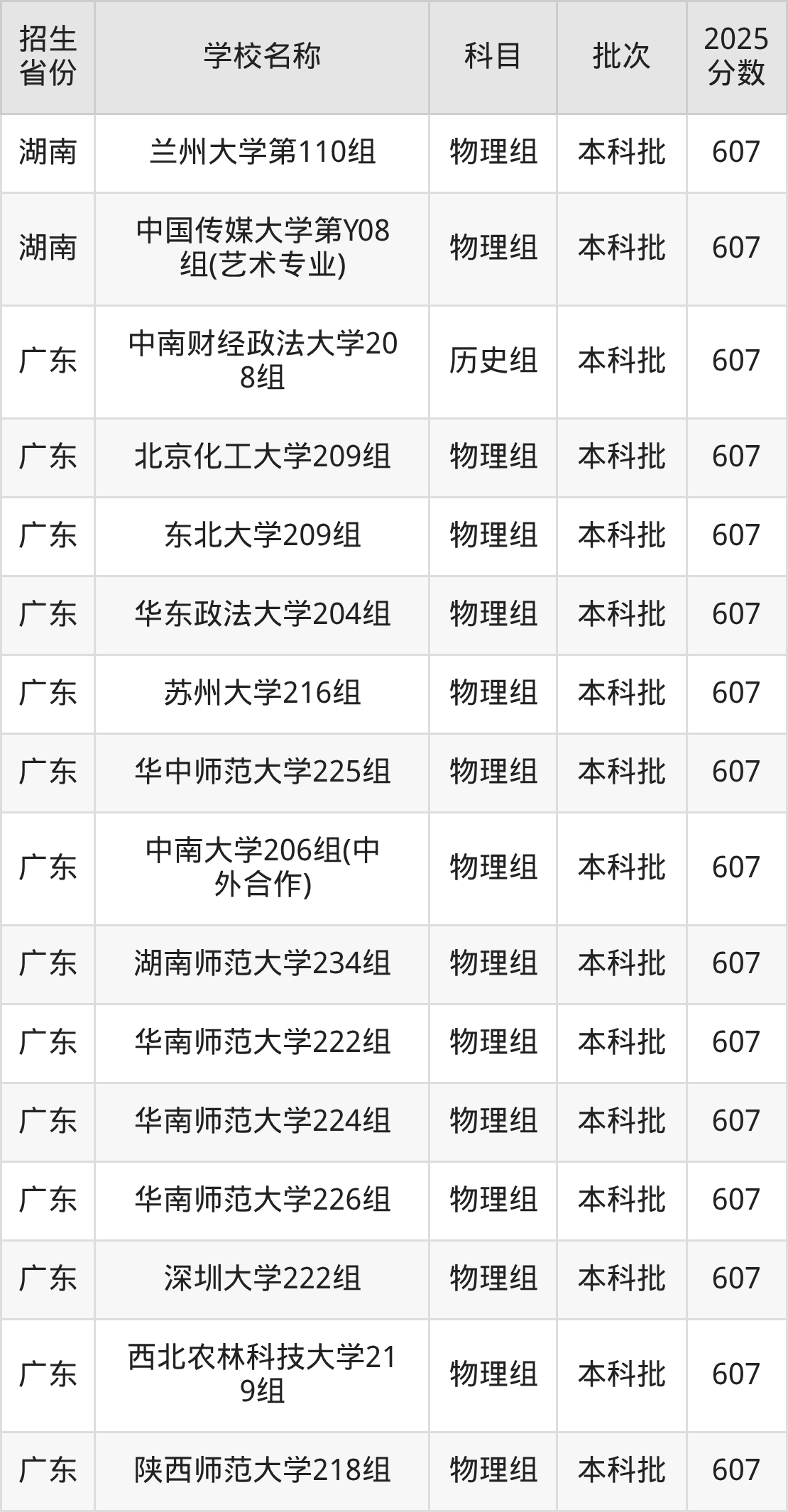 广东省物理组分数线是607分的重点大学有:北京化工大学、东北大学、华东政法大学、苏州大学、华中师范大学、中南大学、湖南师范大学、华南师范大学、深圳大学、西北农林科技大学。