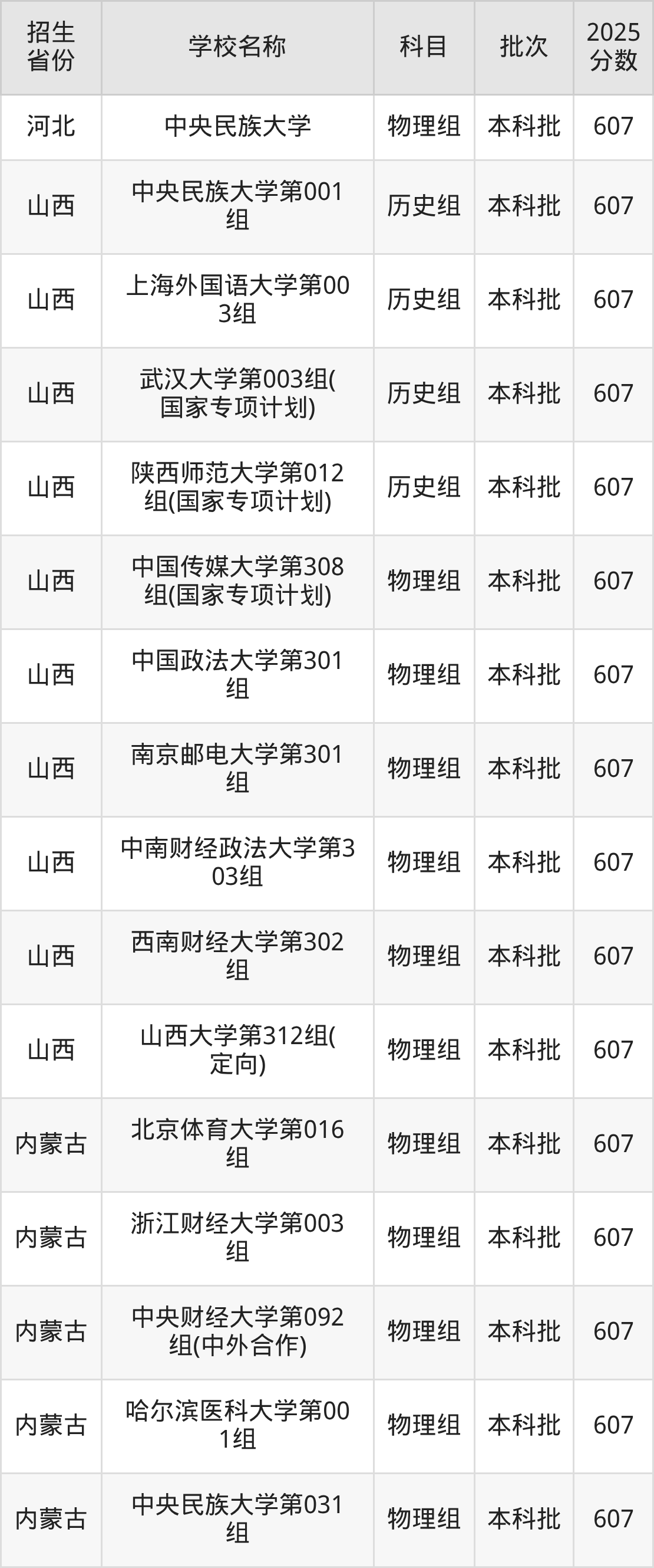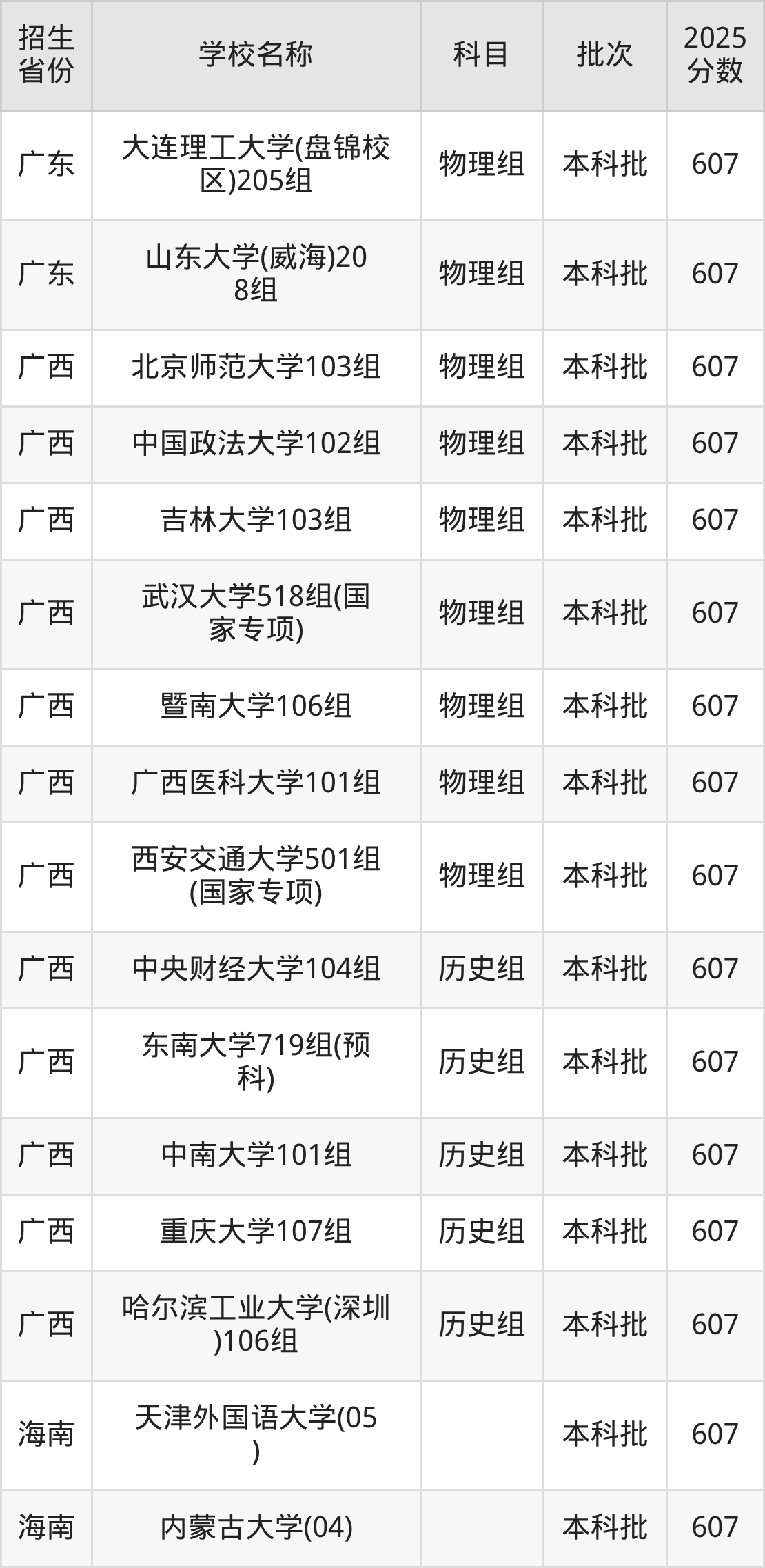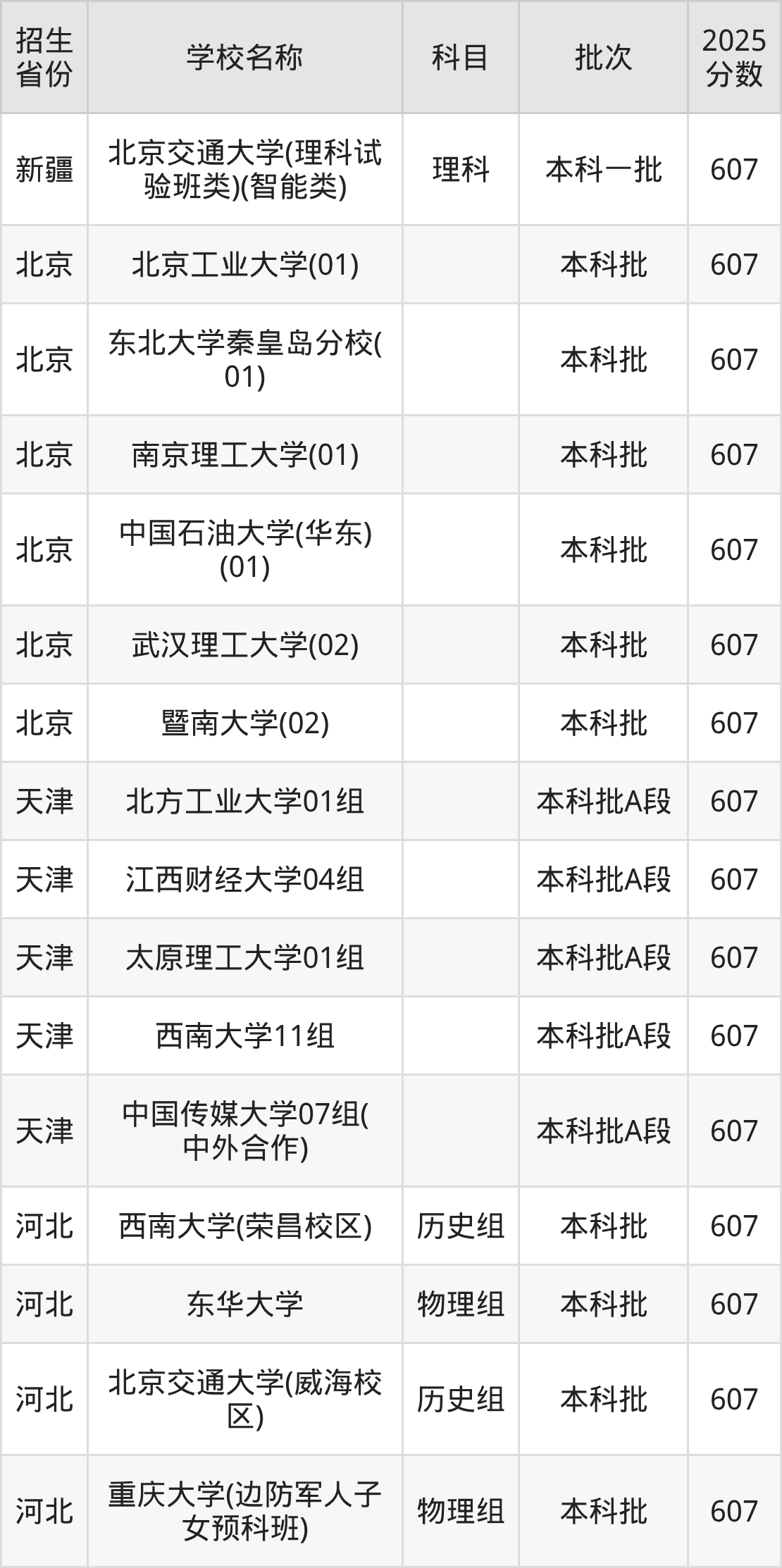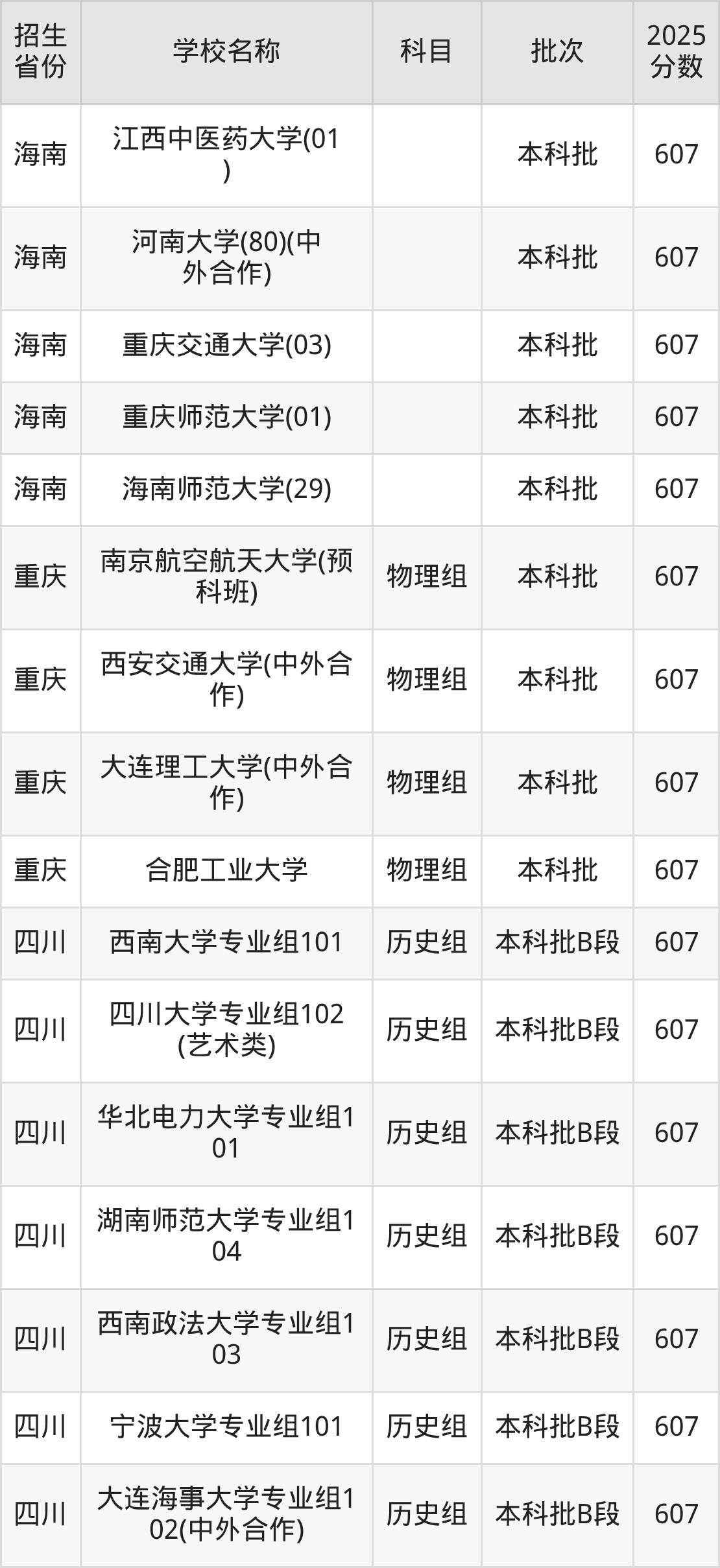筛选全国各省2025年录取分数线为607分的重点大学如下: