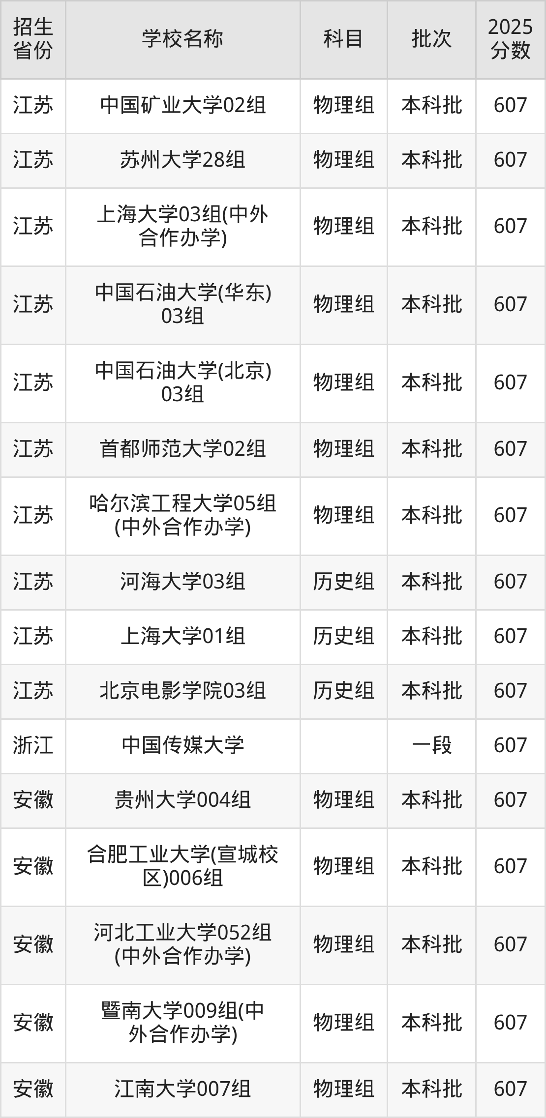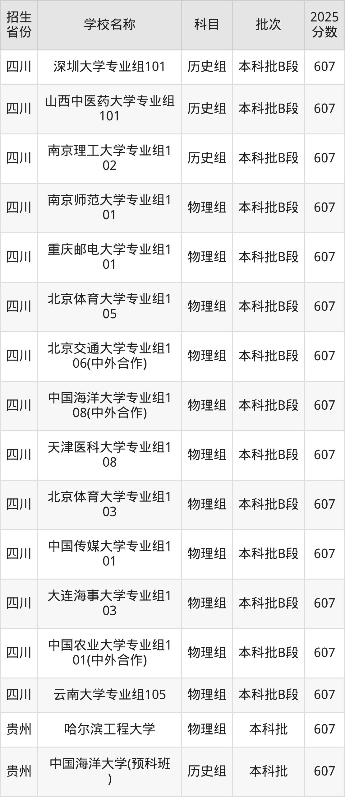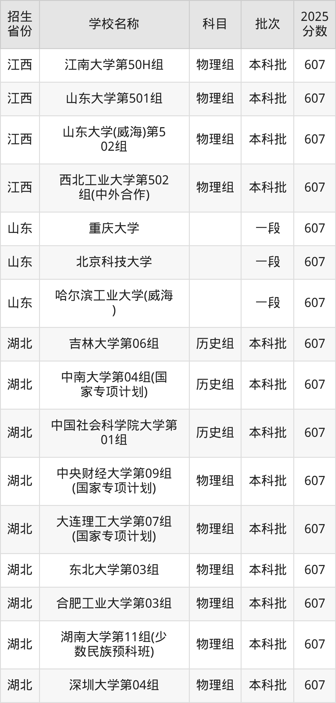 筛选全国各省2025年录取分数线为607分的重点大学如下: