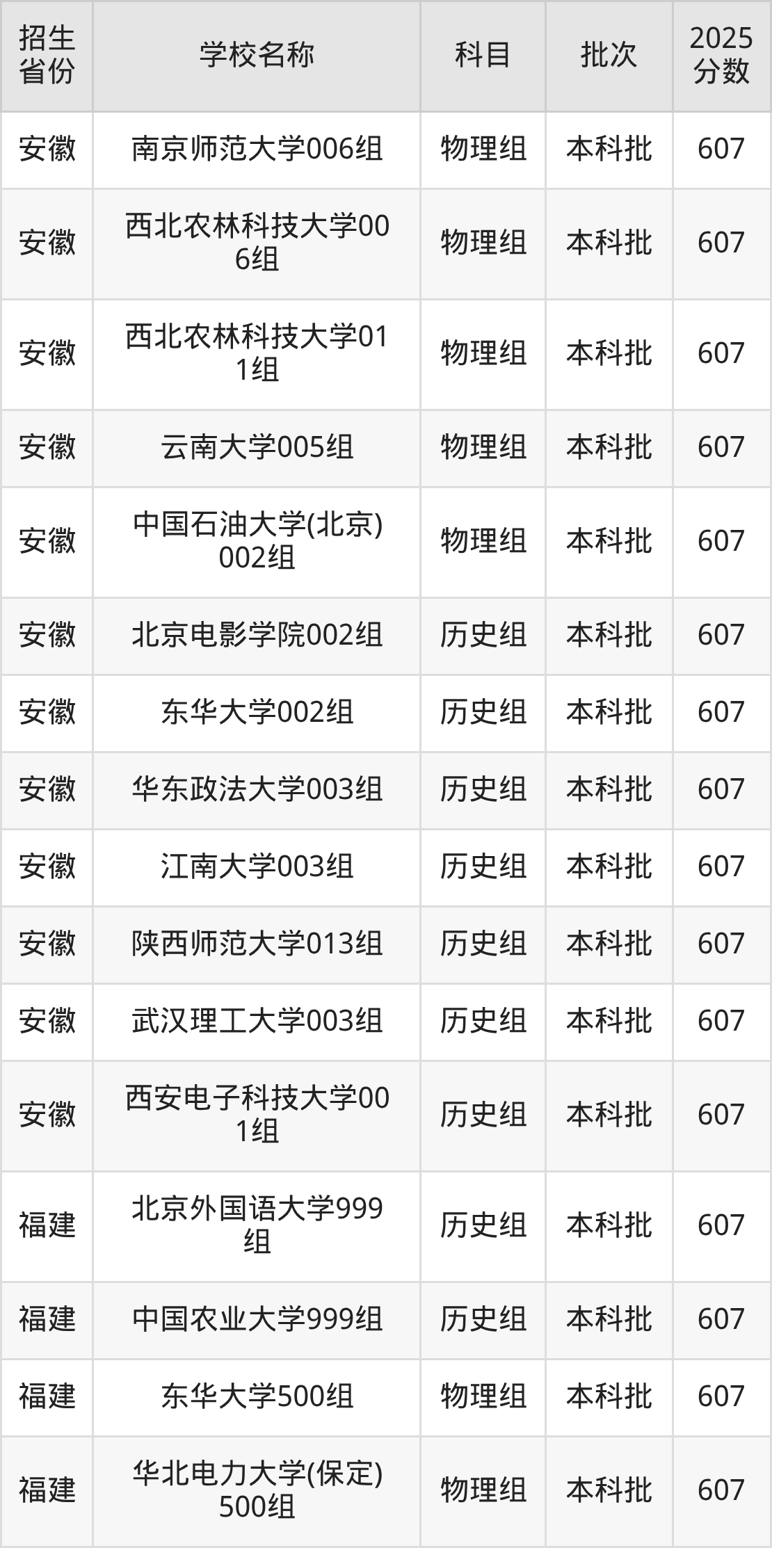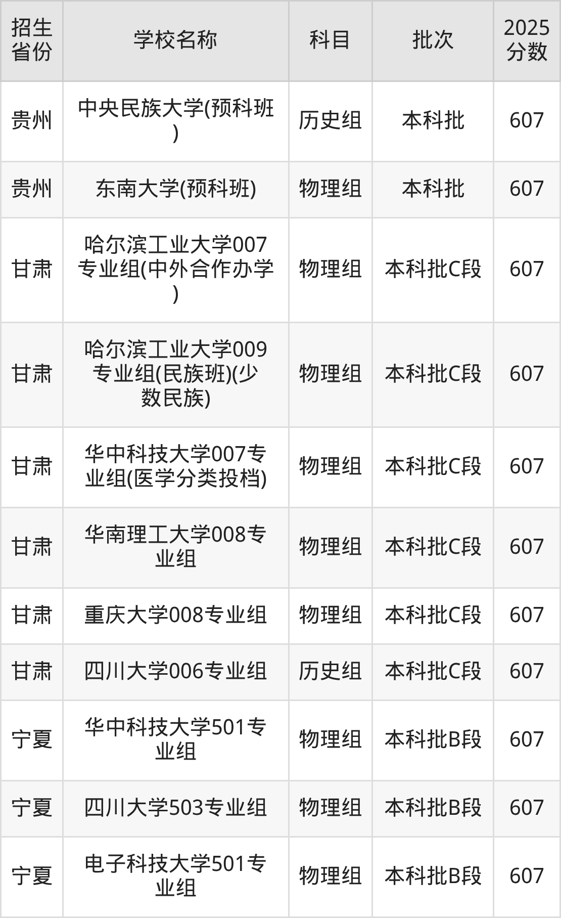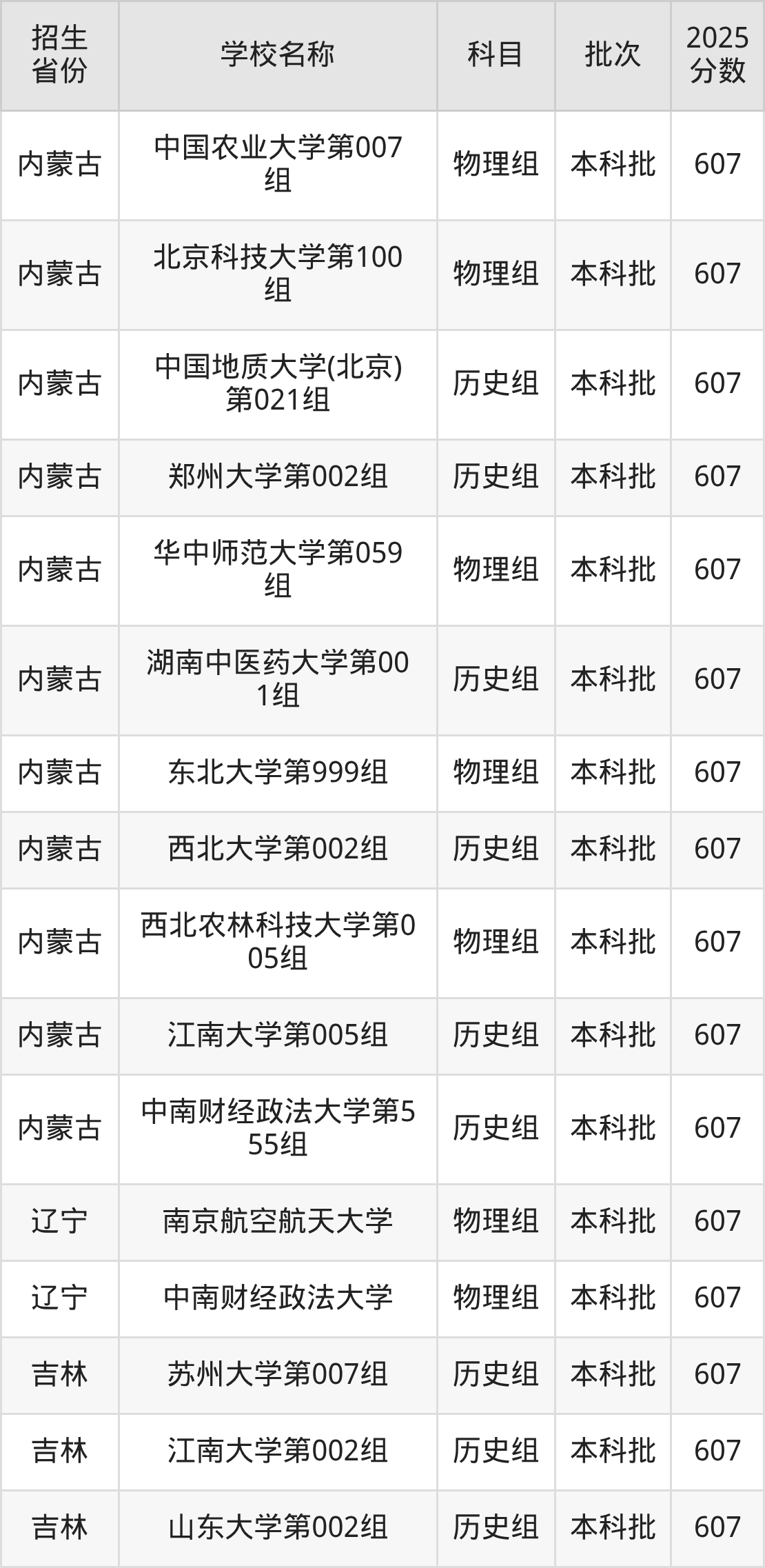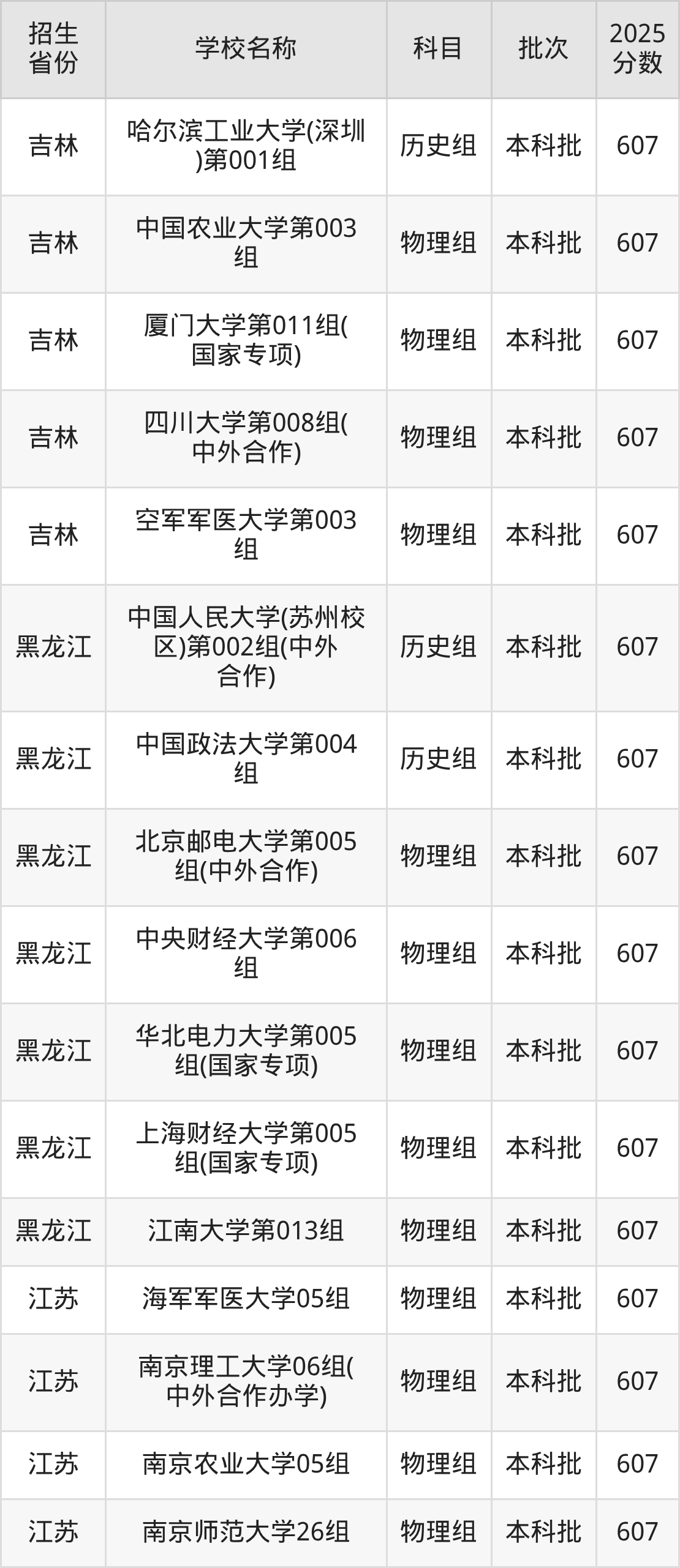 筛选全国各省2025年录取分数线为607分的重点大学如下:
