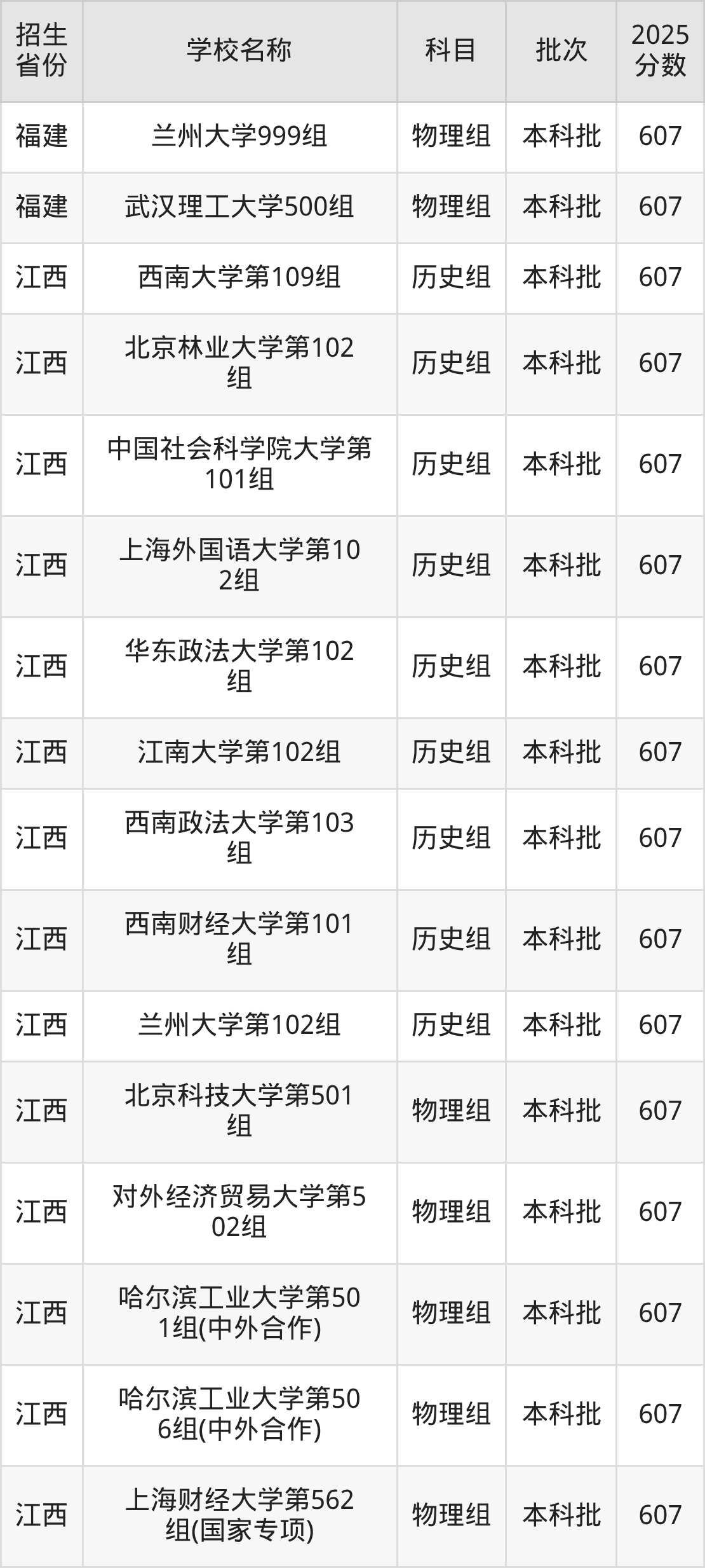 江西省历史组分数线是607分的重点大学有:西南大学、北京林业大学、中国社会科学院大学、上海外国语大学、华东政法大学、江南大学、西南政法大学、西南财经大学、兰州大学。