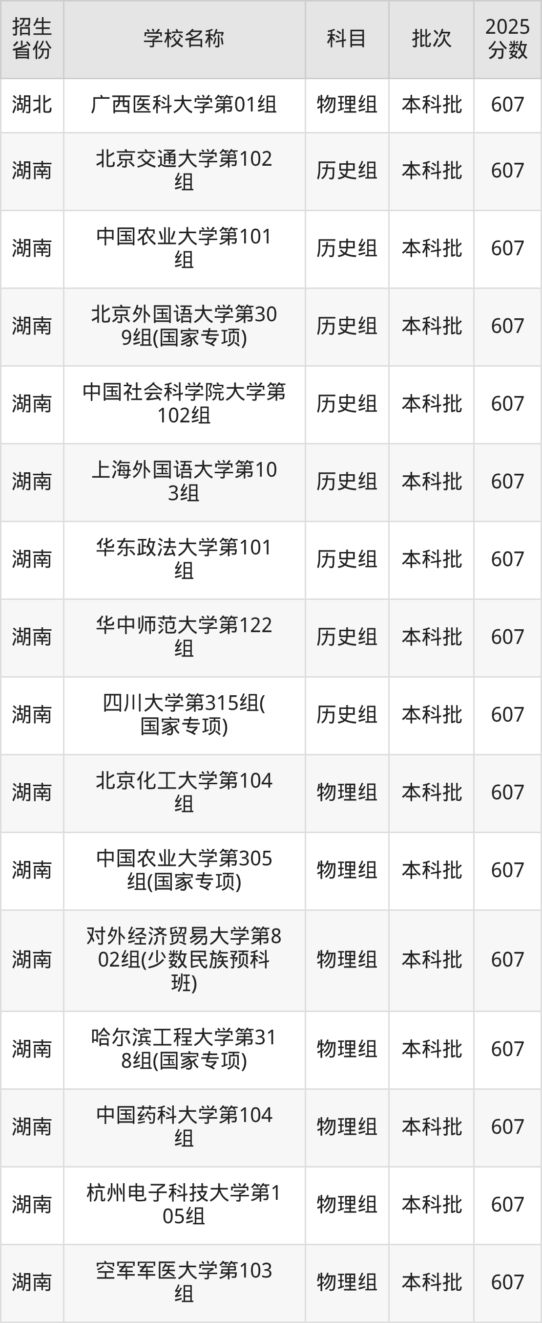 湖南省历史组分数线是607分的重点大学有:北京交通大学、中国农业大学、北京外国语大学、中国社会科学院大学、上海外国语大学、华东政法大学、华中师范大学、四川大学。