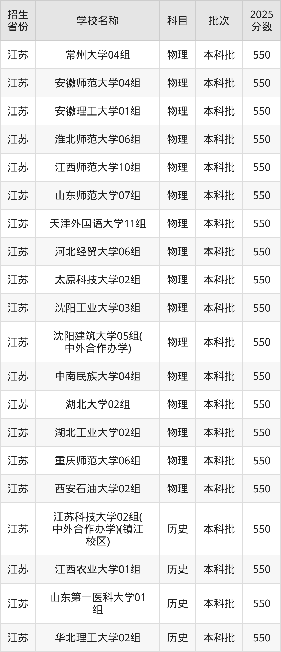 江苏省历史组分数线是550分的一本大学有:江苏科技大学、江西农业大学、山东第一医科大学、华北理工大学、三峡大学、西华大学、西安石油大学、兰州交通大学。