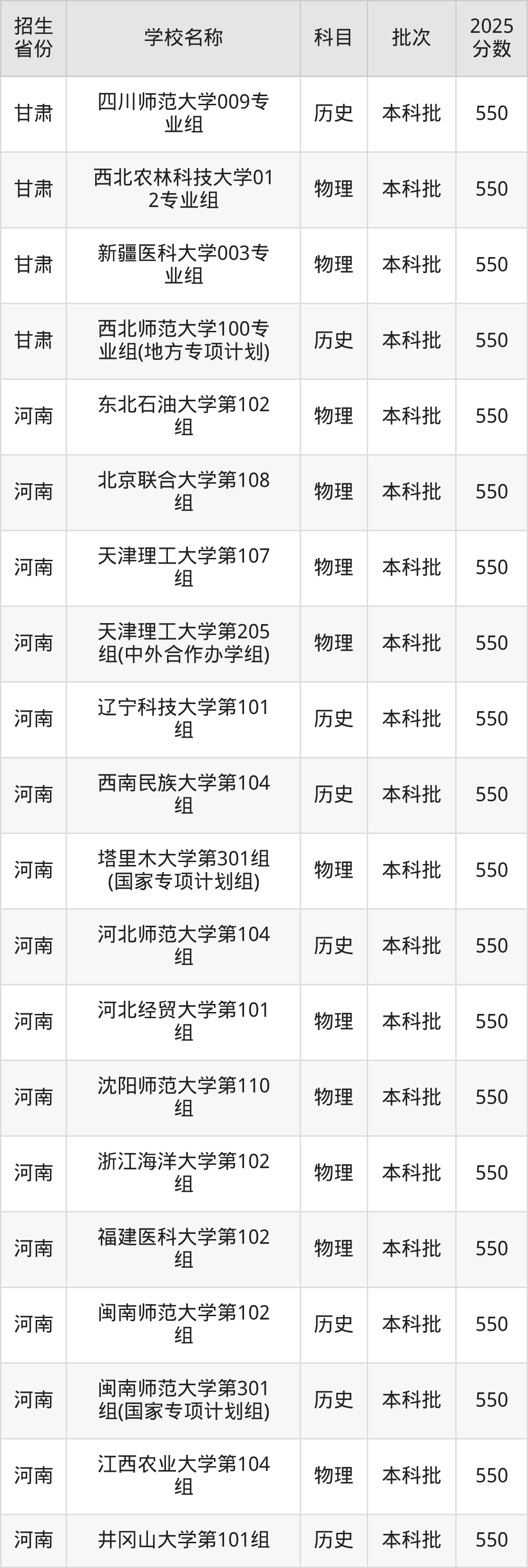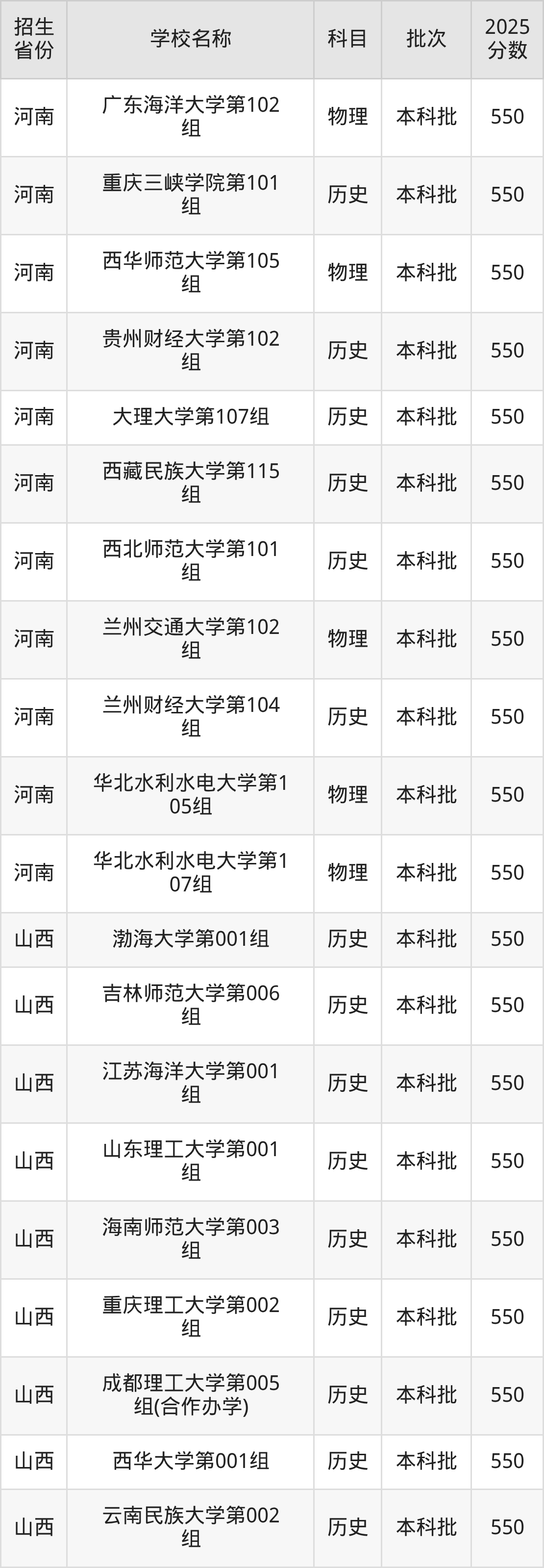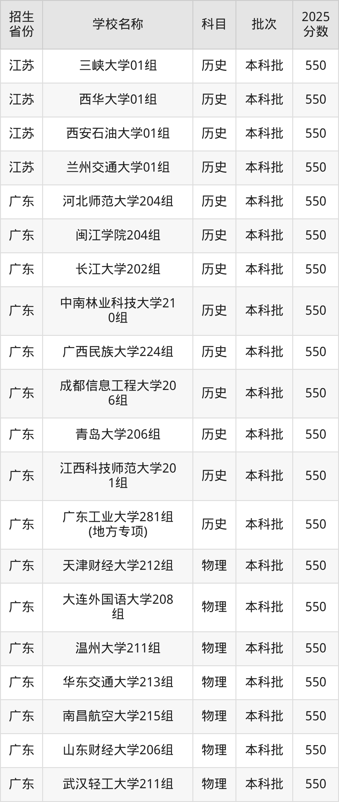 筛选全国各省2025年录取分数线为550分的一本大学如下: