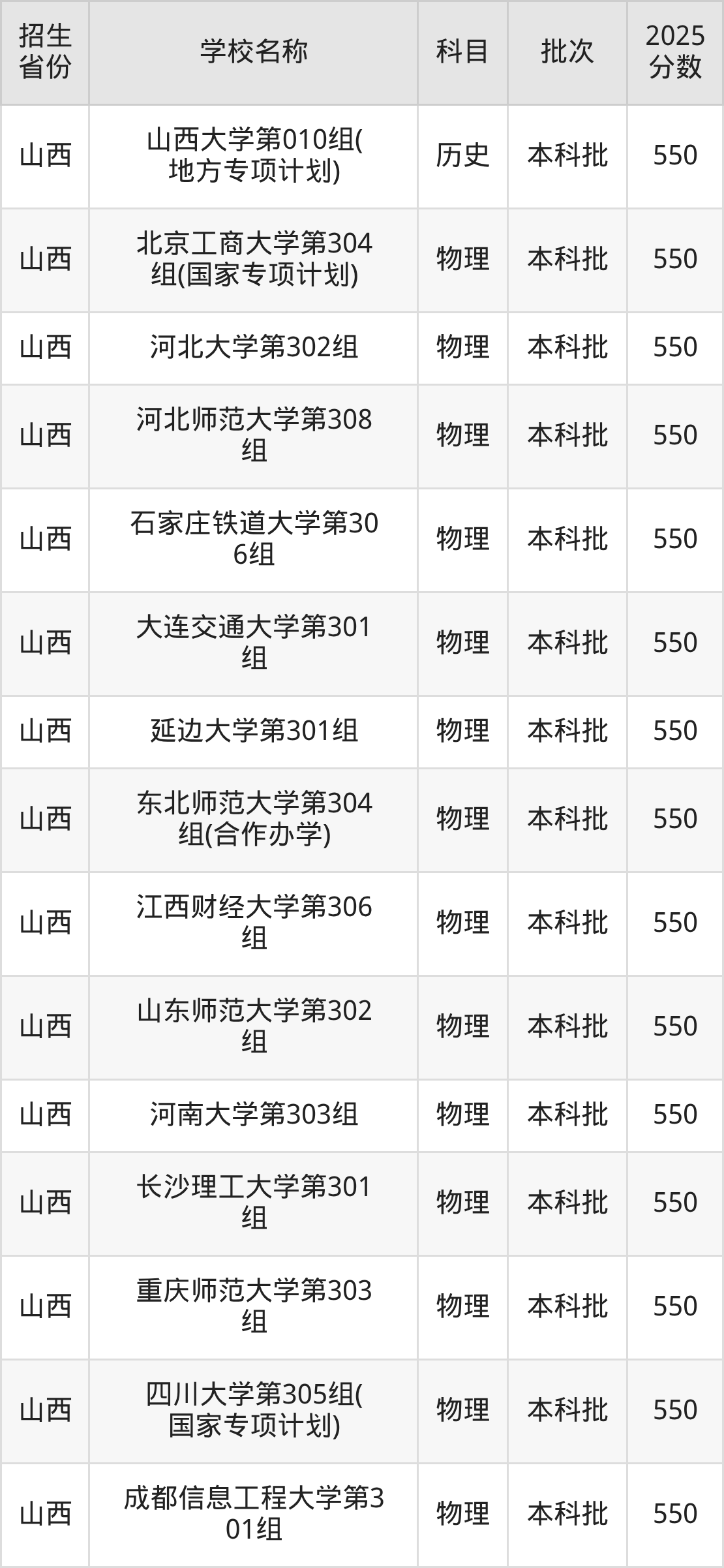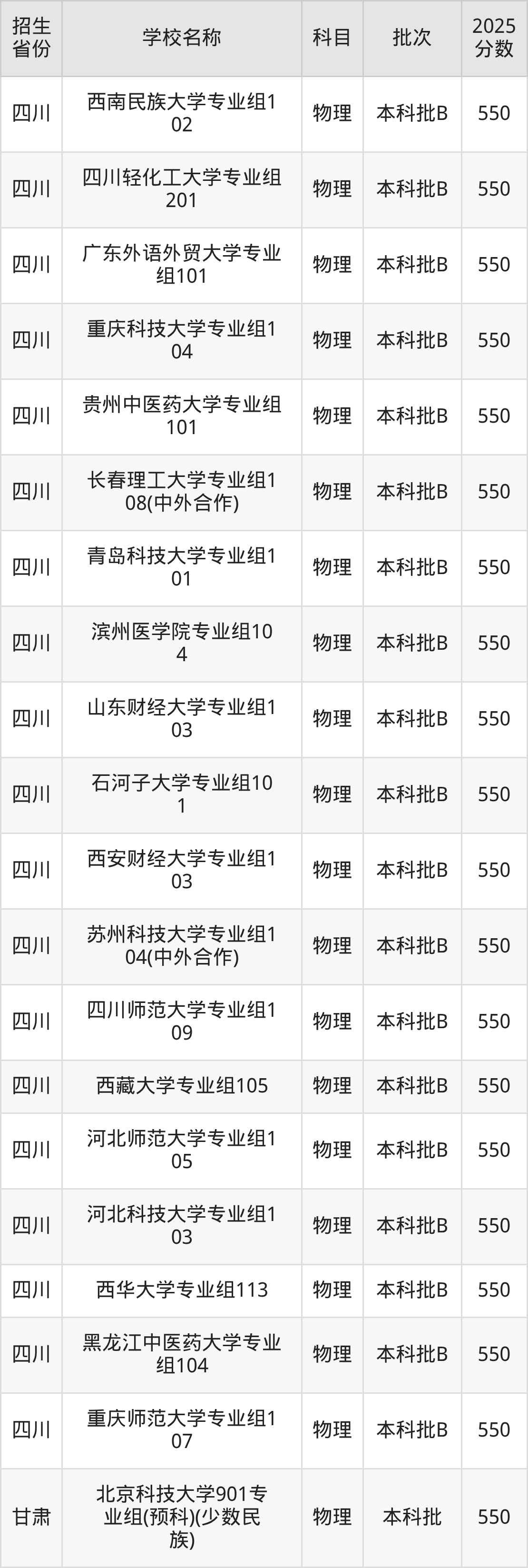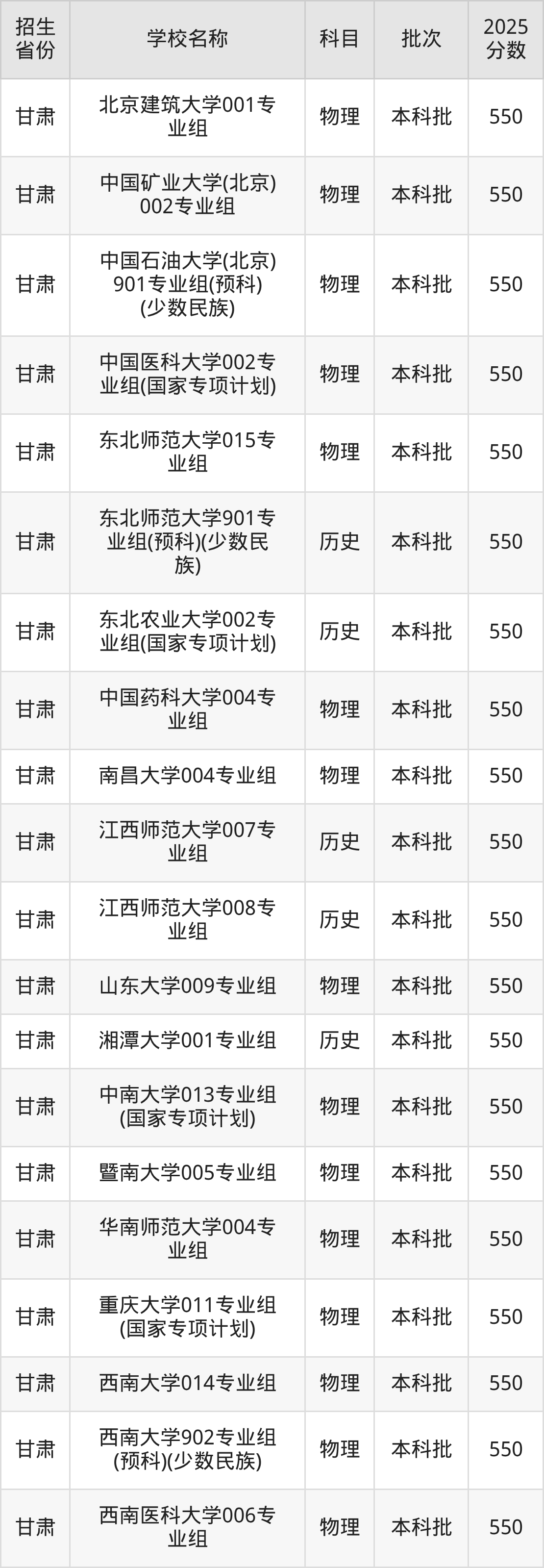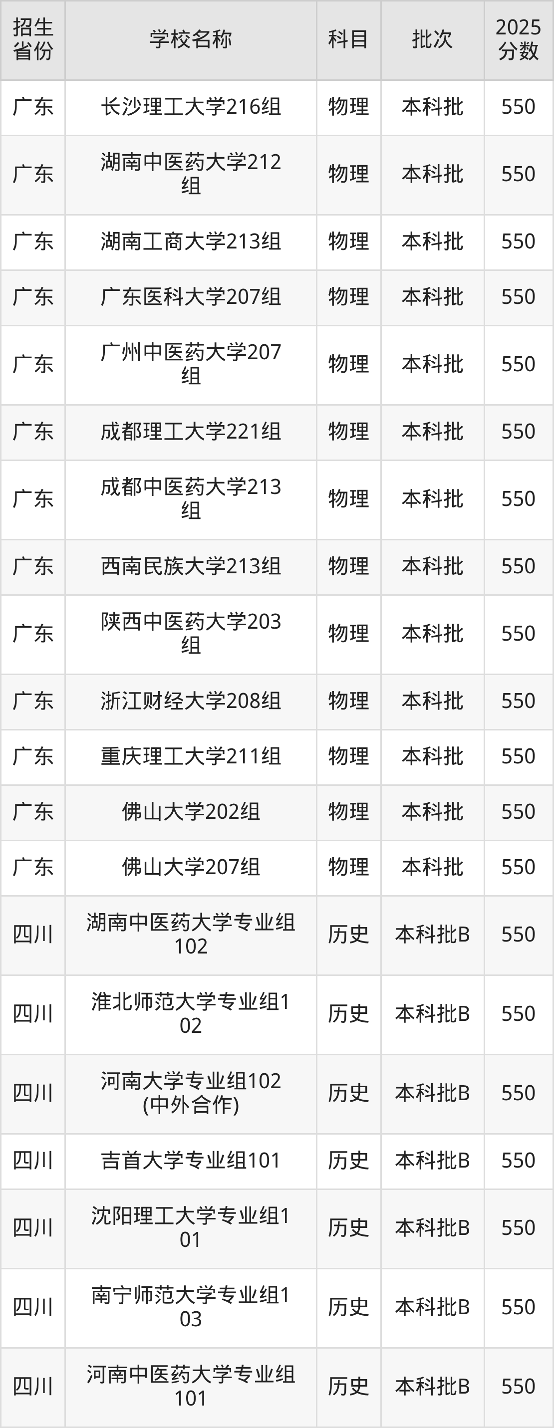 筛选全国各省2025年录取分数线为550分的一本大学如下: