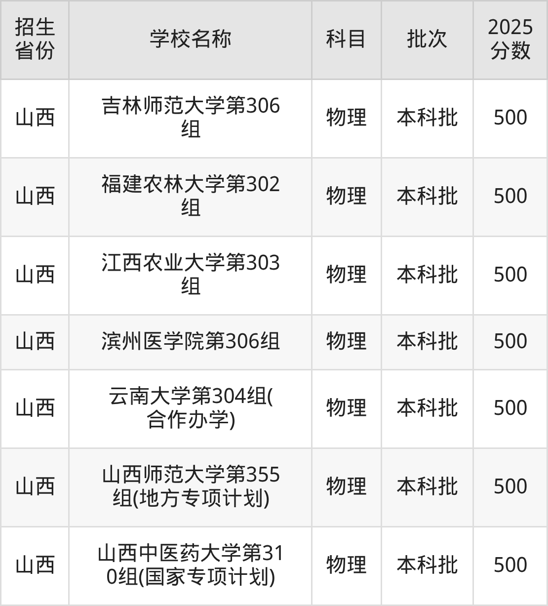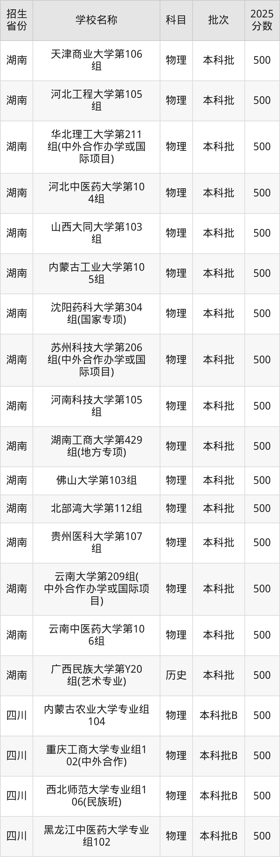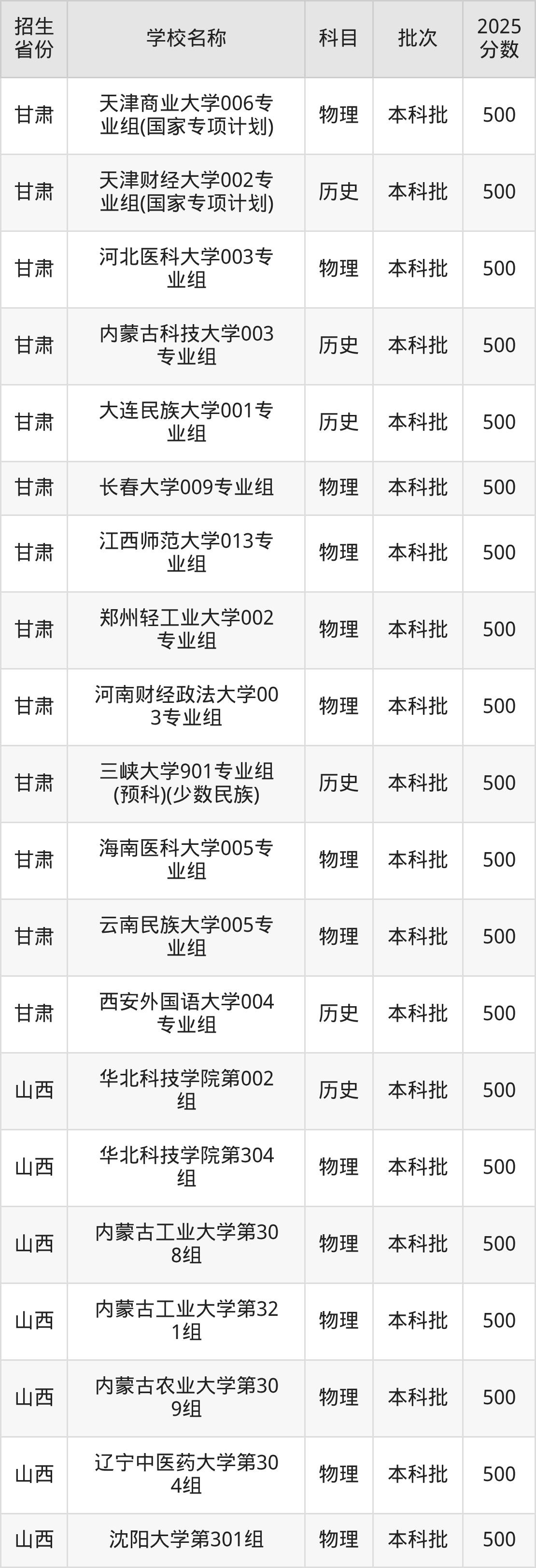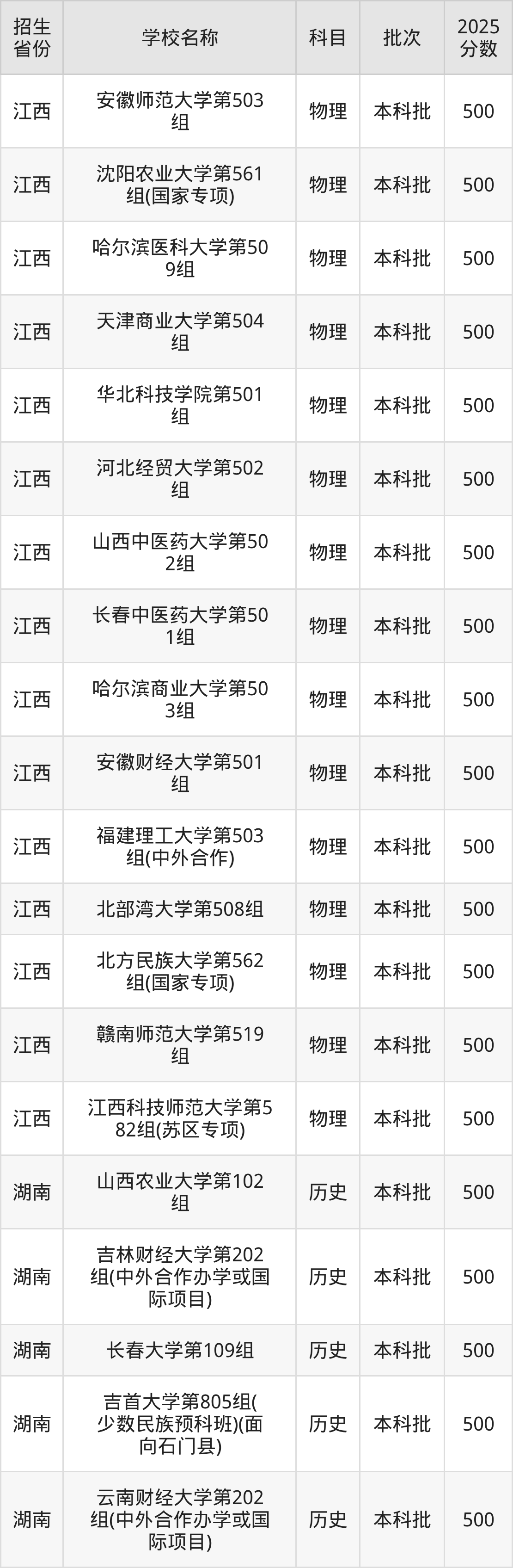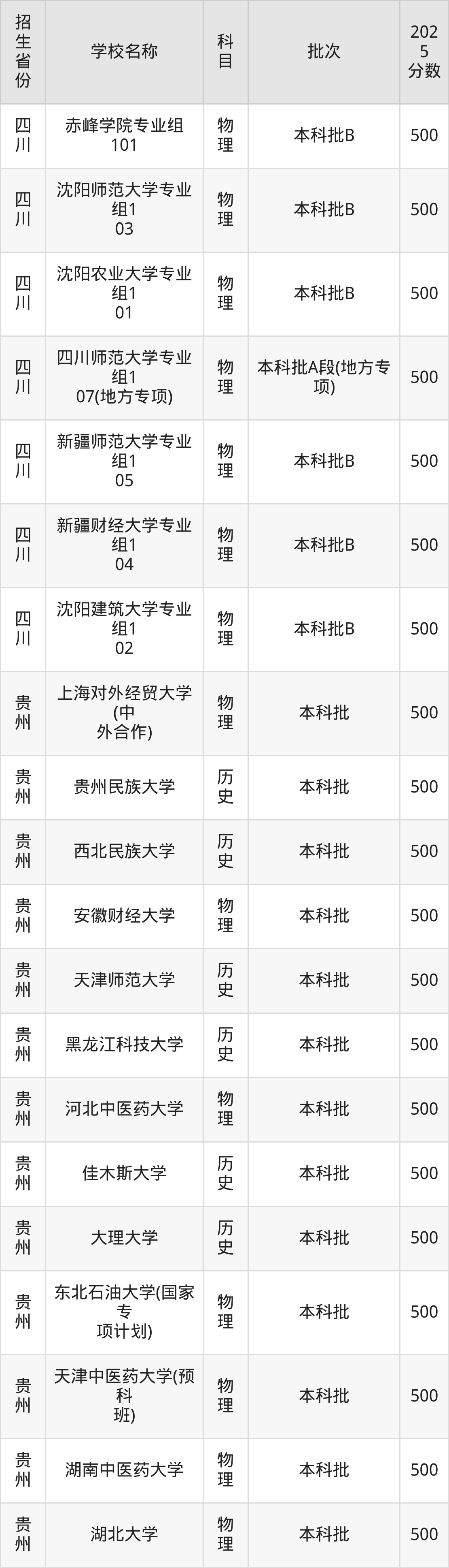 筛选全国各省2025年录取分数线为500分的一本大学如下: