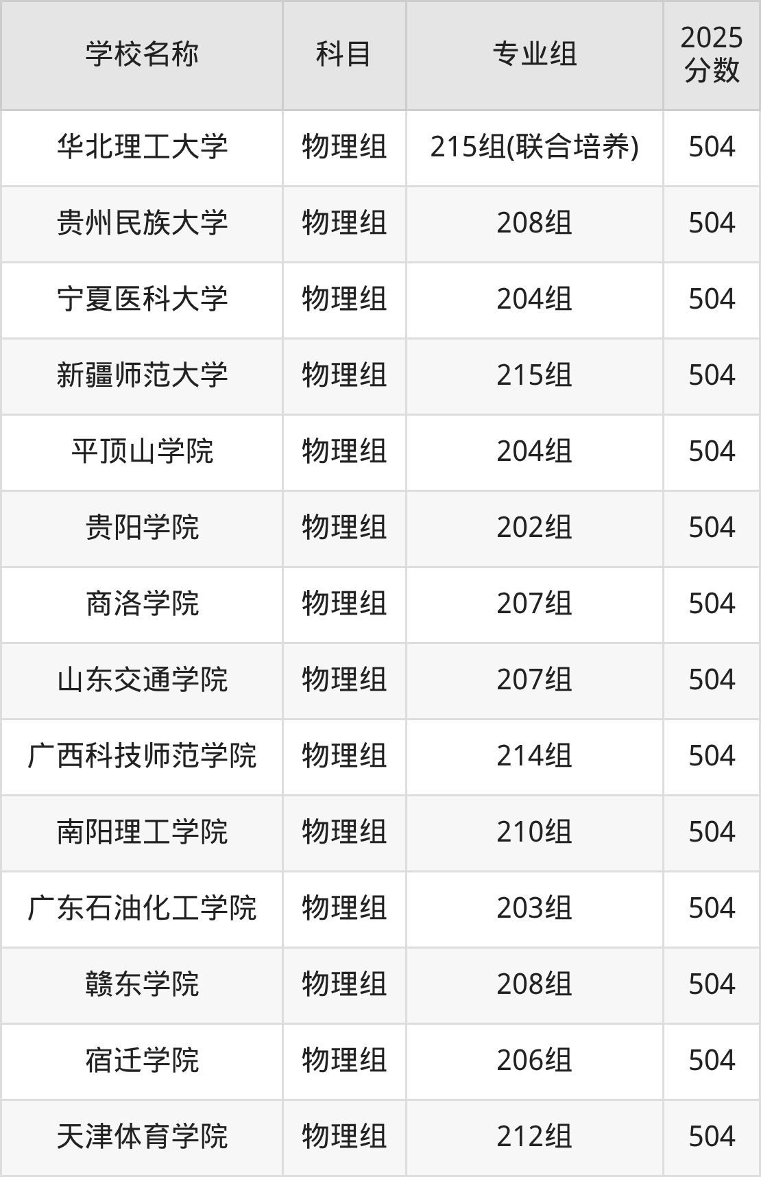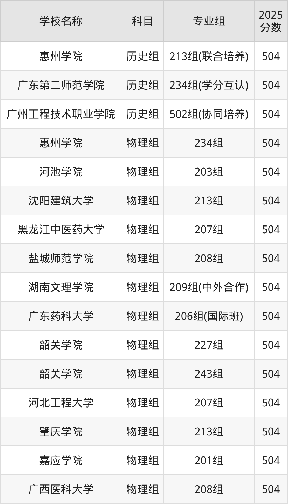 广东高考录取分数线在504分左右的公办院校专业组一共有30个,其中历史组有:惠州学院(504分)、广东第二师范学院(504分)、广州工程技术职业学院(504分),物理组有:惠州学院(504分)、河池学院(504分)、沈阳建筑大学(504分)。