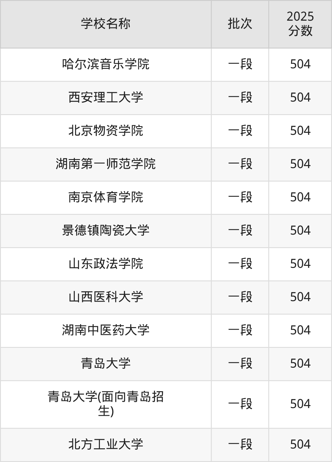 山东高考录取分数线在504分左右的公办大学一共有12所。分别是哈尔滨音乐学院(504分)、西安理工大学(504分)、北京物资学院(504分)