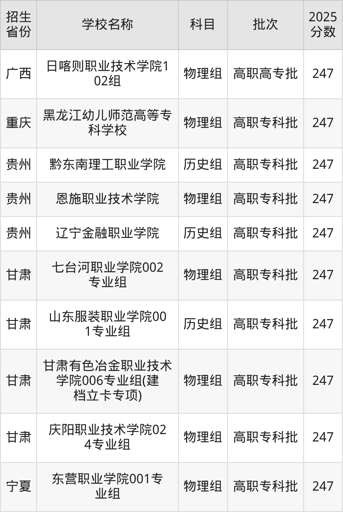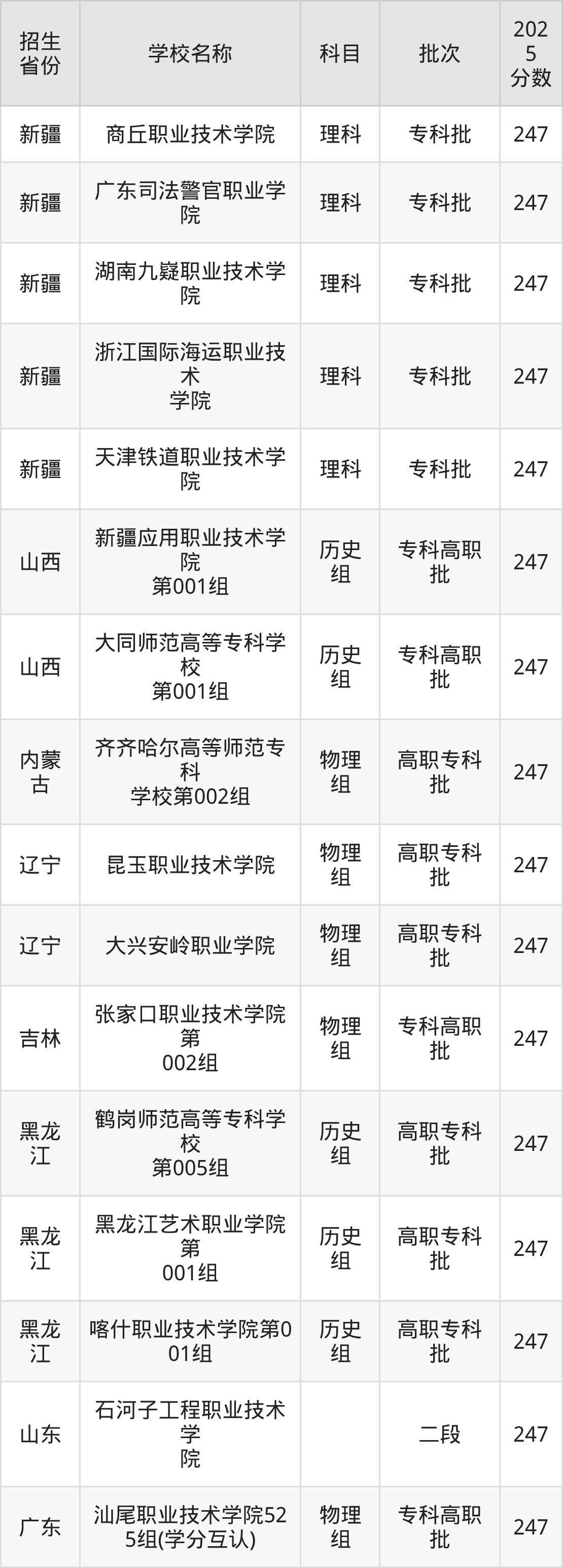 筛选全国各省2025年录取分数线为247分的公办专科大学如下: