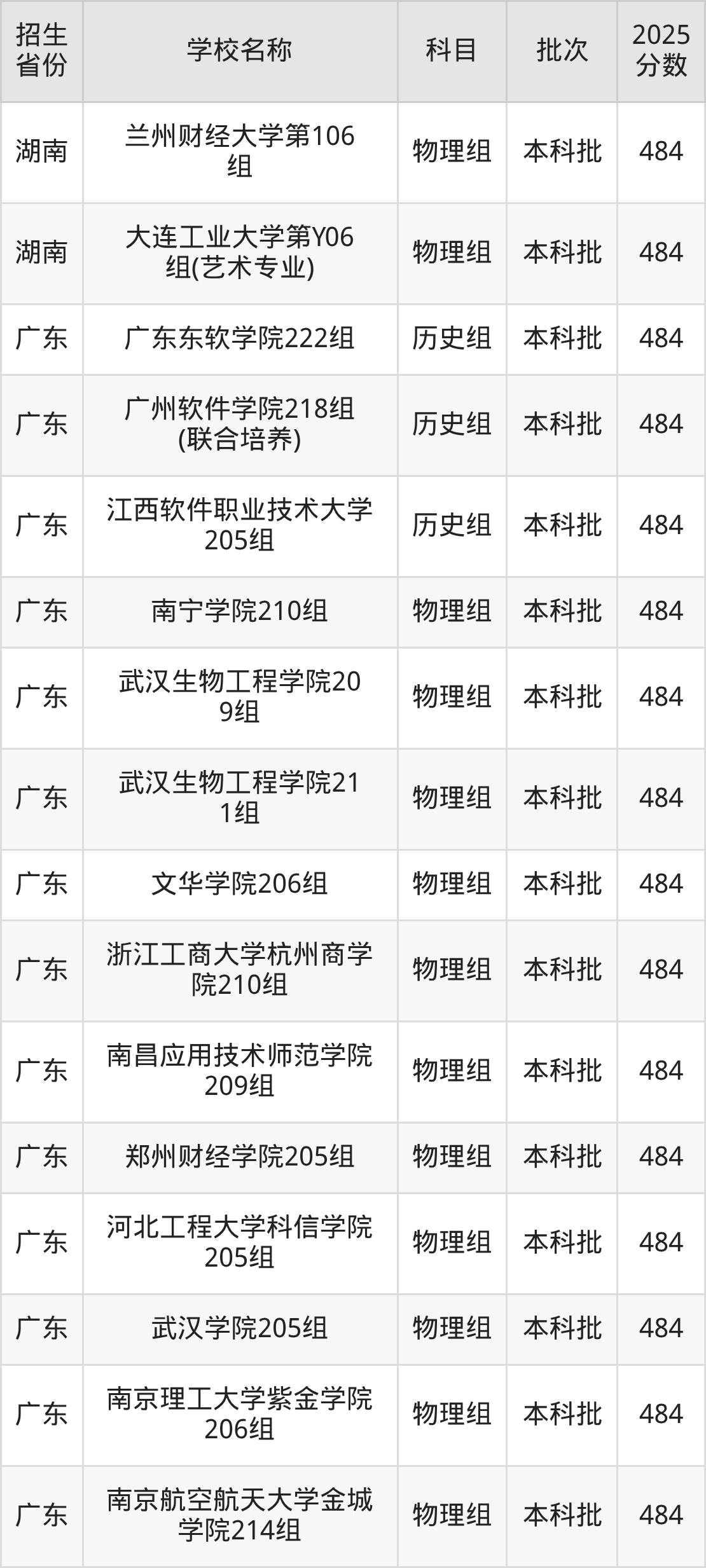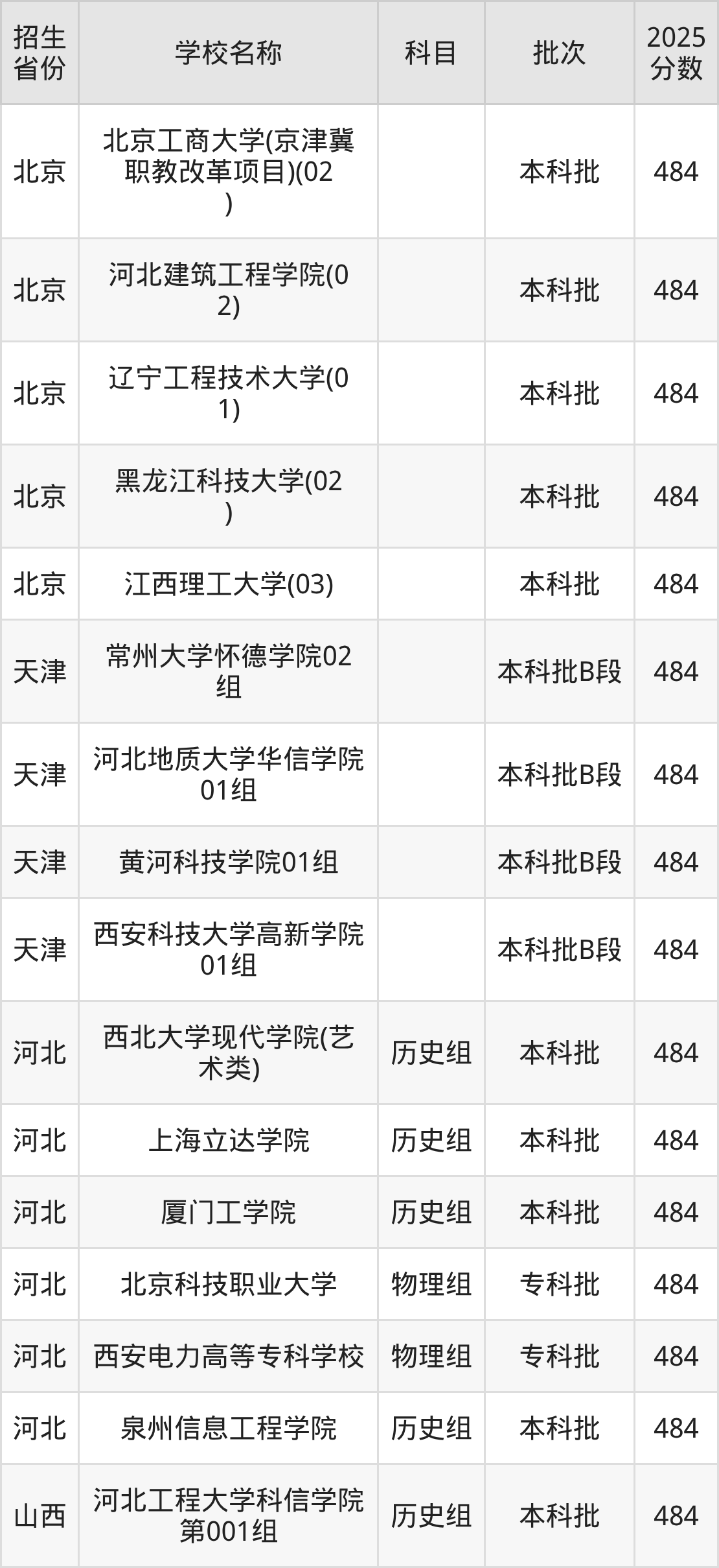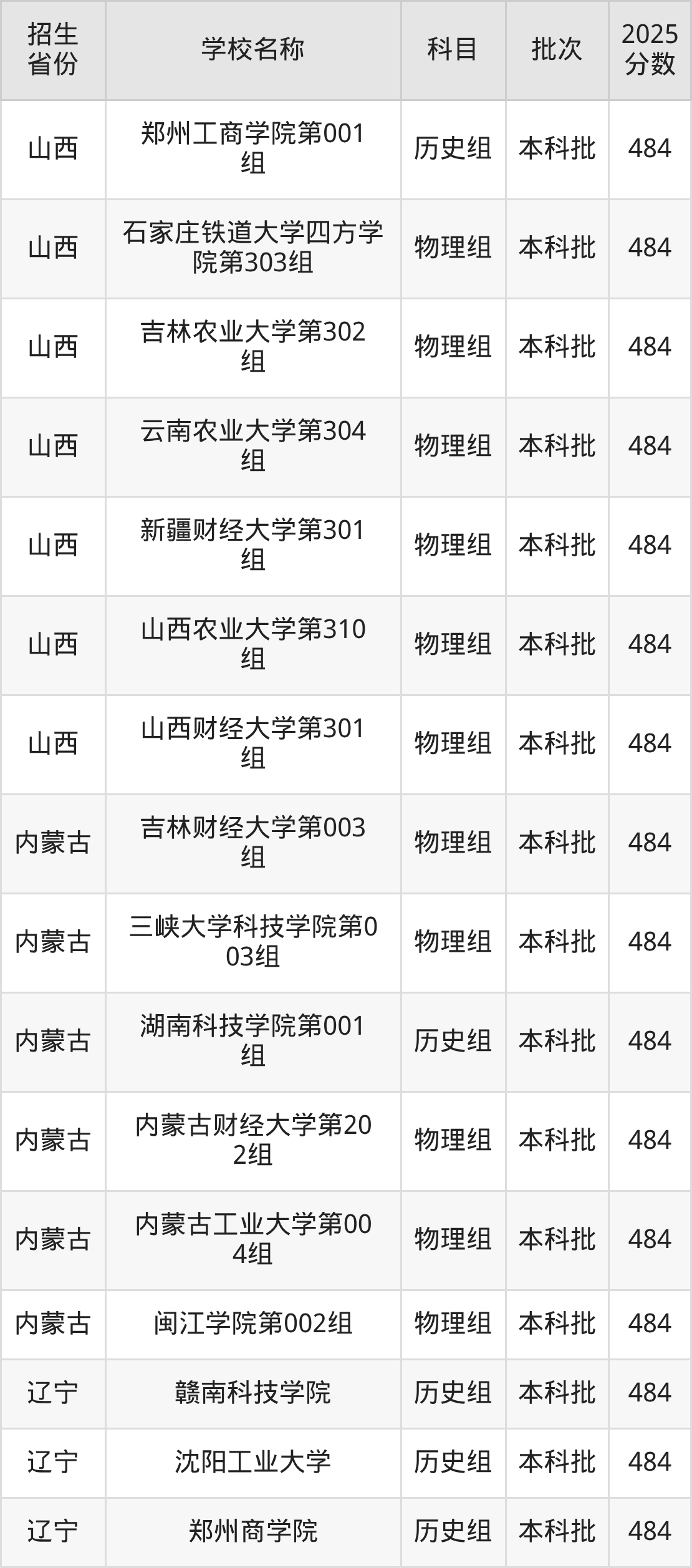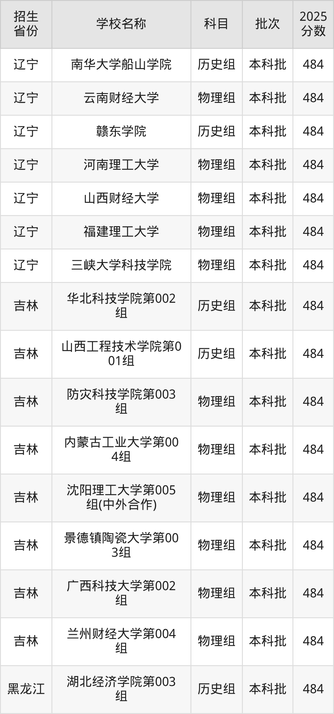 筛选全国各省2025年录取分数线为484分的理科大学如下: