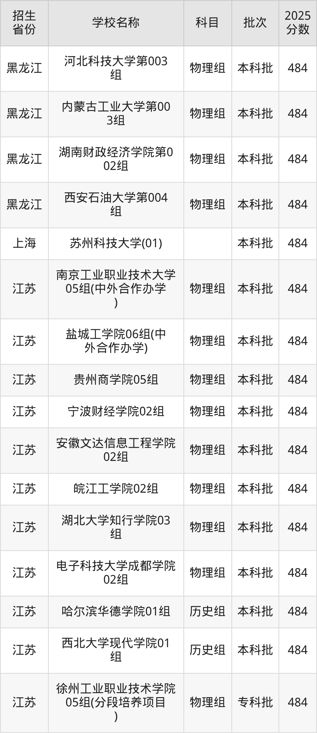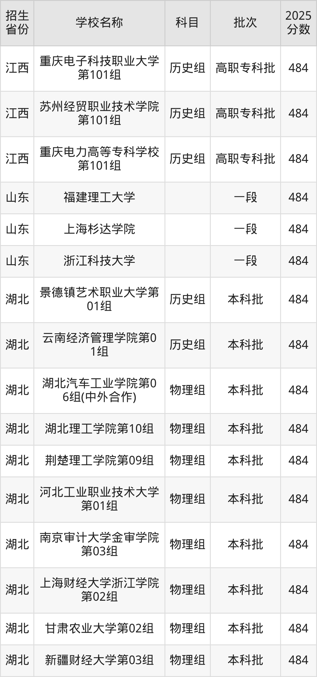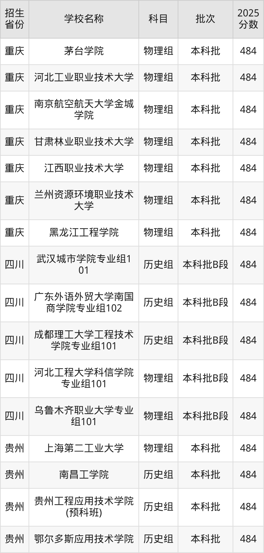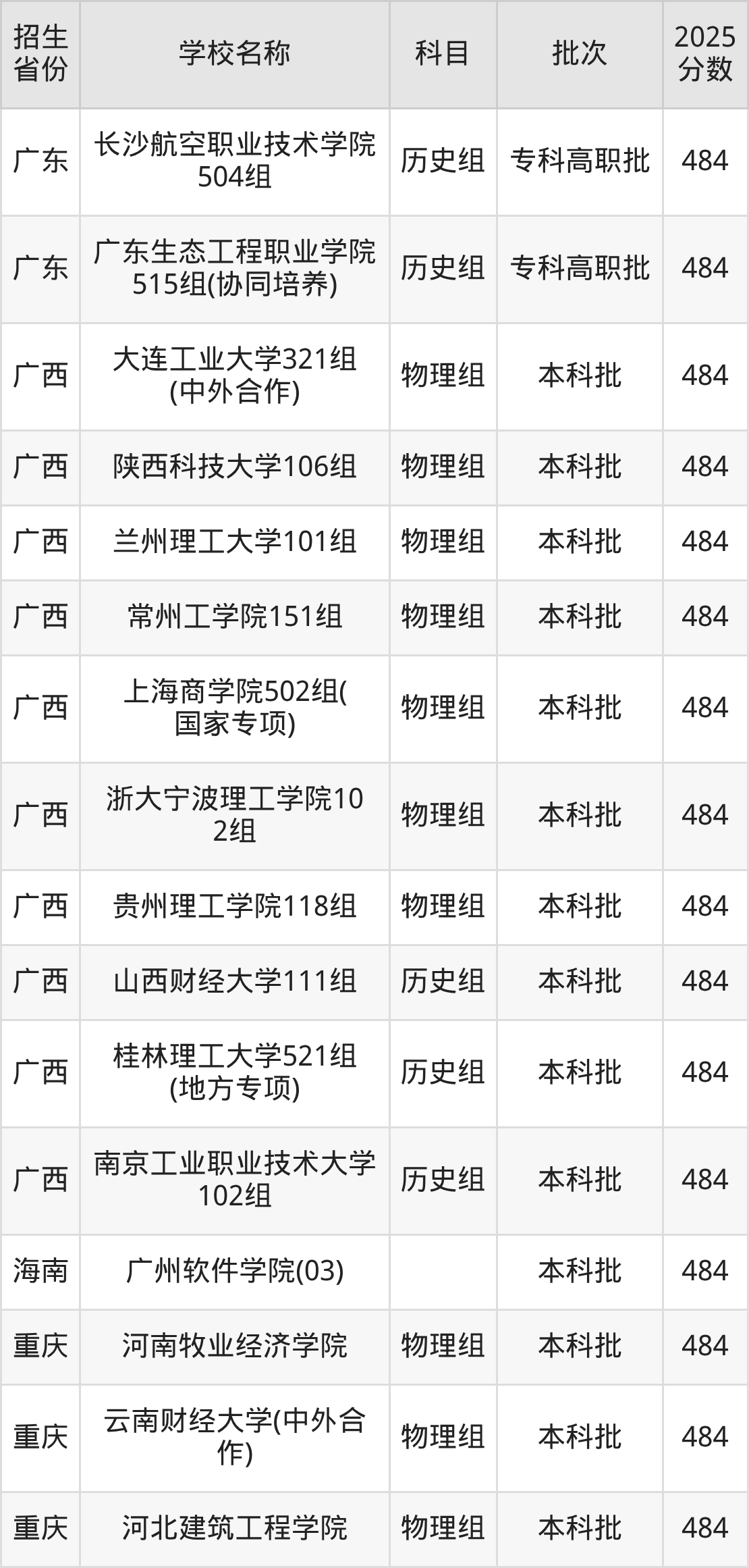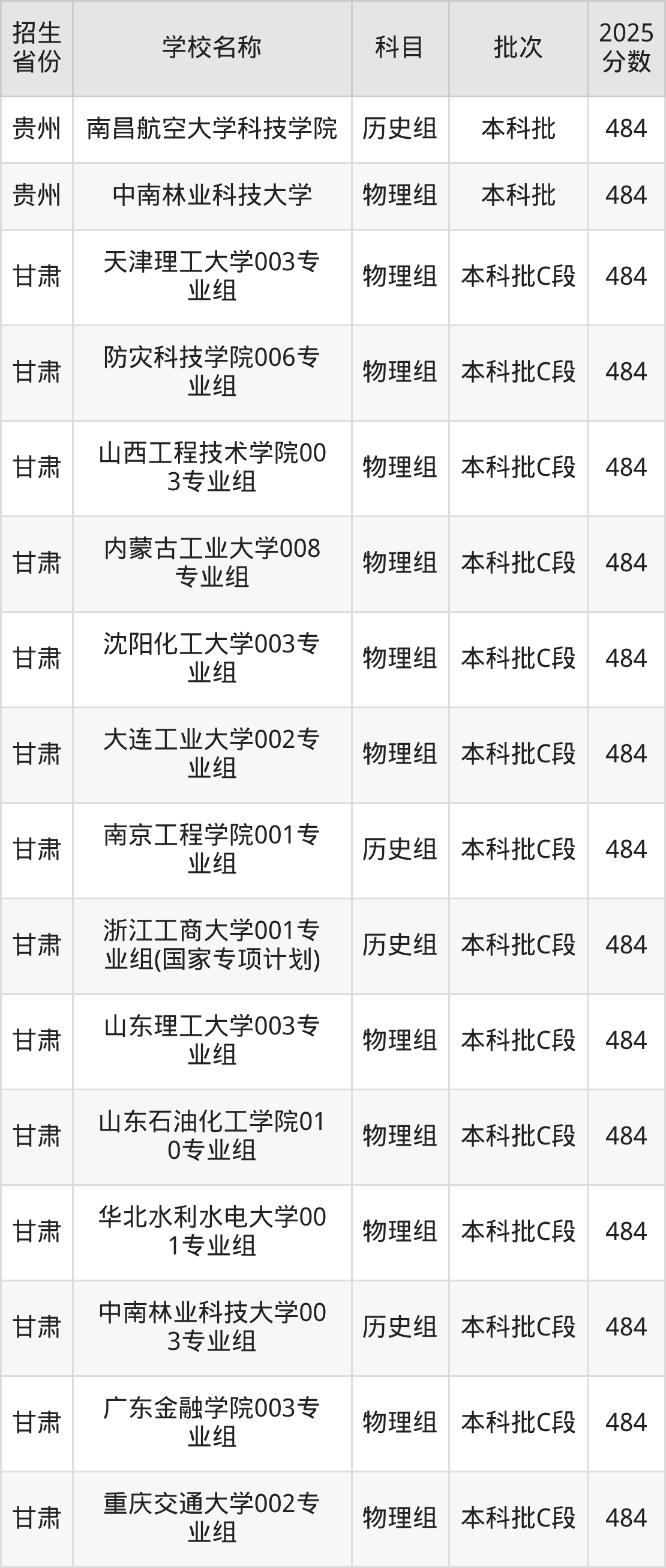 筛选全国各省2025年录取分数线为484分的理科大学如下: