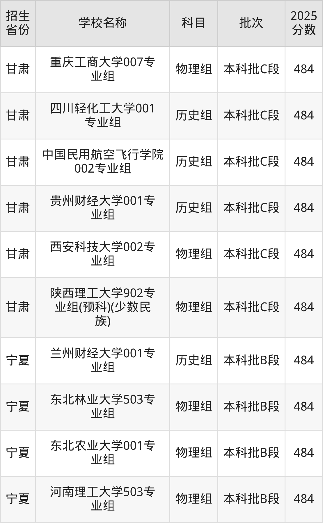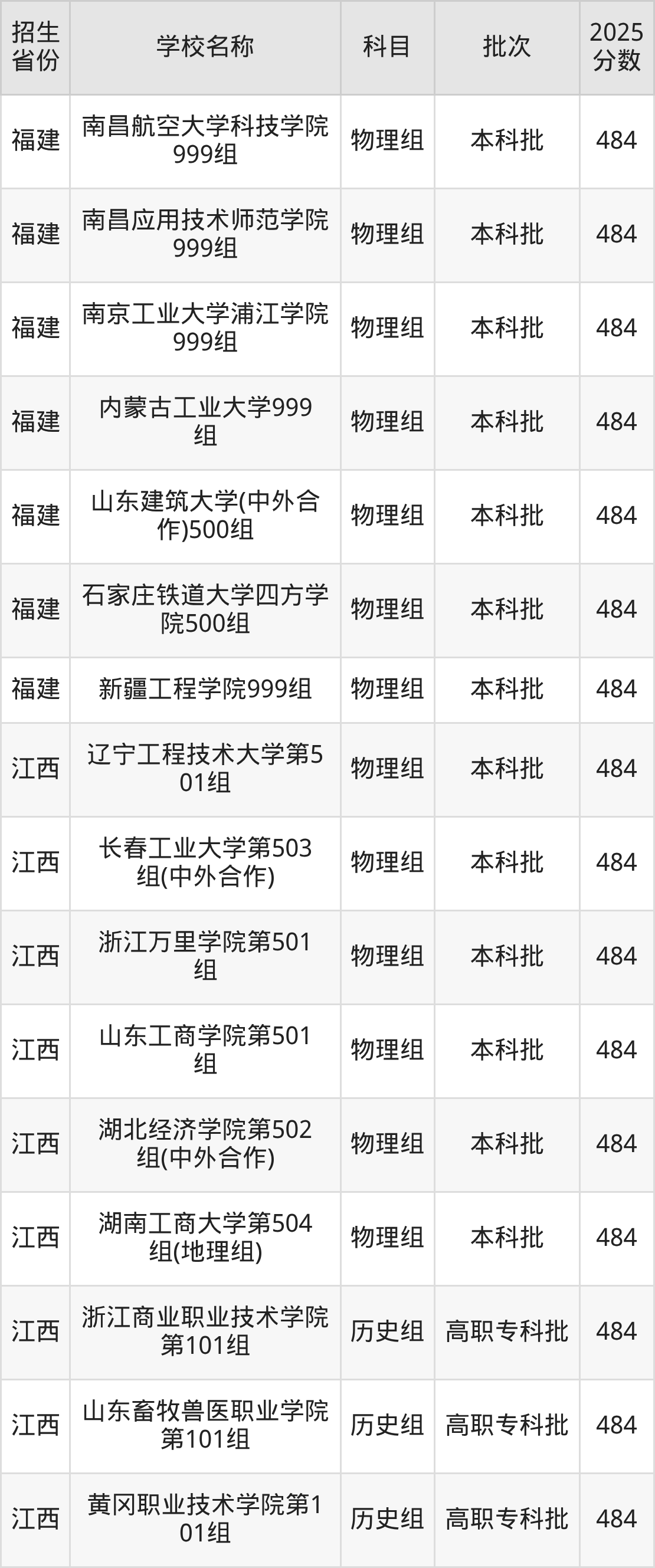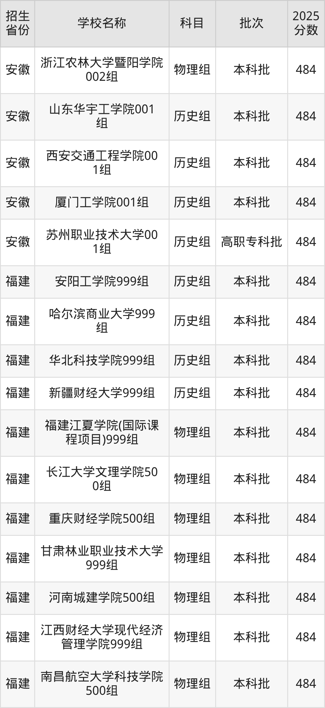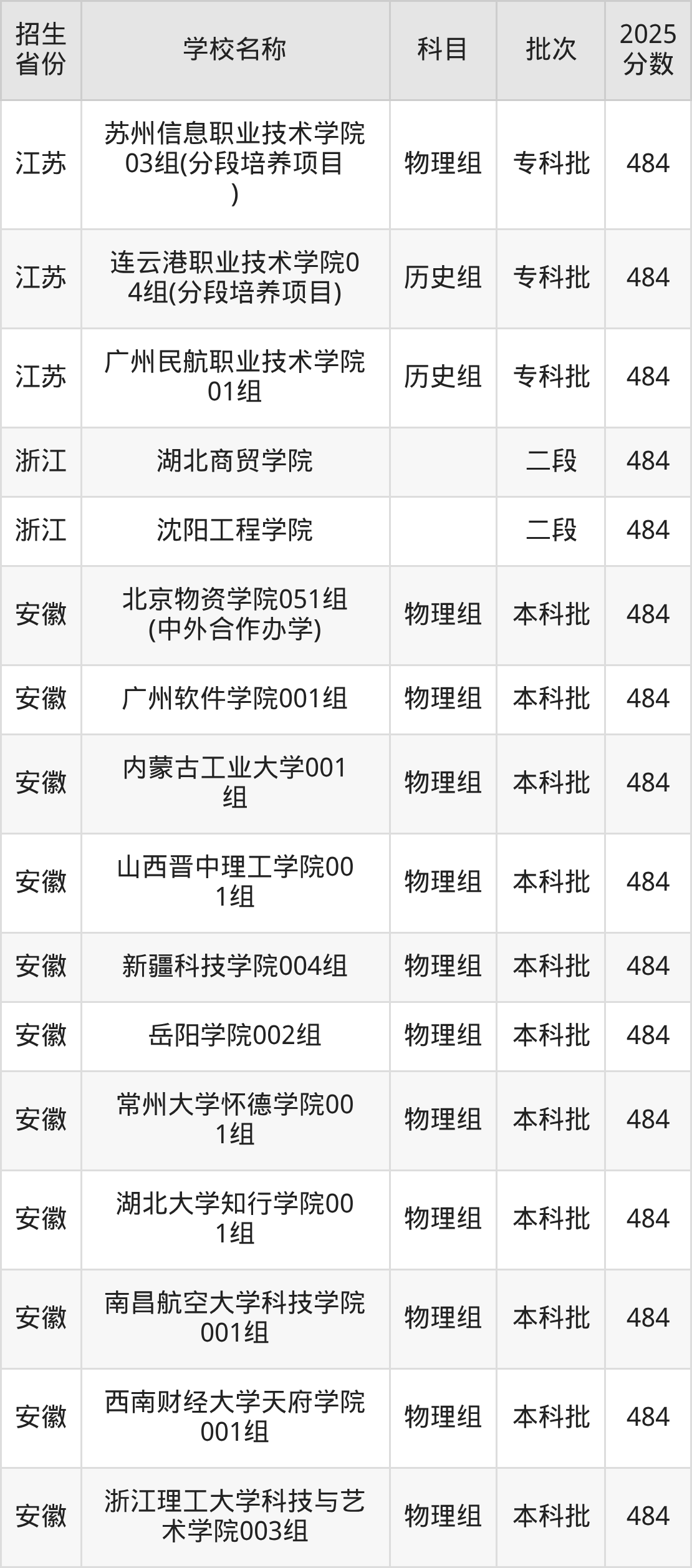 筛选全国各省2025年录取分数线为484分的理科大学如下: