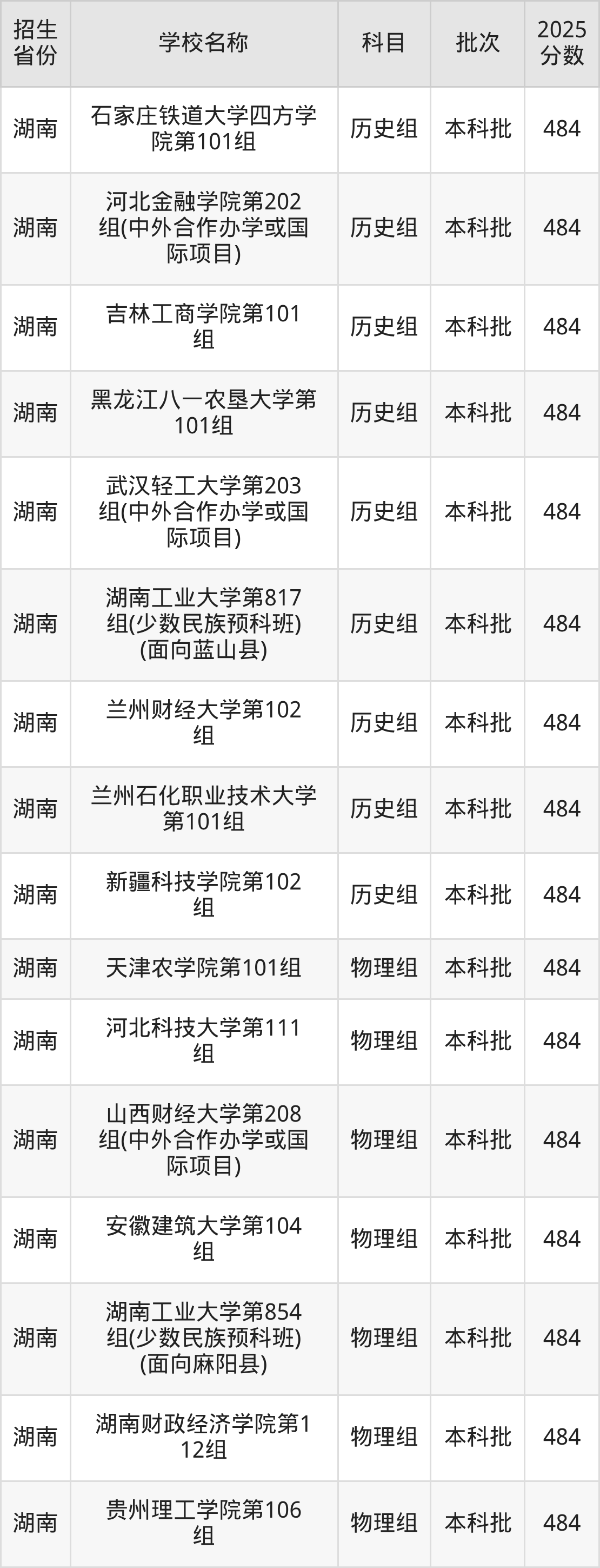 湖南省历史组分数线是484分的理科大学有:石家庄铁道大学四方学院、河北金融学院、吉林工商学院、黑龙江八一农垦大学、武汉轻工大学、湖南工业大学、兰州财经大学、兰州石化职业技术大学、新疆科技学院。