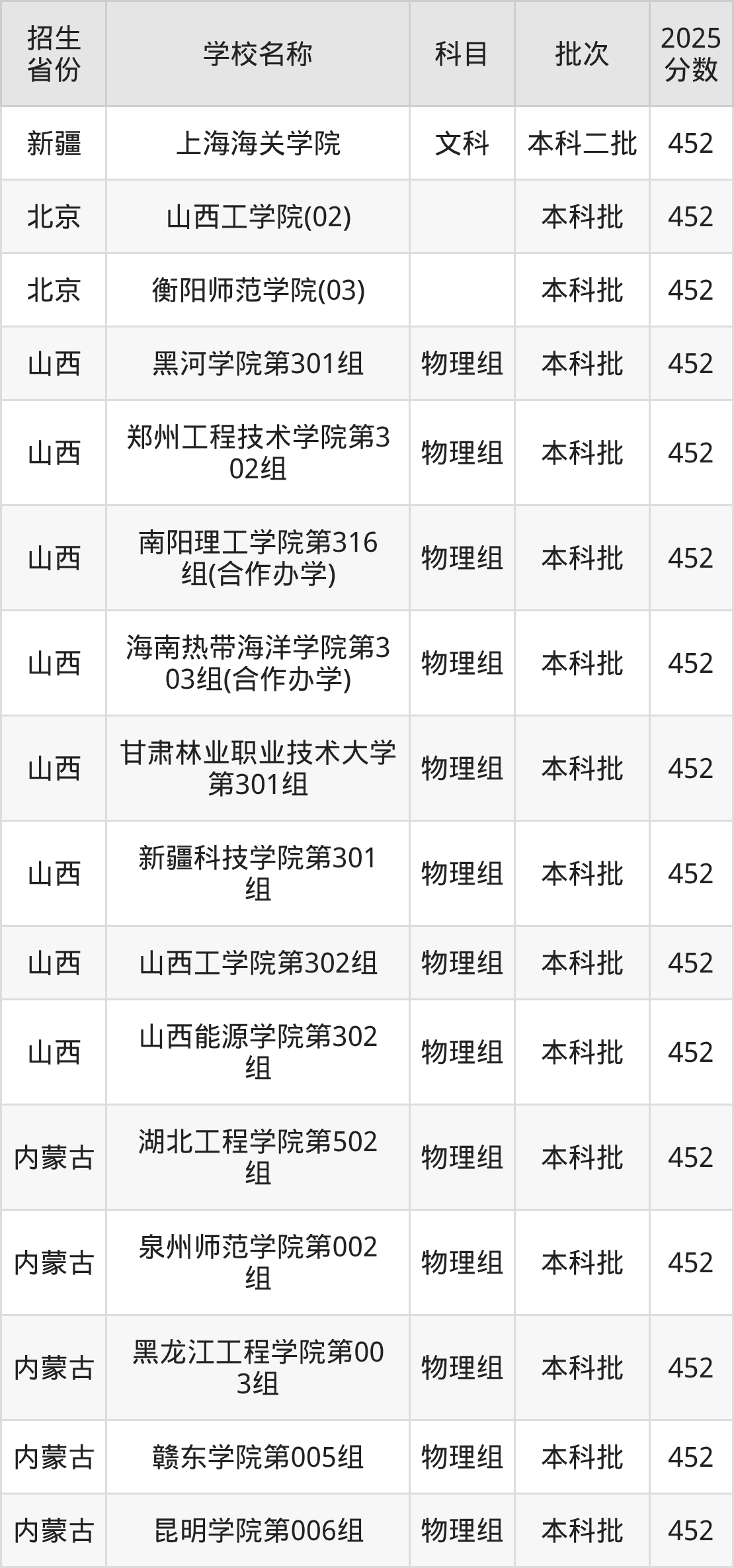452分可以上的大学有上海海关学院、山西工学院、衡阳师范学院、黑河学院等二本公办大学。本文整理了广西、甘肃等全国452分左右的二本公办大学名单,请2026年高考生参考。
