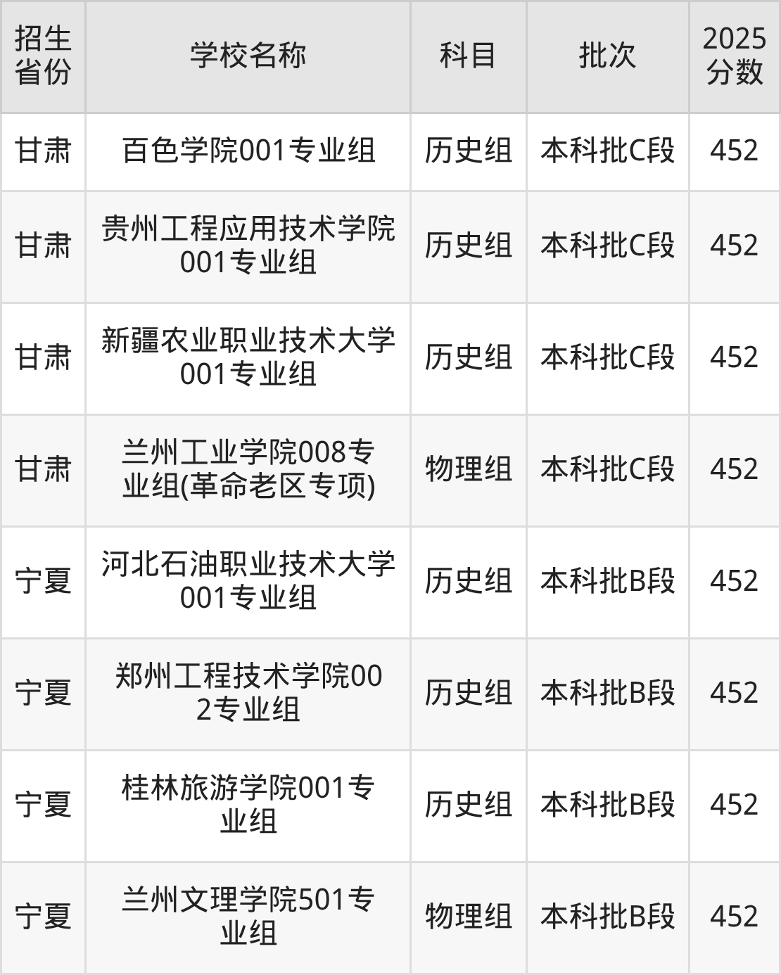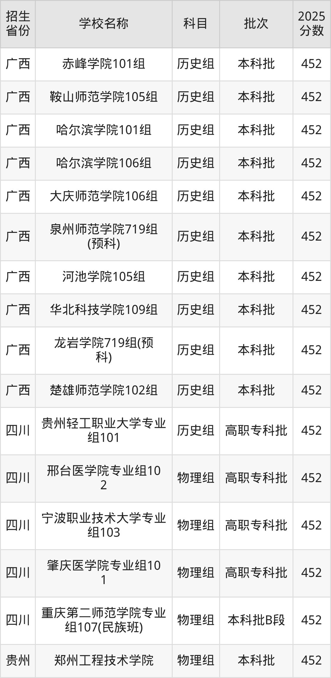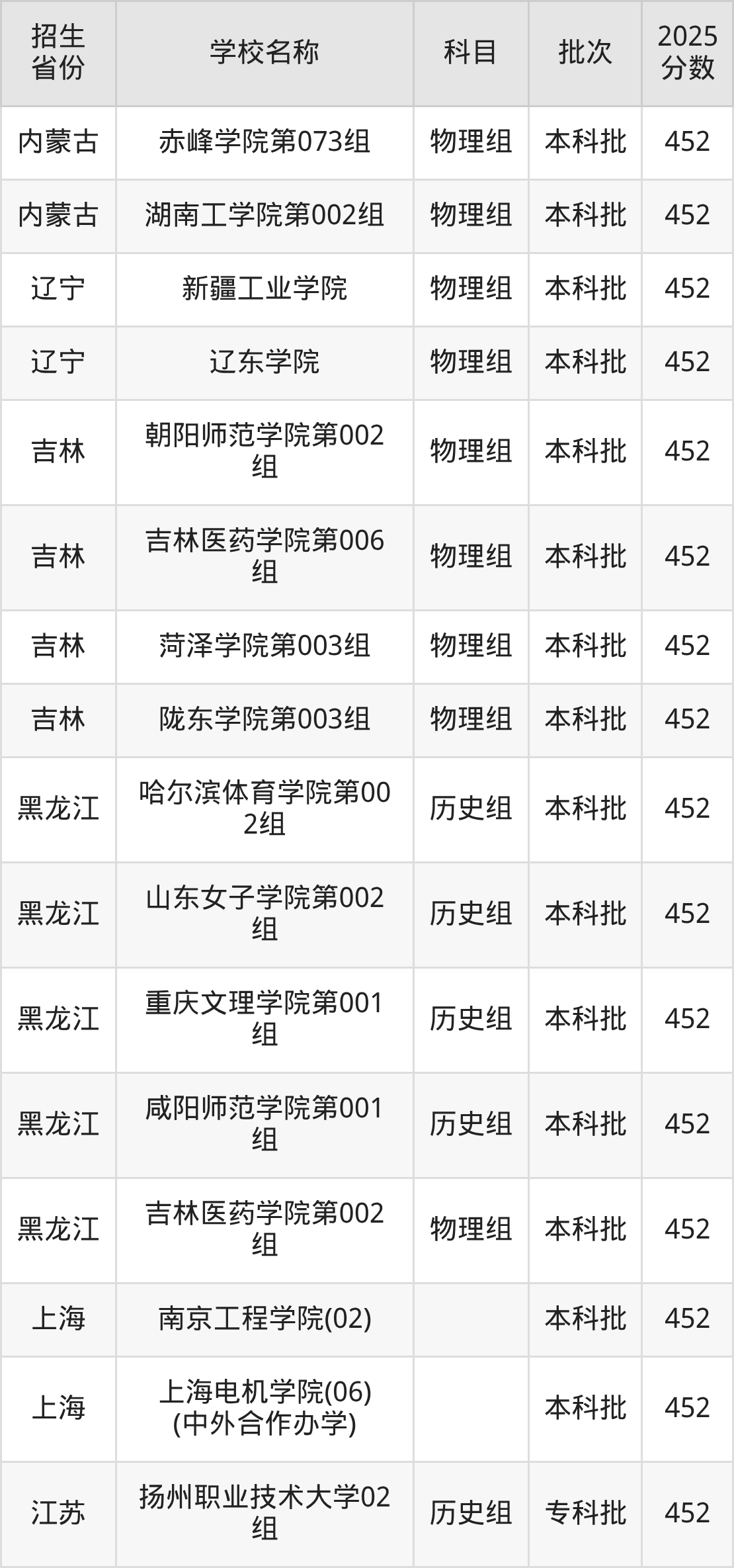 筛选全国各省2025年录取分数线为452分的二本公办大学如下: