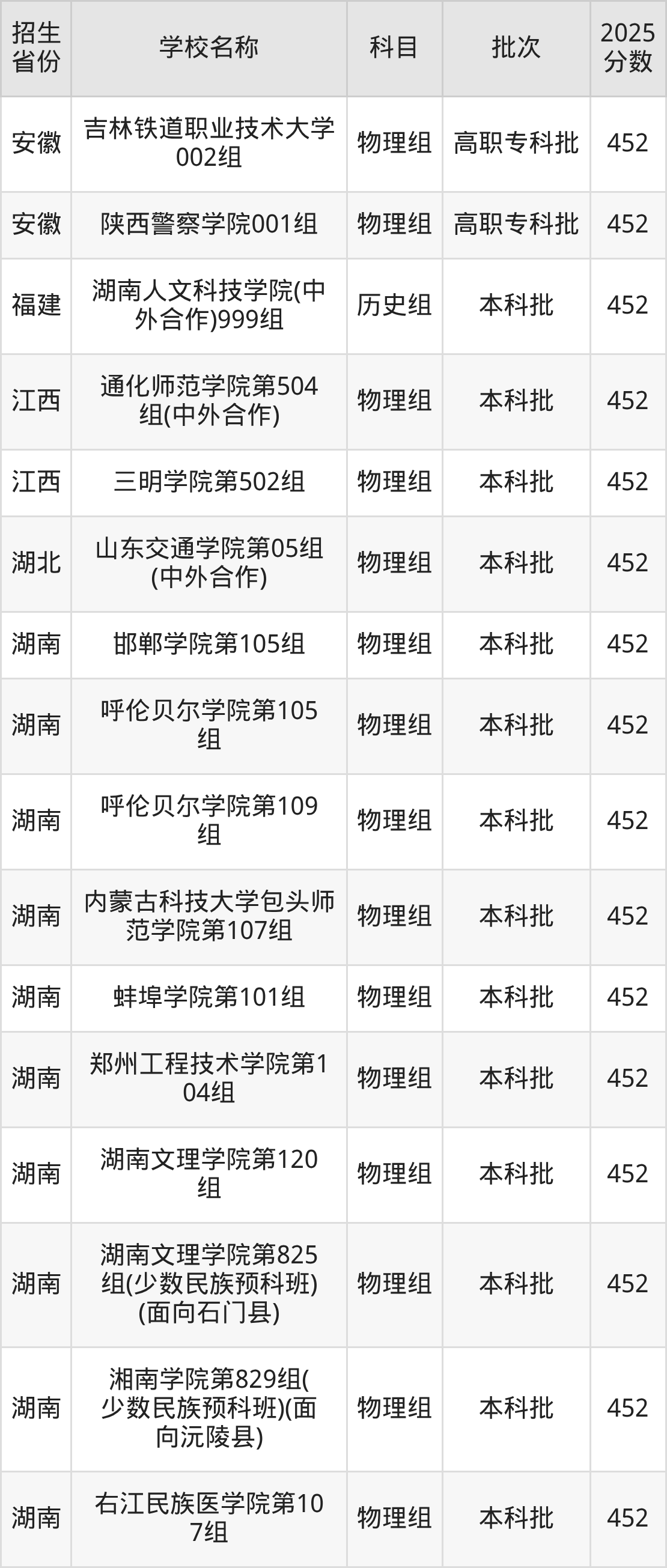 湖南省物理组分数线是452分的二本公办大学有:邯郸学院、呼伦贝尔学院、内蒙古科技大学包头师范学院、蚌埠学院、郑州工程技术学院、湖南文理学院、湘南学院、右江民族医学院、广西科技师范学院、衡阳师范学院。