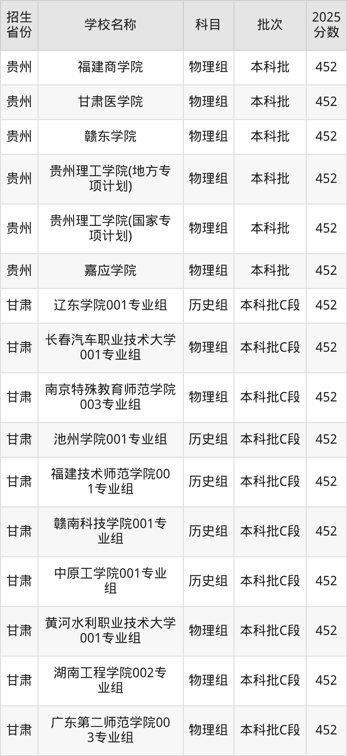 贵州省物理组分数线是452分的二本公办大学有:郑州工程技术学院、福建商学院、甘肃医学院、赣东学院、贵州理工学院(地方专项计划)、贵州理工学院(国家专项计划)、嘉应学院。