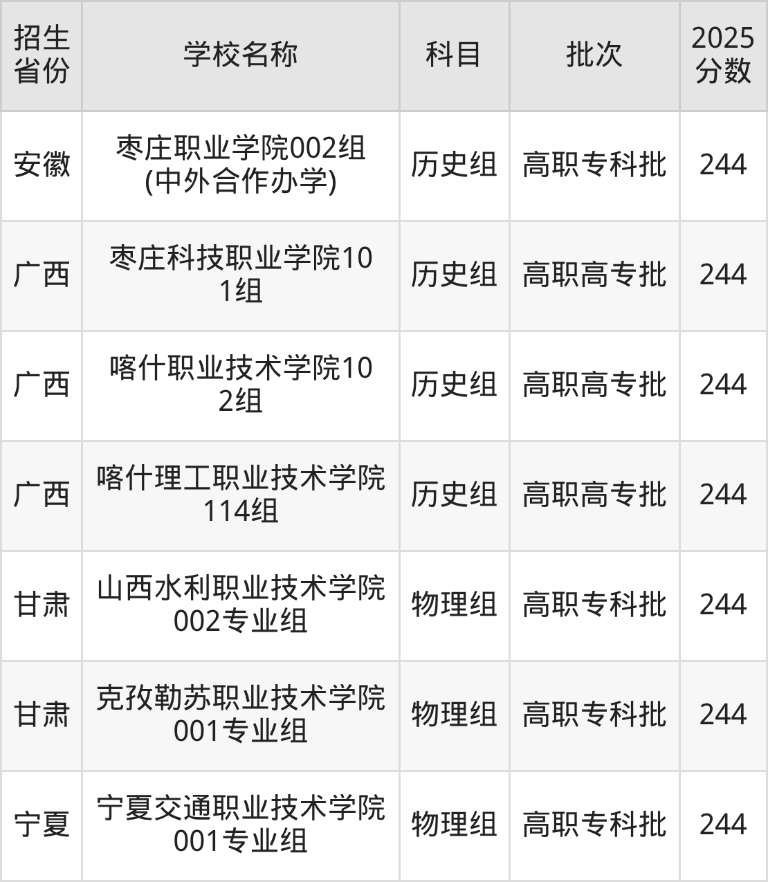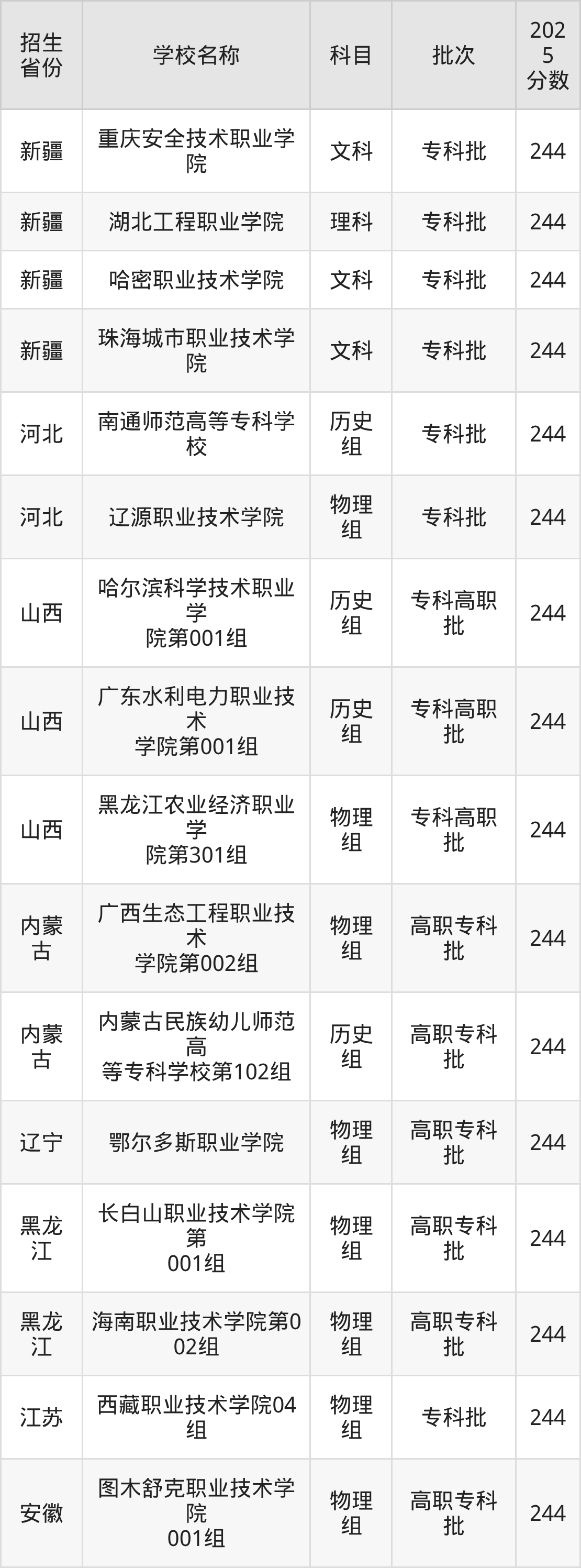 筛选全国各省2025年录取分数线为244分的公办专科大学如下: