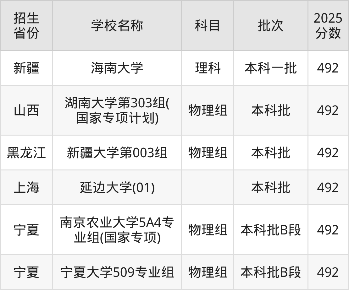 筛选全国各省2025年录取分数线为492分的211大学如下:
